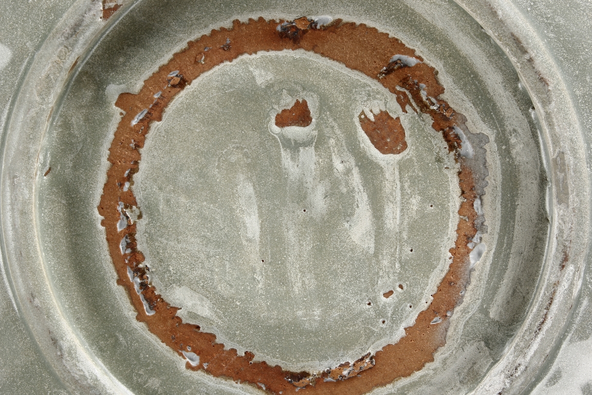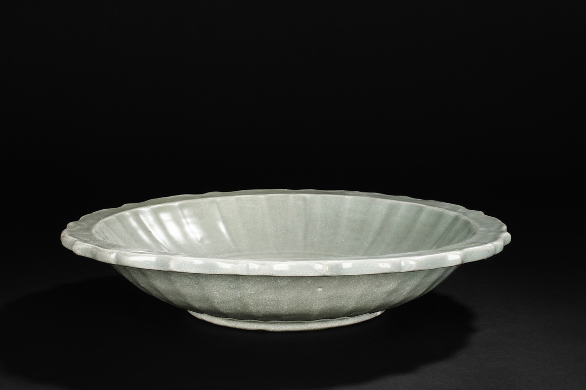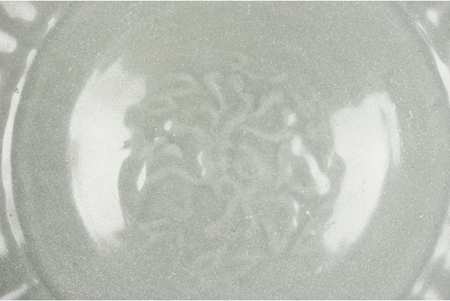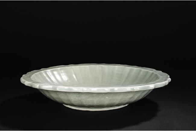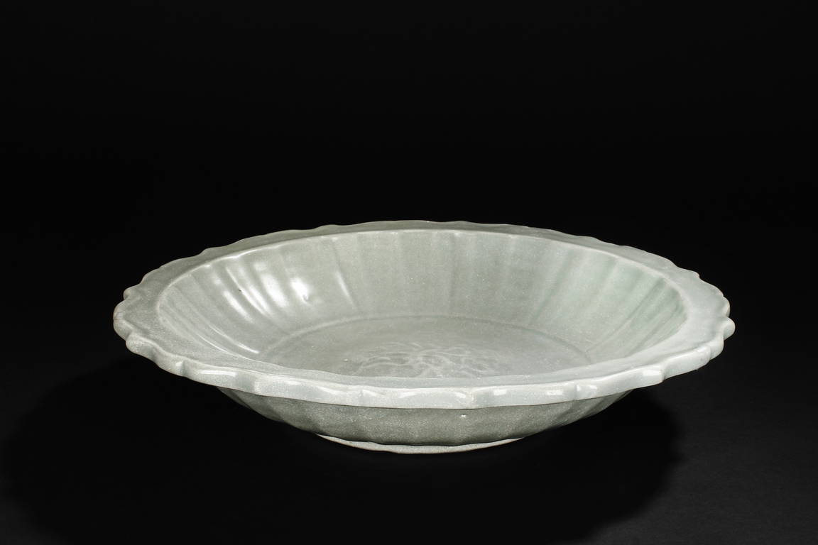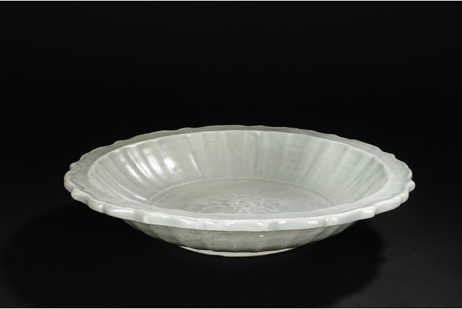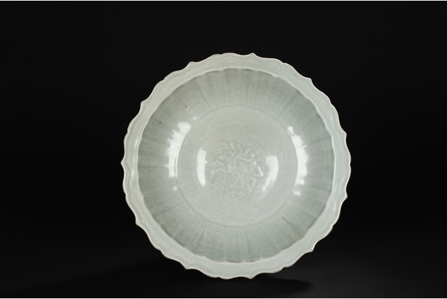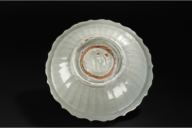 Of foliate rim design, extending to the interior with concave edges, the interior lightly impressed with flower and vine patterns, the color of celadon glaze. Bottom with a ring of burn marks. Qing dynasty period.