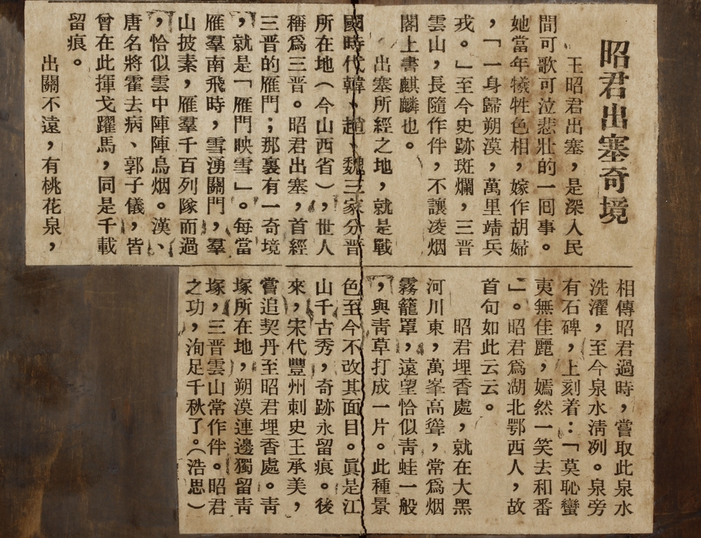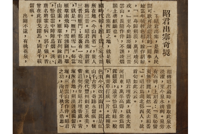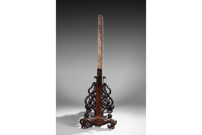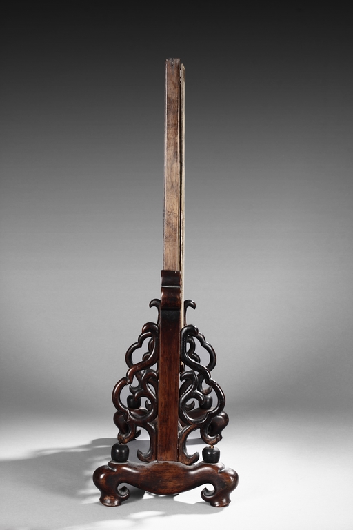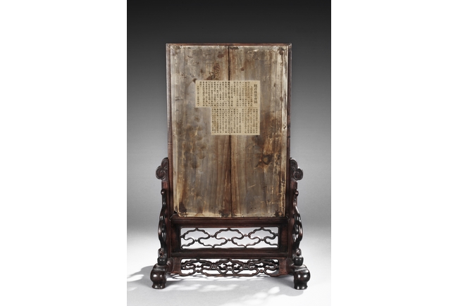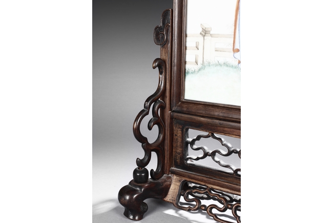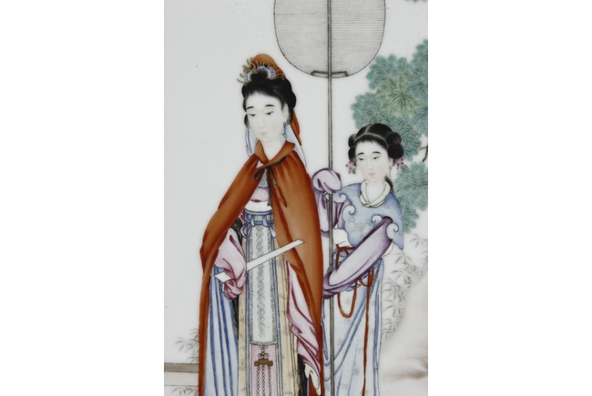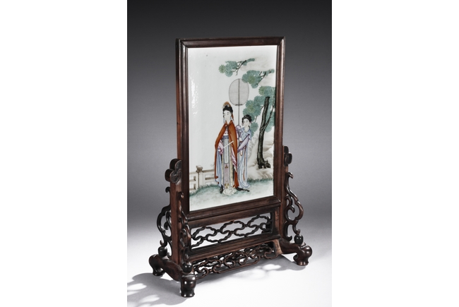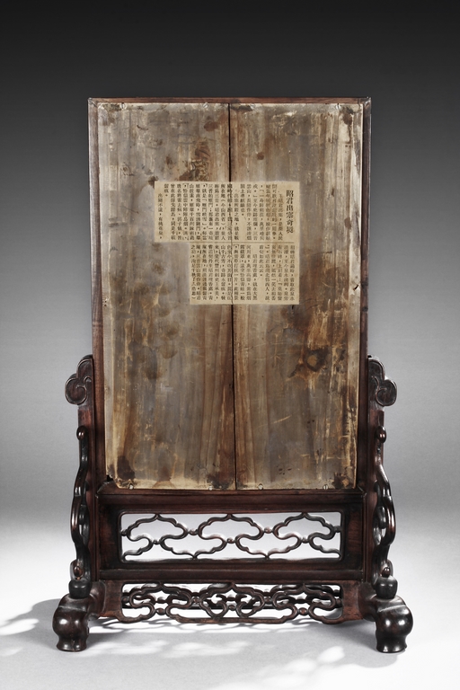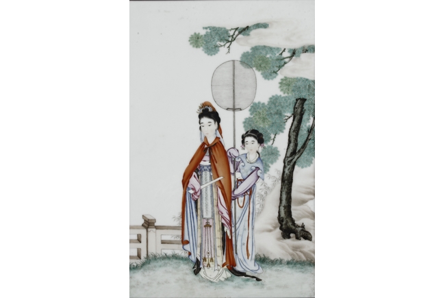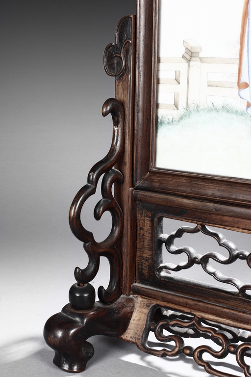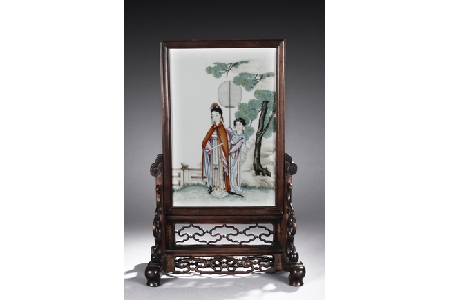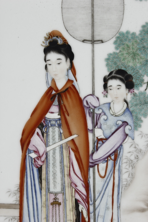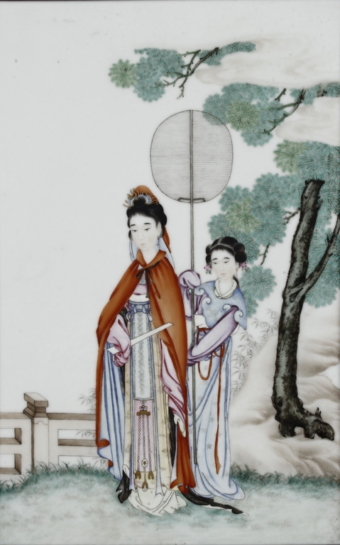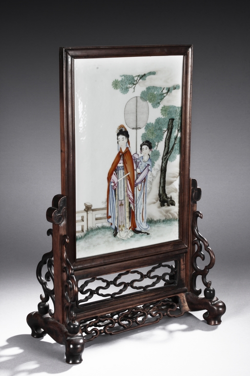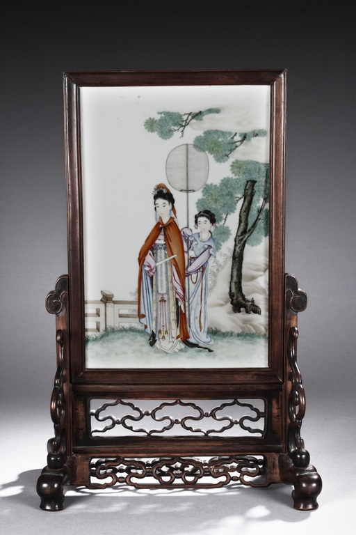 Of rectangular form, the famille rose plaque depicts a well-dressed beauty standing in a garden setting with a female attendant, both with sad expressions emphasized by their downcast eyes, flat eyebrows, and sealed lips. The back describes the story of beauty Wang Zhaojun's journey to the political marriage to Xiongnu Chanyu. The plaque framed with wood and inset into openwork carved wooden stand, with cloud shapes.