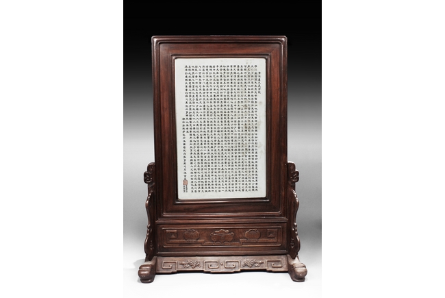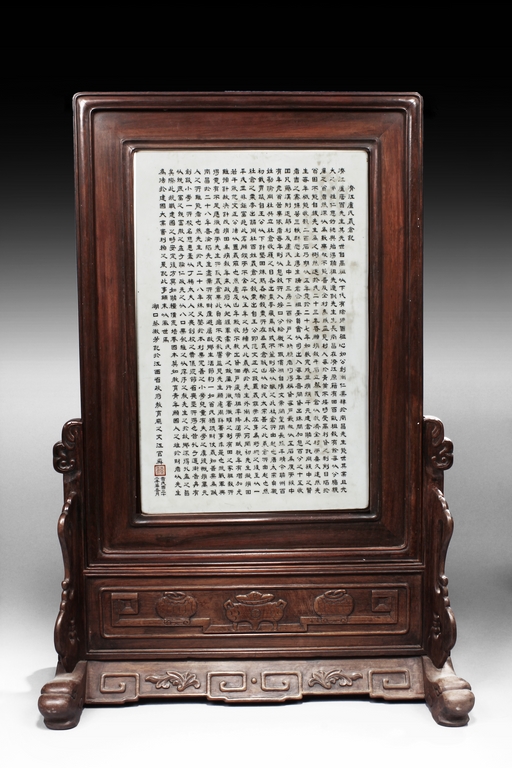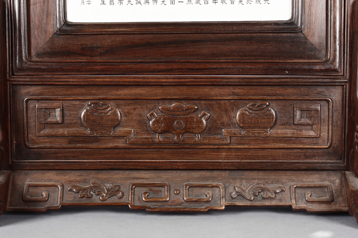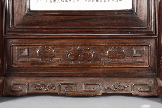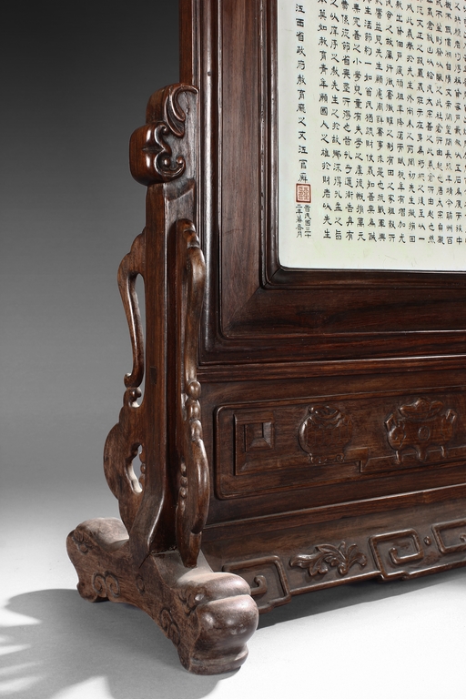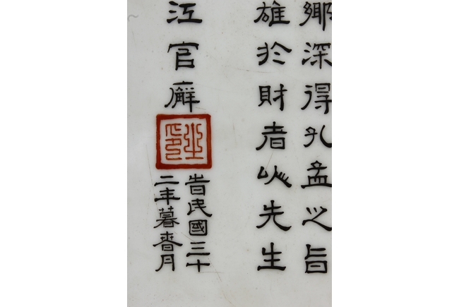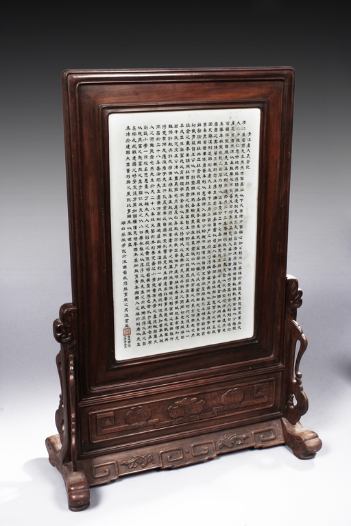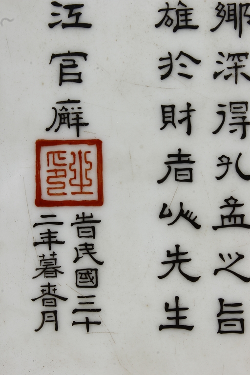 The porcelain plaque written in Chinese, records a charitable story, by Jiangxi Province Government Education Department, dated Republic Year 32, or 1943. The wooden stand lightly carved with auspicious items at bottom. Republic period.