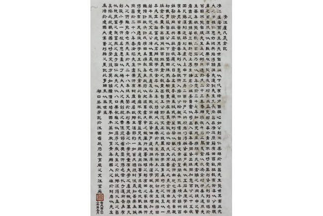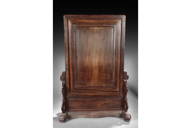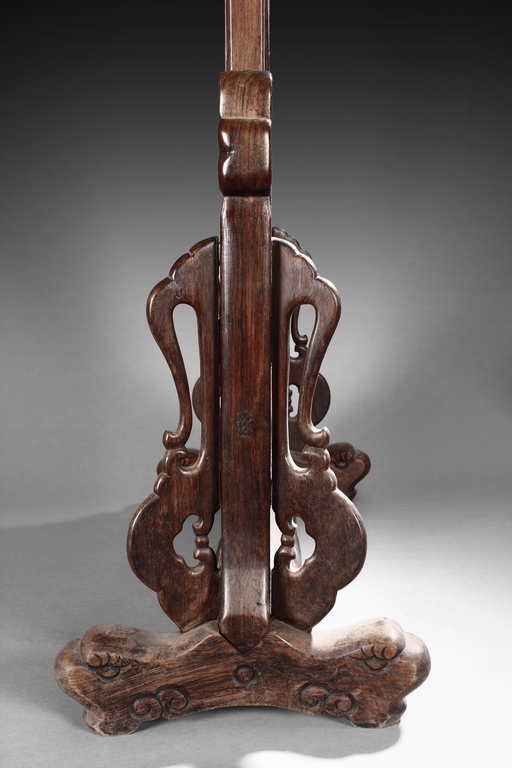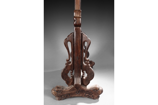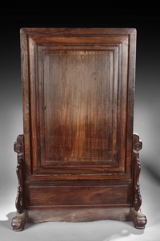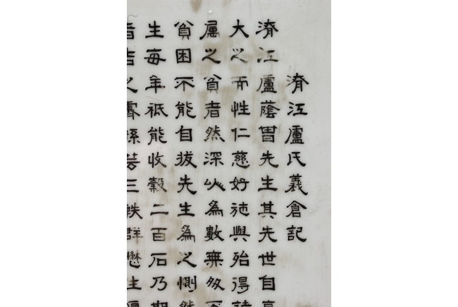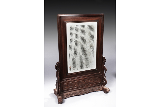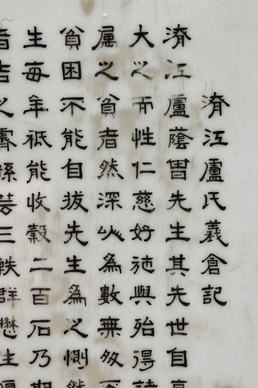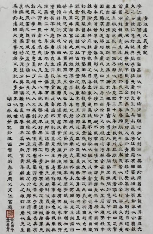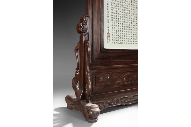 The porcelain plaque written in Chinese, records a charitable story, by Jiangxi Province Government Education Department, dated Republic Year 32, or 1943. The wooden stand lightly carved with auspicious items at bottom. Republic period.