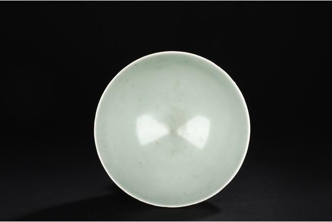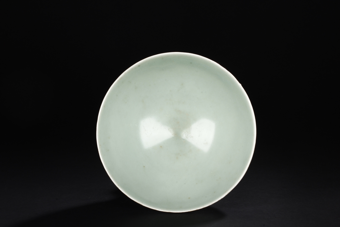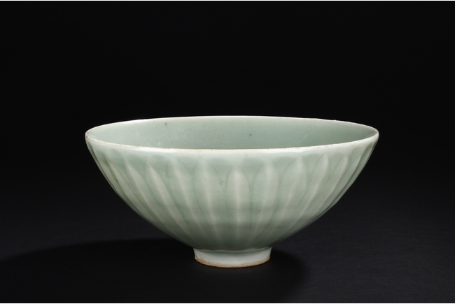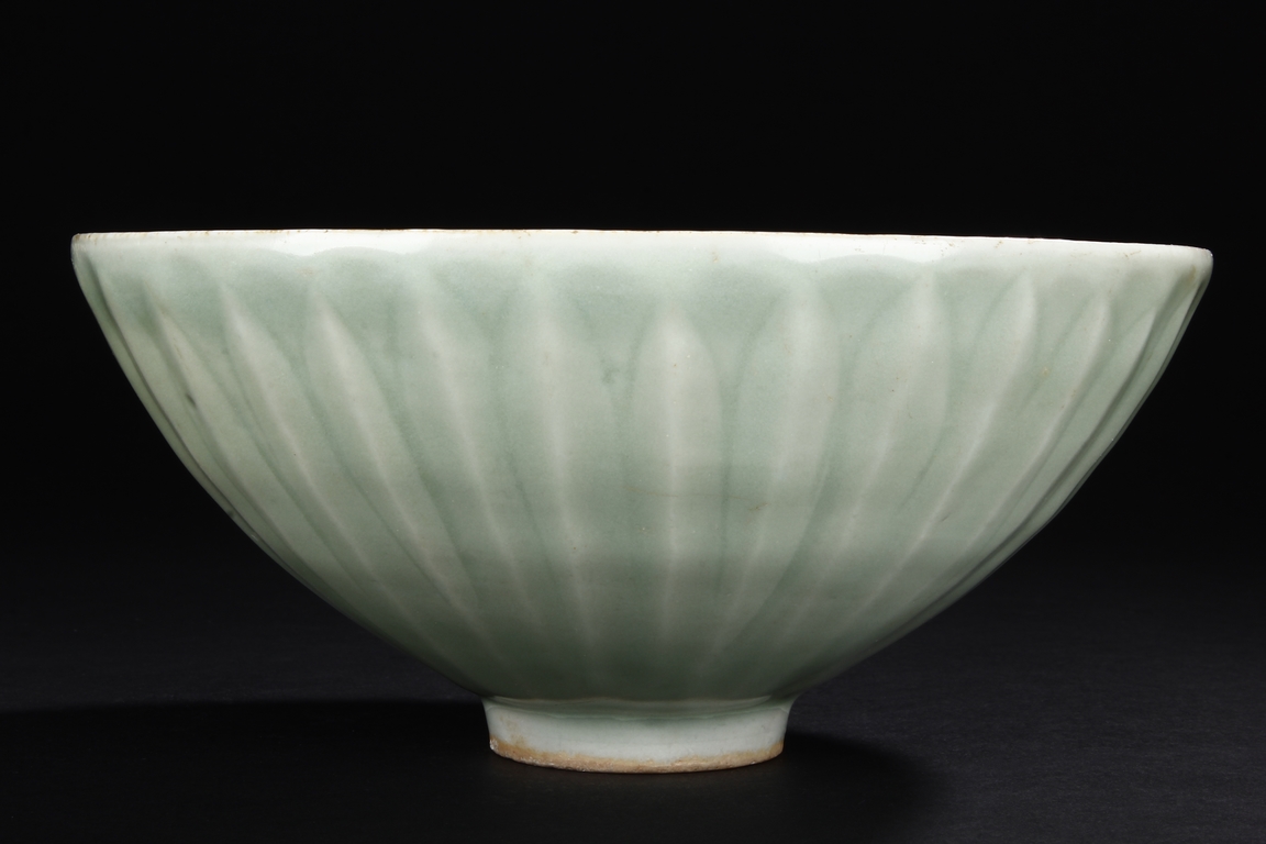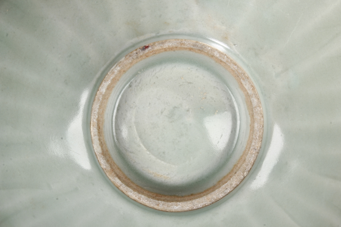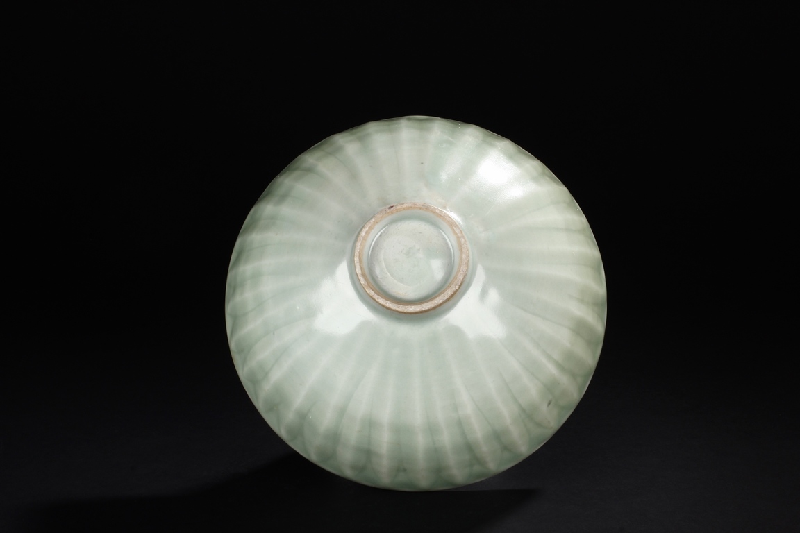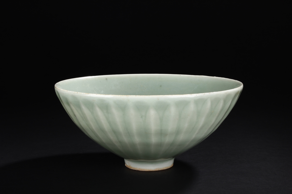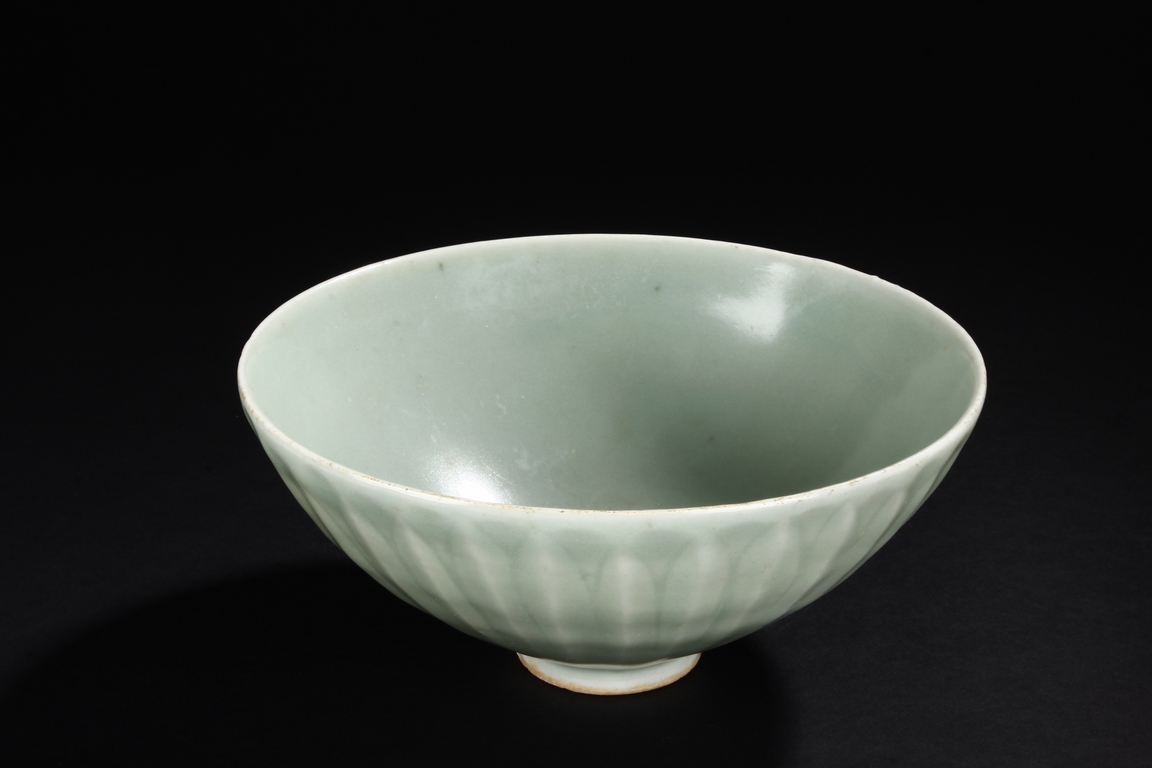 The bowl tapers sharply to a small ring foot, the exterior impressed with lotus flower petals, the overall bowl glazed in celadon. Southern Song Dynasty period.