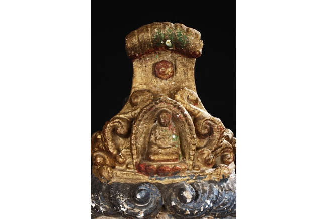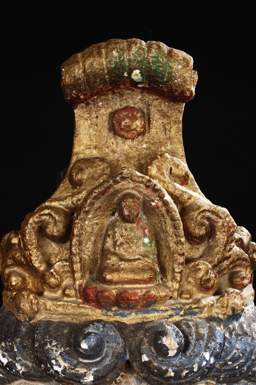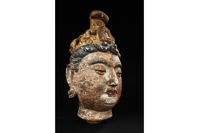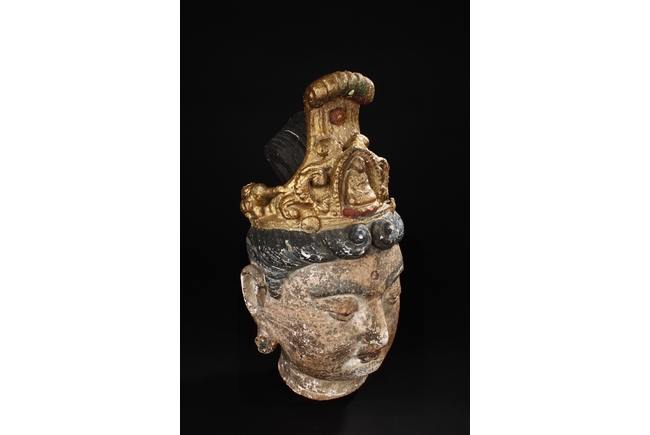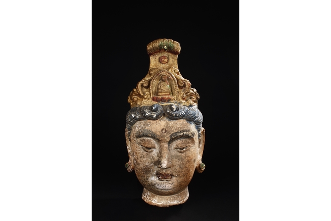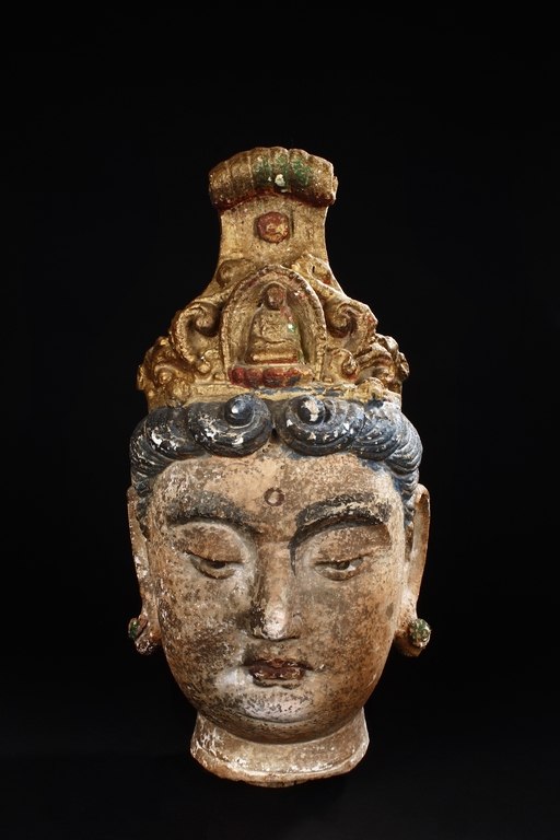 The wooden Bodhisattva head statue was delicately carved and painted, showing detailed facial expressions, ornaments, and hair, with visible loss of paint. Tang/Song Dynasty period.