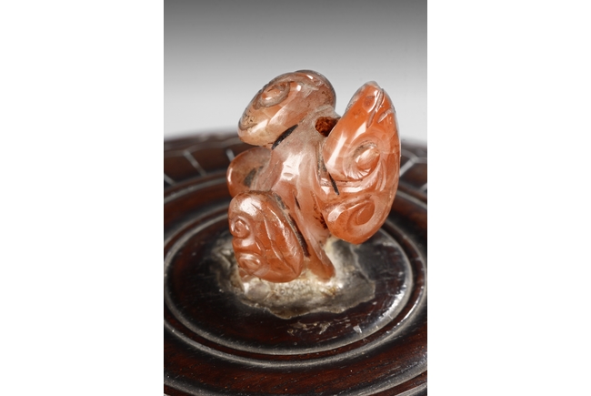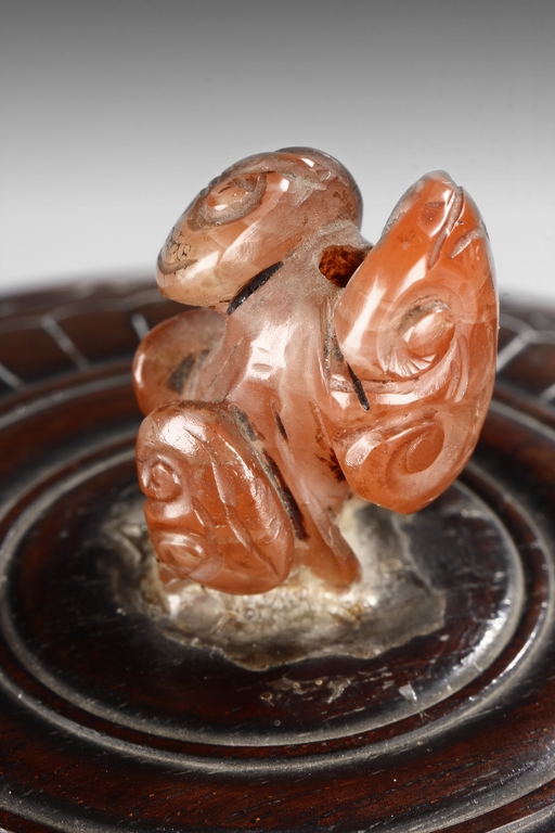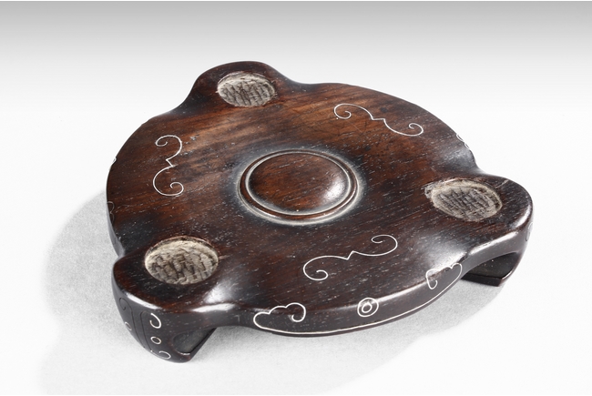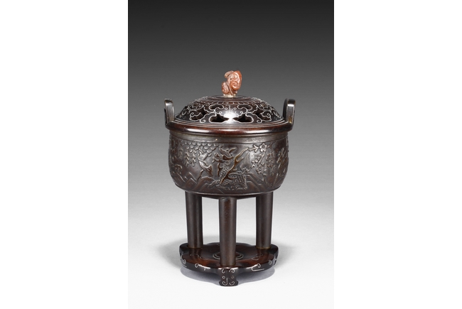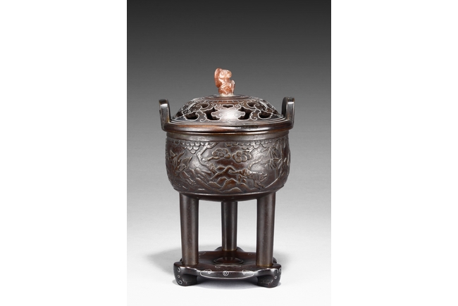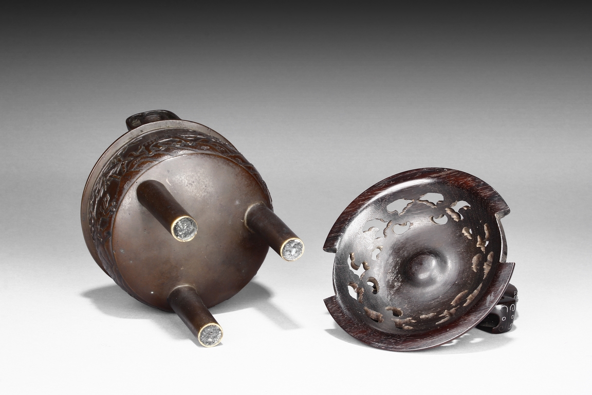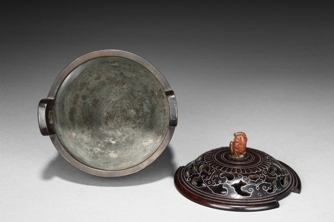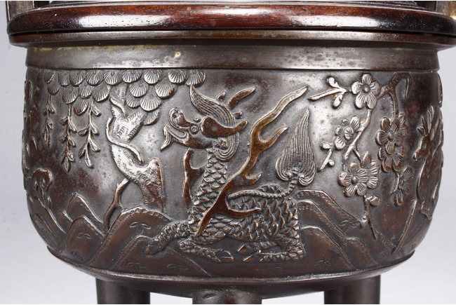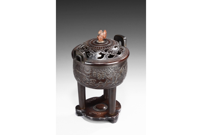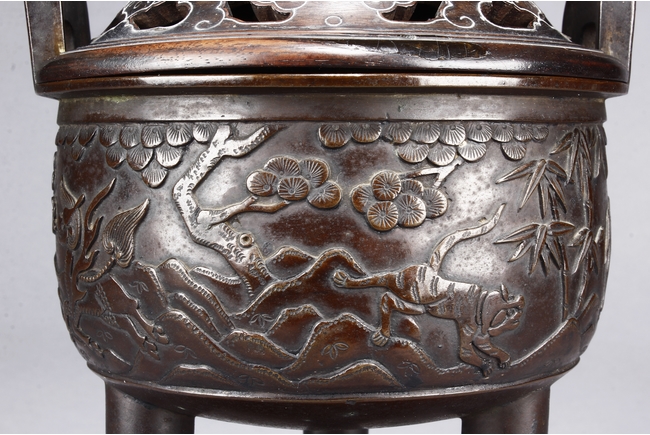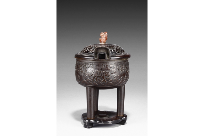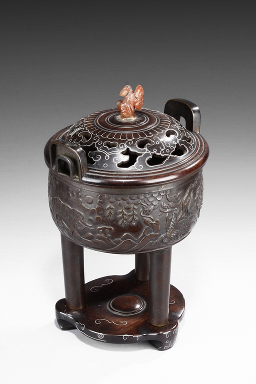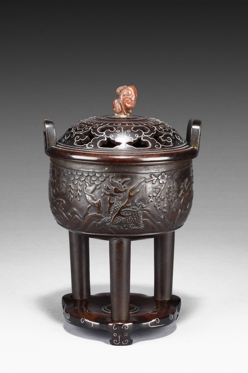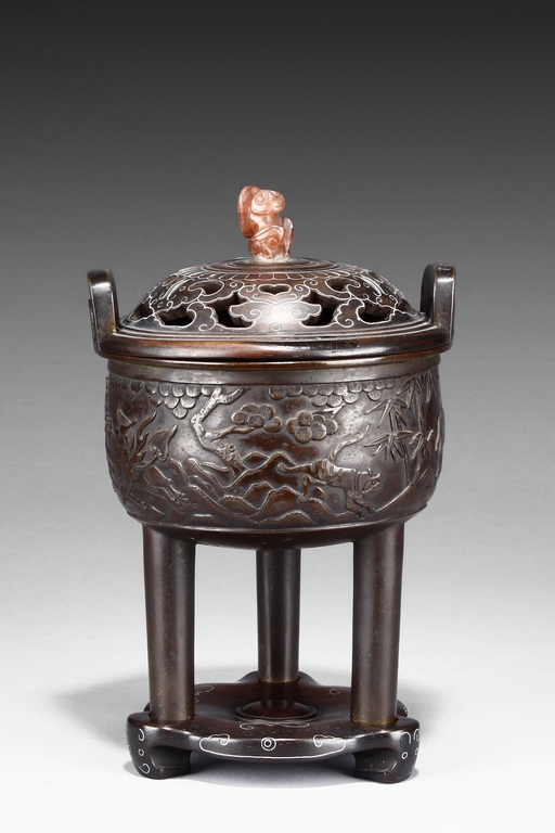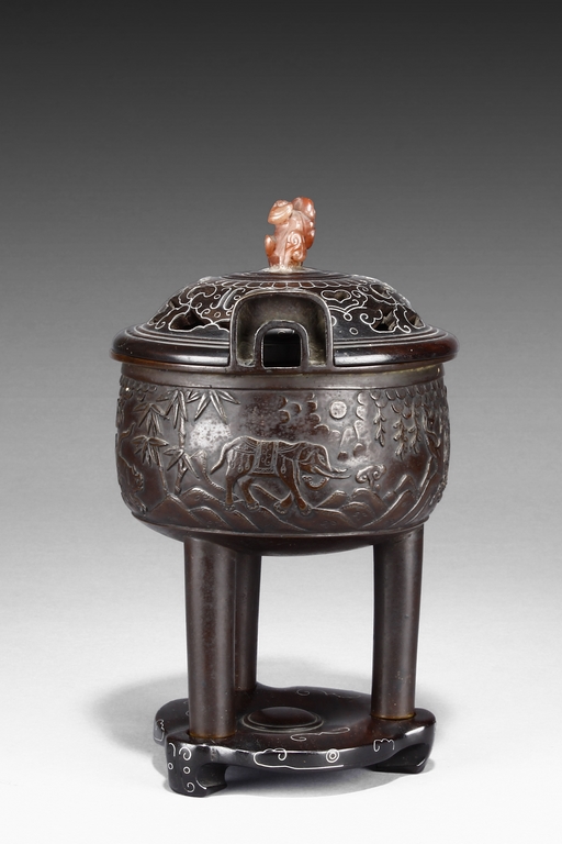 supported on three tall cylindrical feet and surmounted with two handles, the sides are cast in relief with a continuous scenes of elephant, tiger, and qilin in mountains and trees setting. The wood cover is topped with an lingzhi-shaped agate finial.