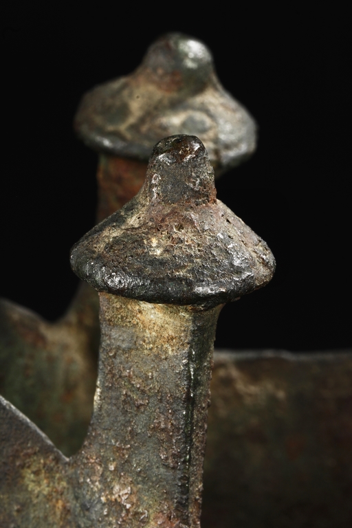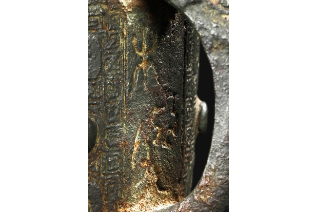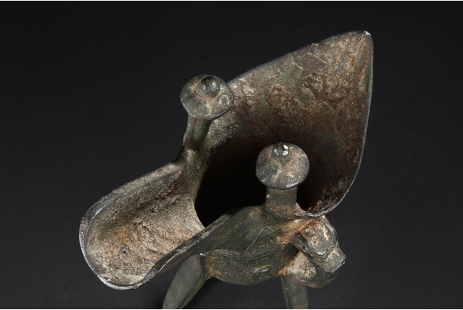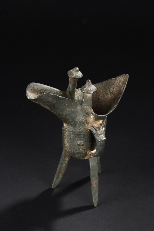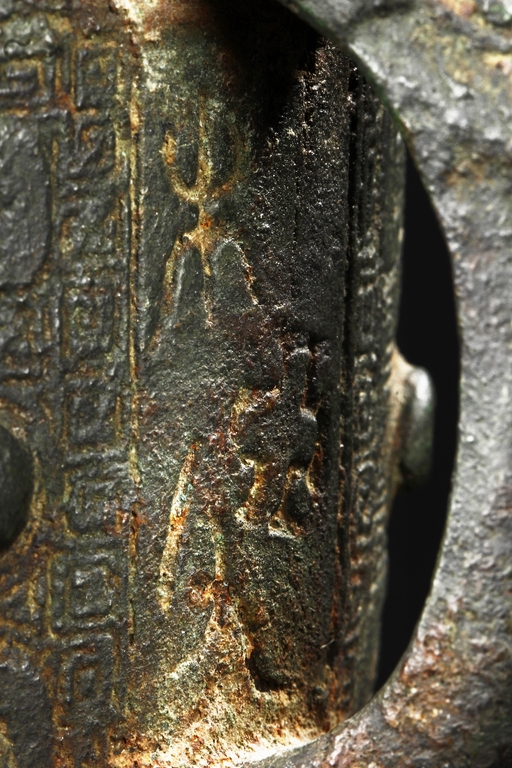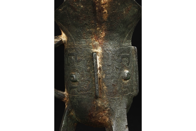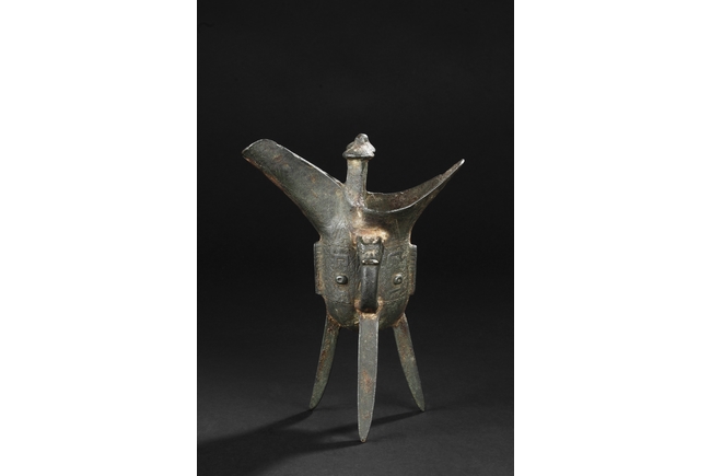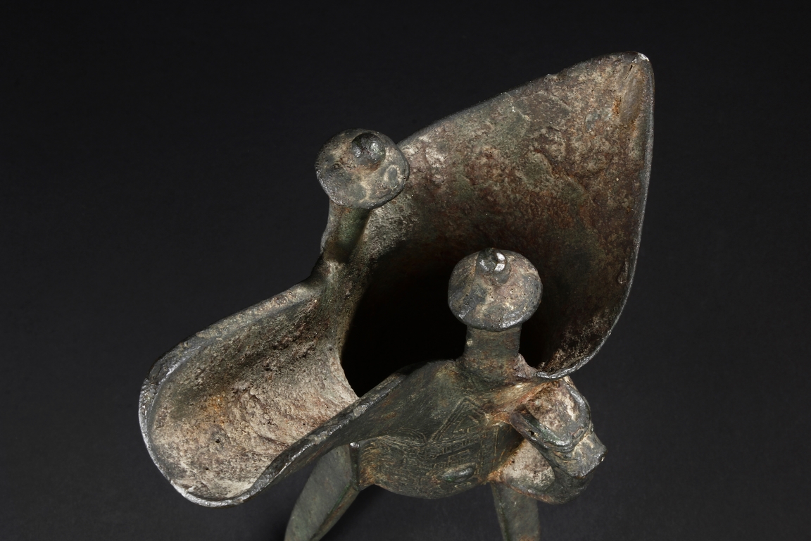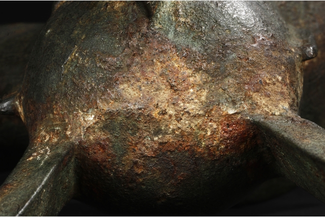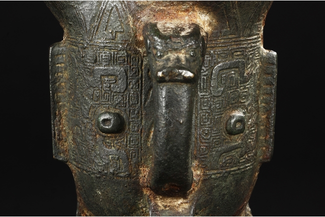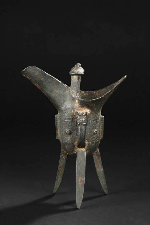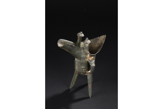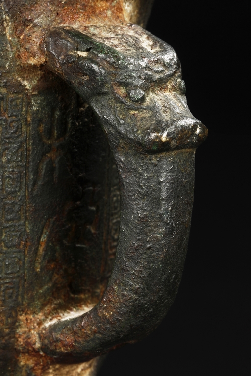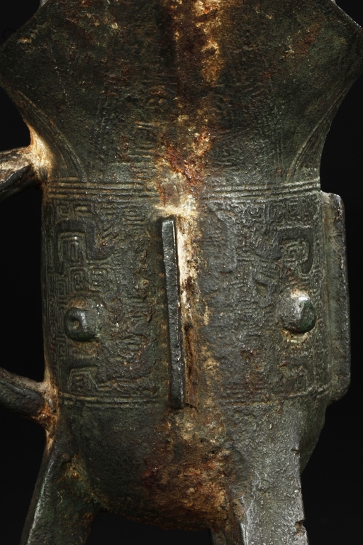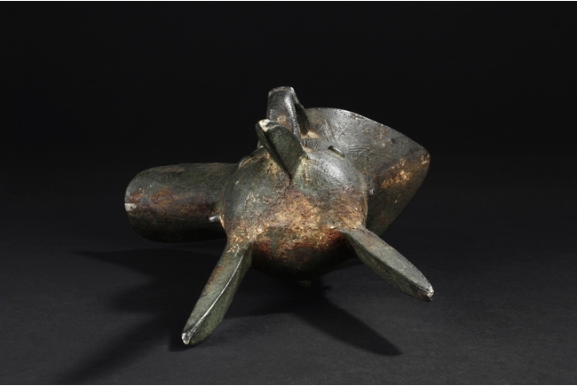 Raised on three blade-shaped supports the deep body is cast with two taotie masks separated by narrow flanges and reserved on a leiwen band. Two posts with rounded caps rise from the rim. Ming Dynasty period, in imitation of archaic bronze.