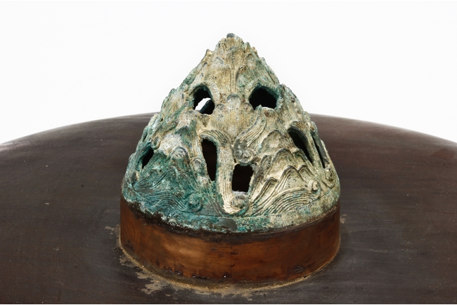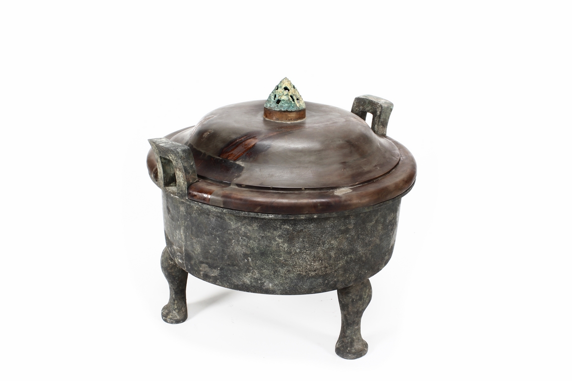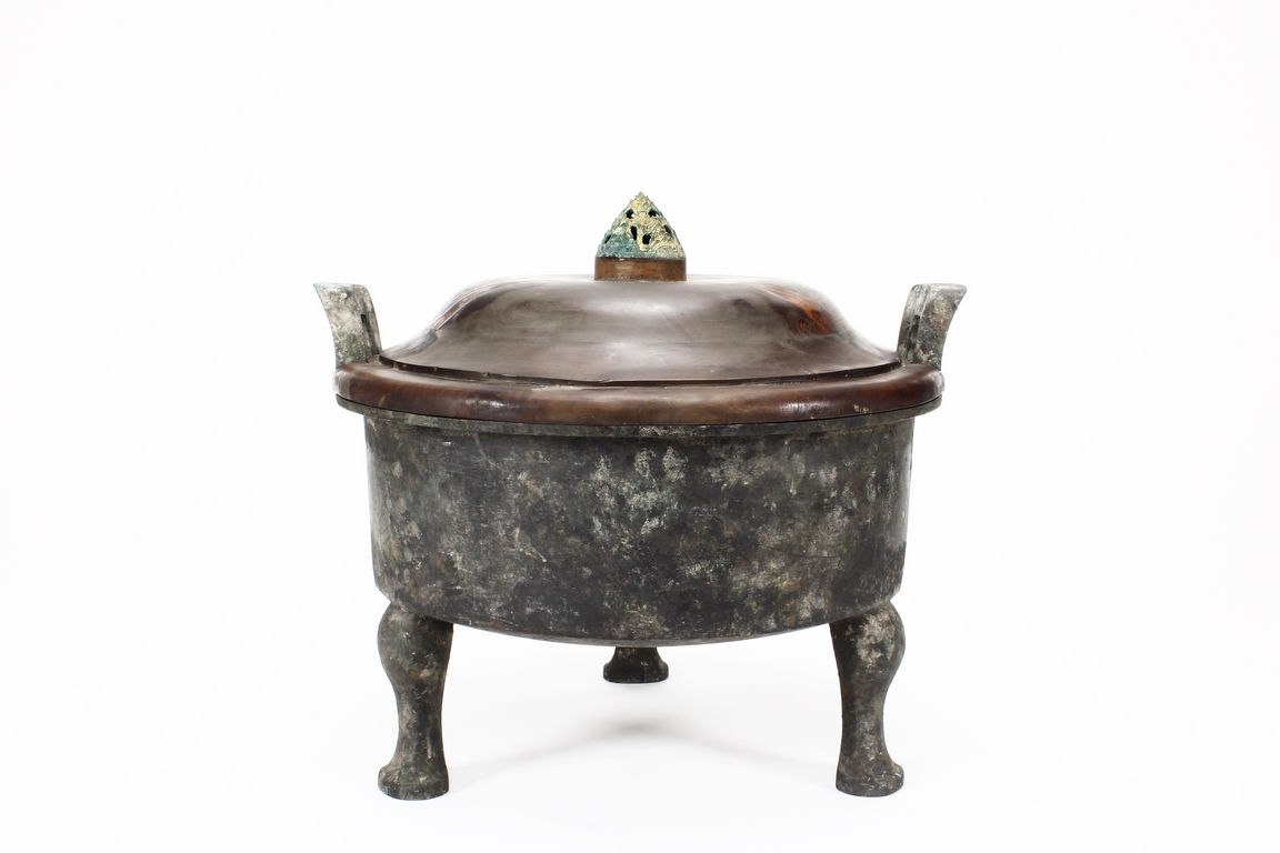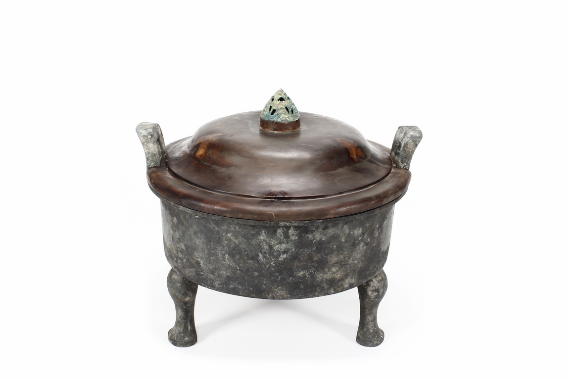 The large compressed columnar body is raised on three slender legs, two upright handles raised above the sides, casted with delicate patterns, the wooden lid is fitted with an archaic bronze finial with ocean wave patterns, all stands on a wooden stand. West Zhou period.