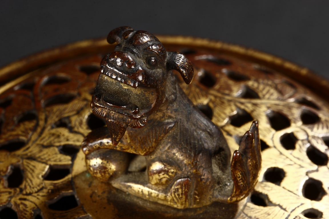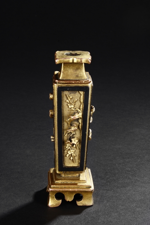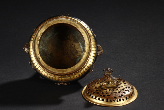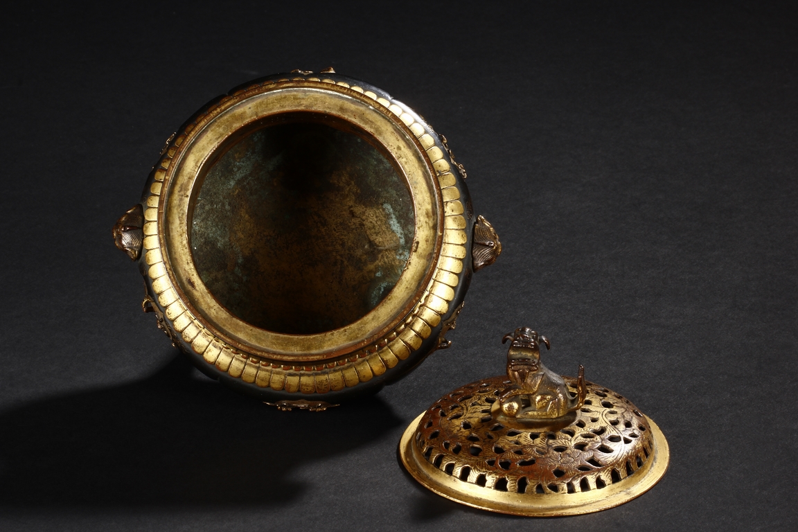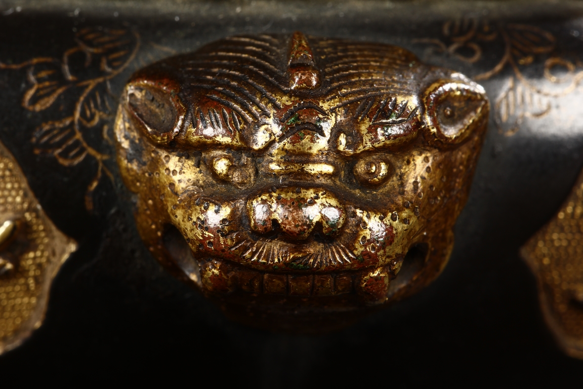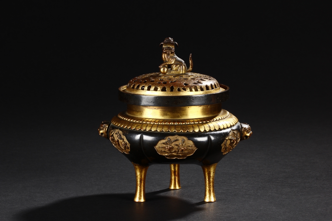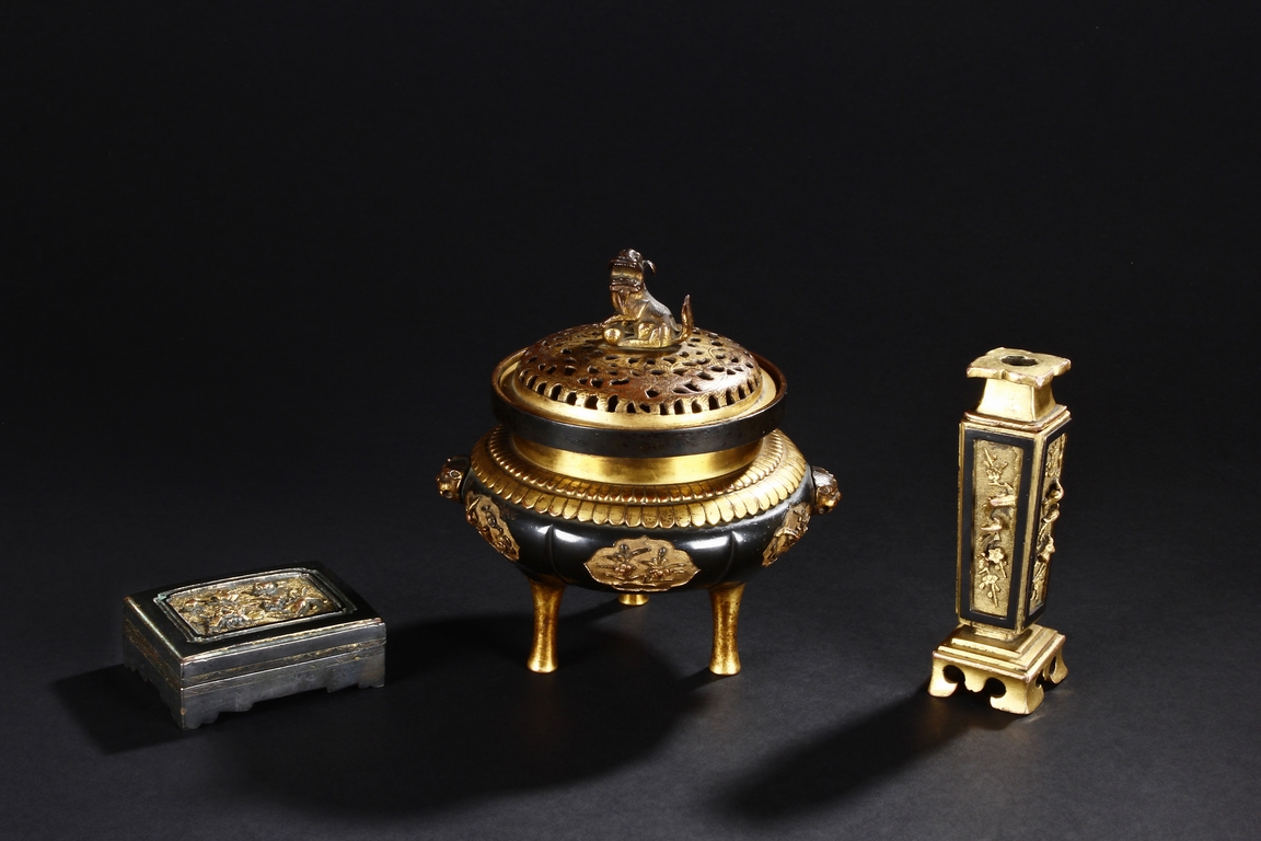 This set comprises of a tripod censer, a rectangular box, and a vase, each mounted with shaped gilt-bronze plaques of elaborate floral decorations in relief. The censer is mounted with two Buddhist lions, and topped with a pierced cover with Buddhist lion finial. Qing Dynasty Qianlong Period.