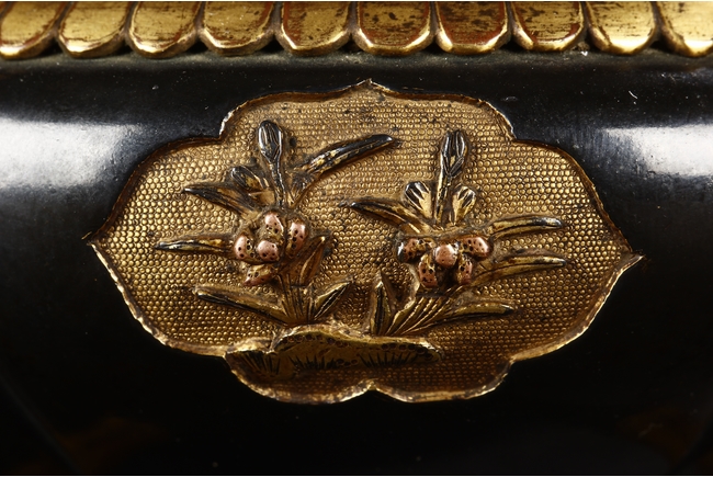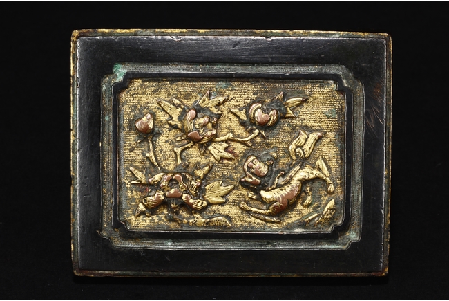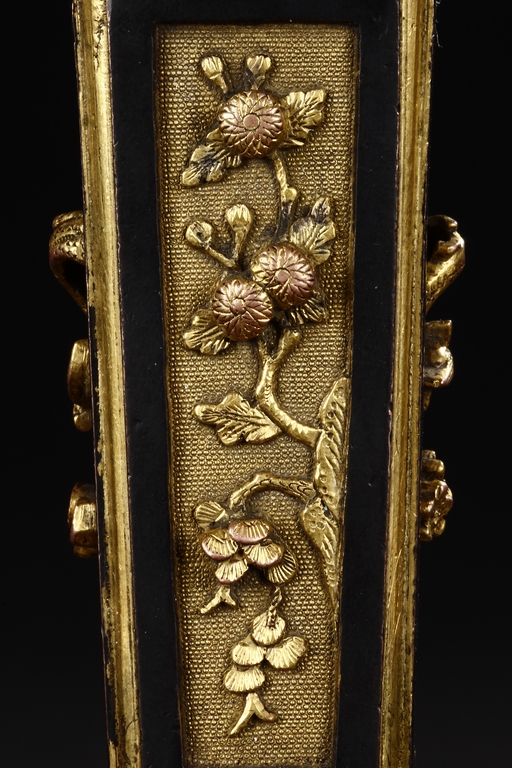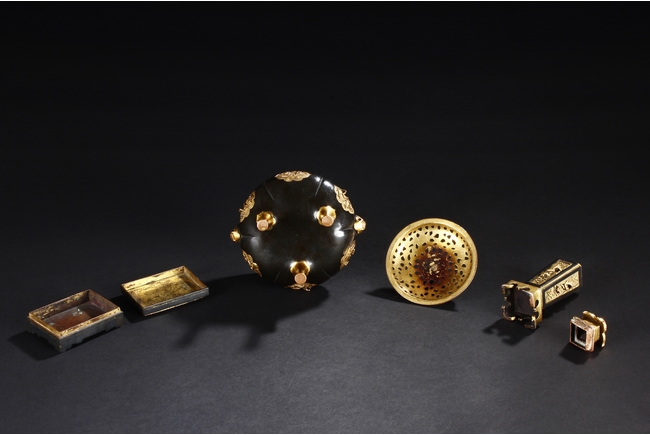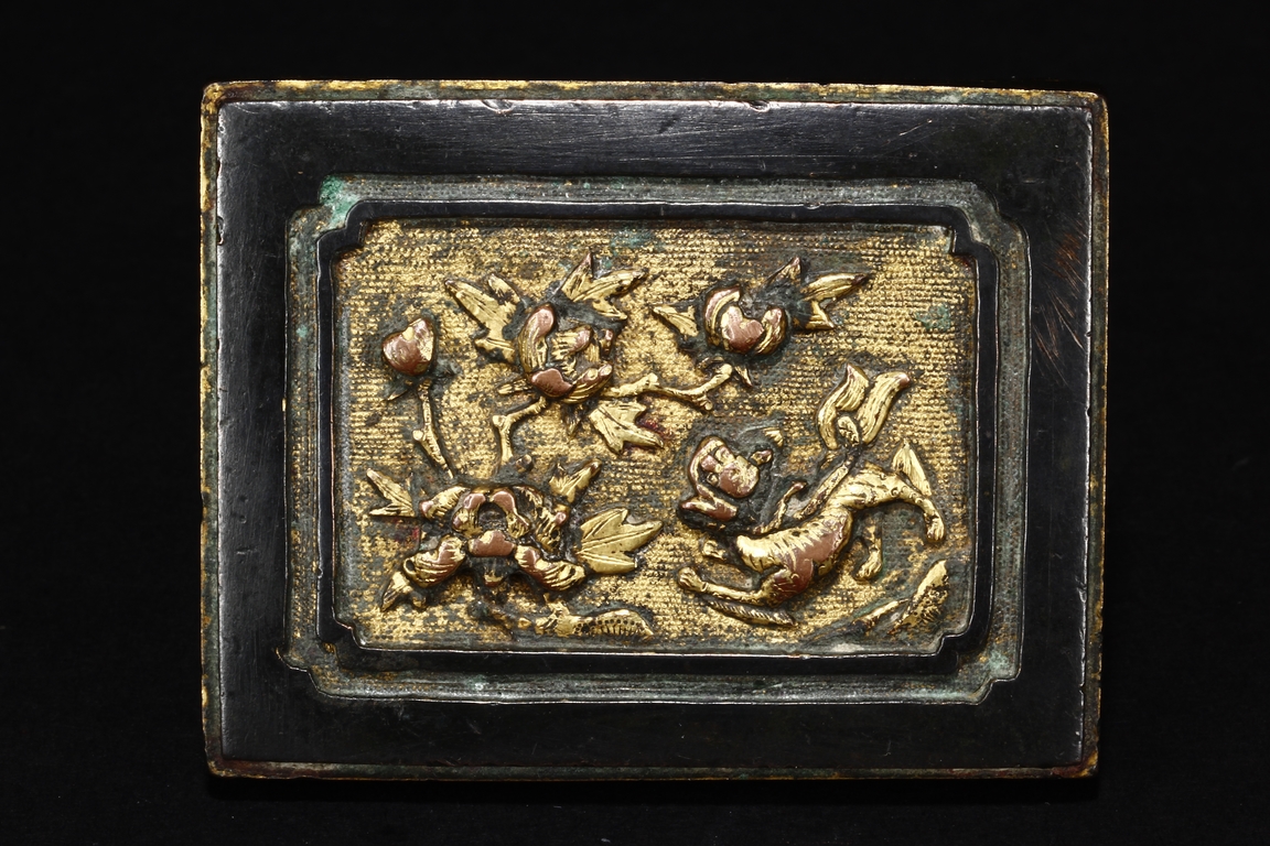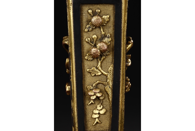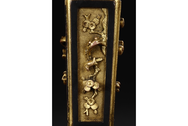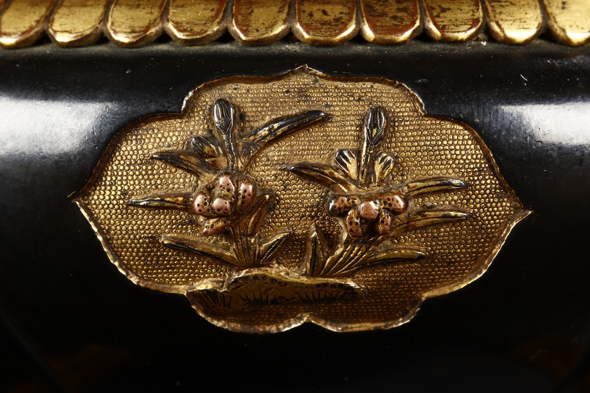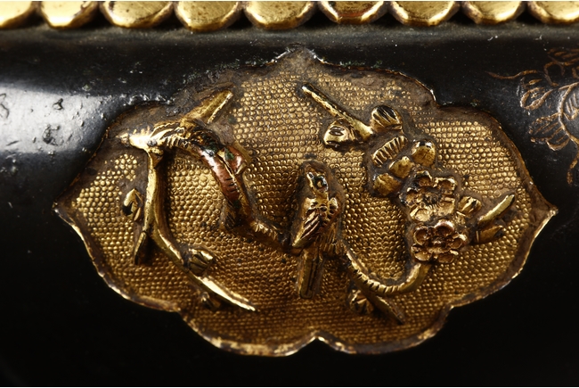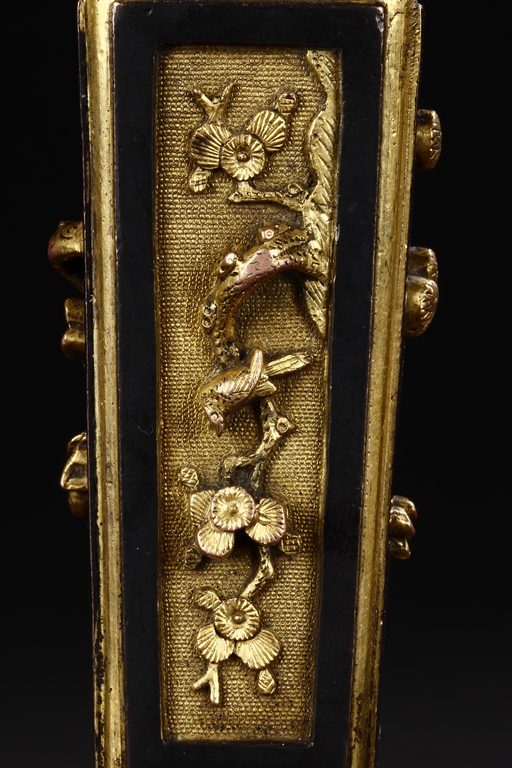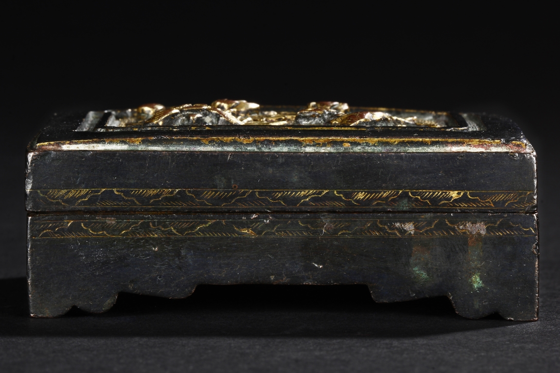This set comprises of a tripod censer, a rectangular box, and a vase, each mounted with shaped gilt-bronze plaques of elaborate floral decorations in relief. The censer is mounted with two Buddhist lions, and topped with a pierced cover with Buddhist lion finial. Qing Dynasty Qianlong Period.
