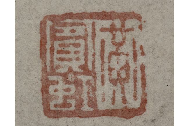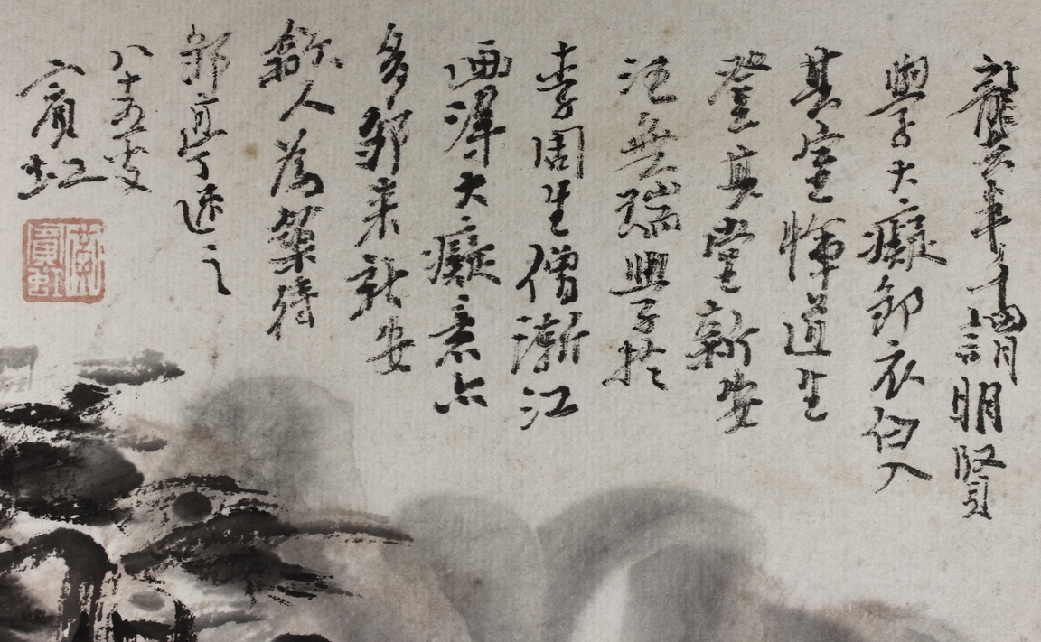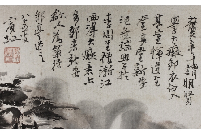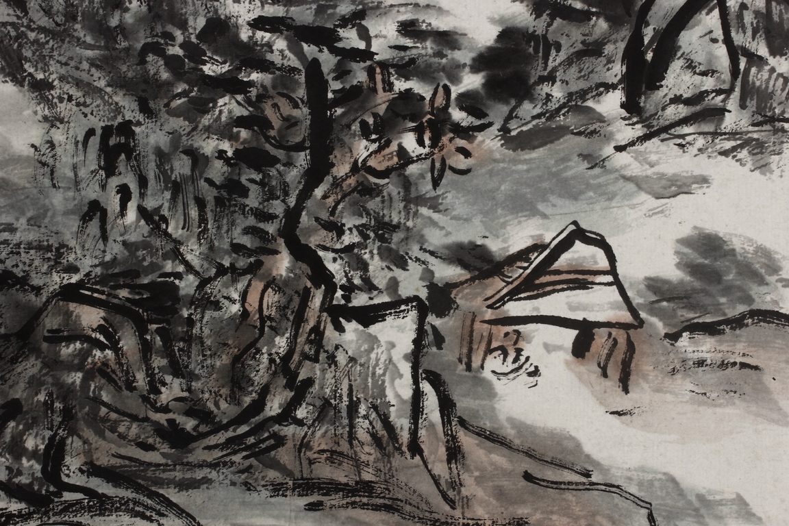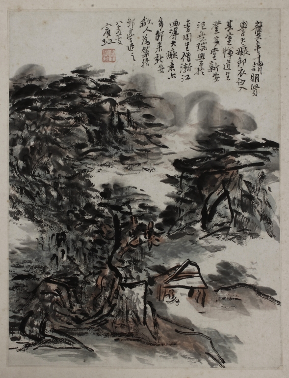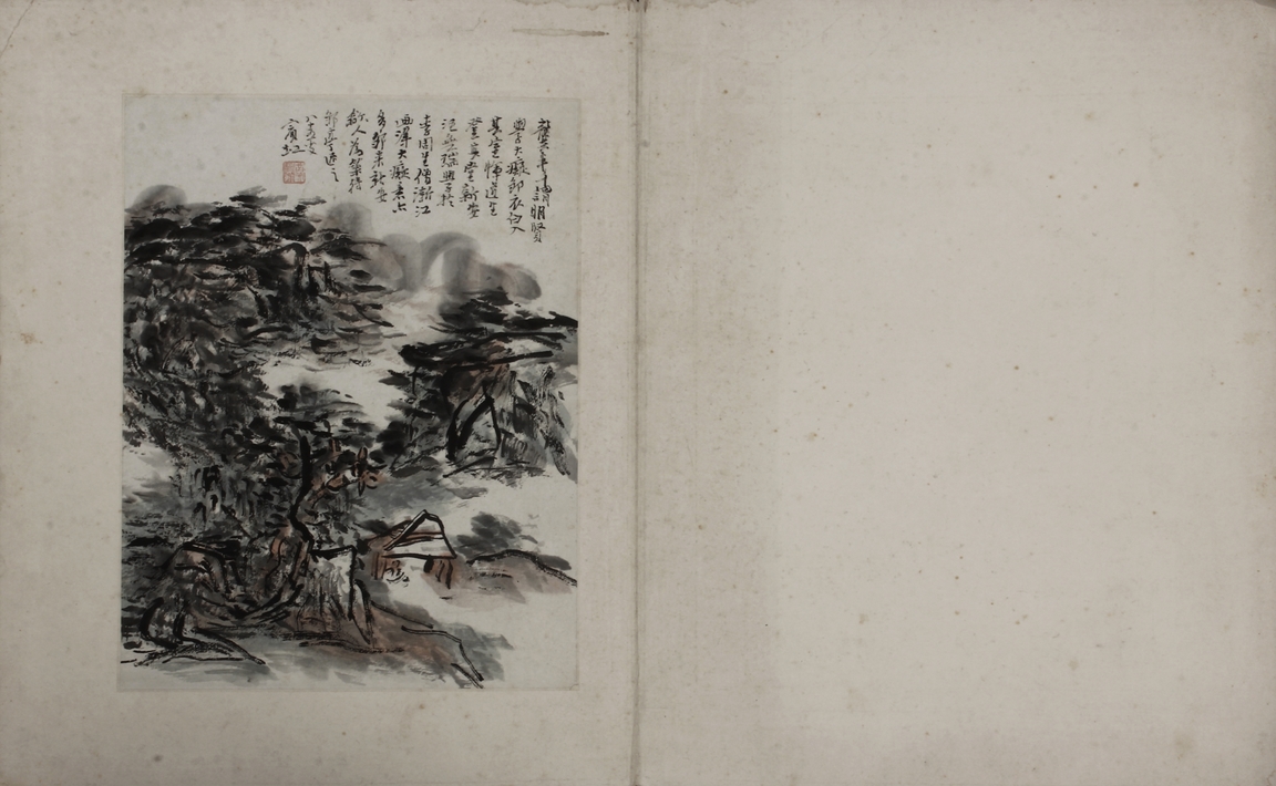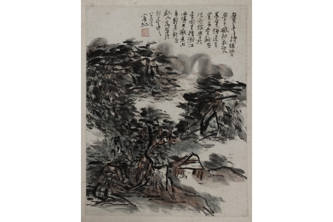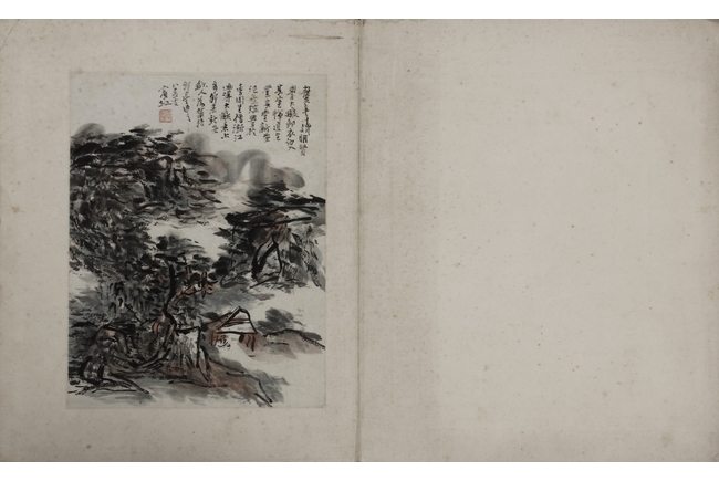 Color and ink on paper, folding page, depicting a landscape painting with mountains, trees, and river, artist colophon, signature, and mark on top, attributed to Huang Binhong.