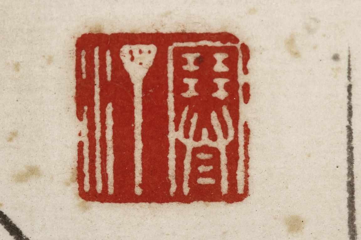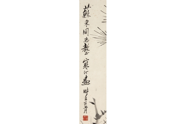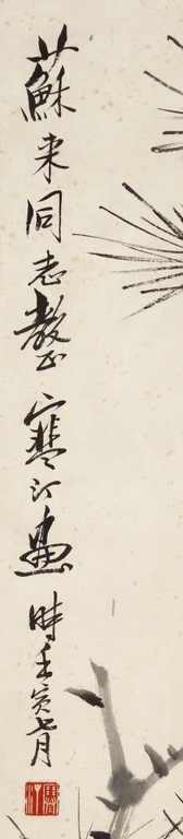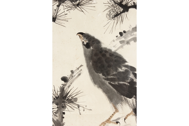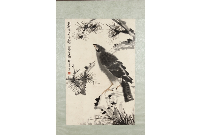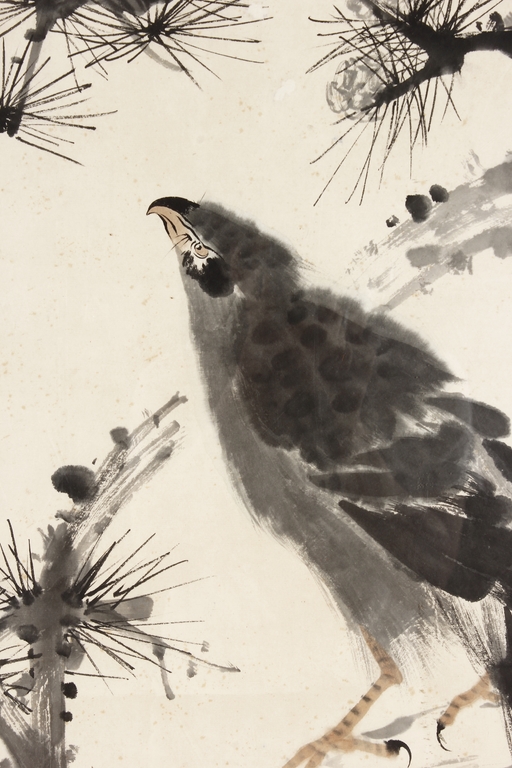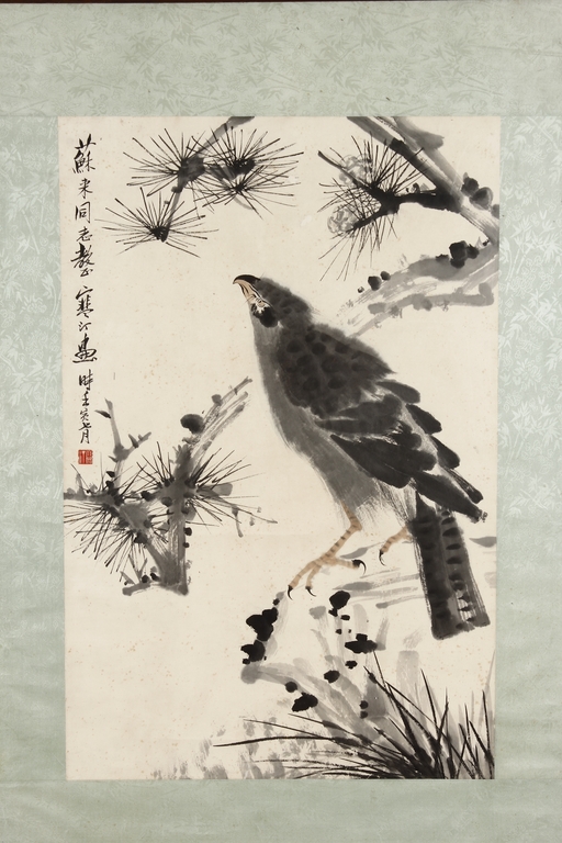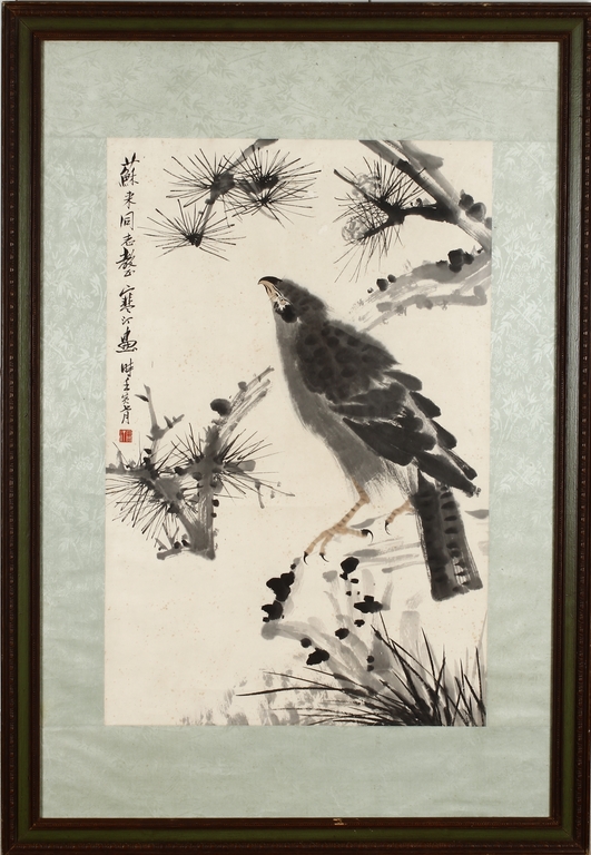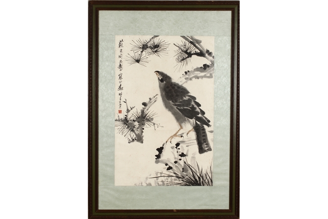 Ink on paper painting, framed. The painting depicts a majestic eagle perched on edge of rocks, beneath pine trees, overlooking upwards. Artist colophon, signature, and stamp "Jiang Hanting" on top left.