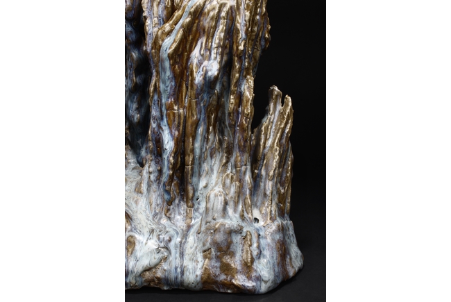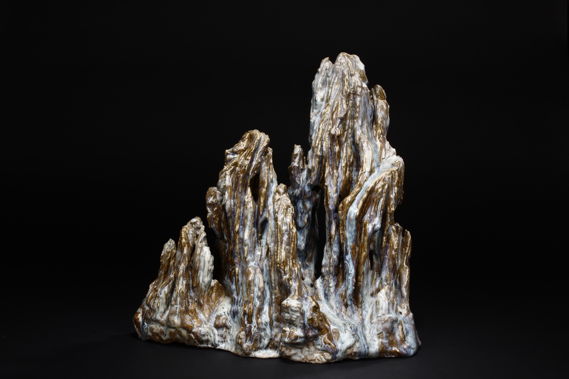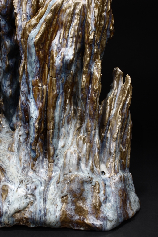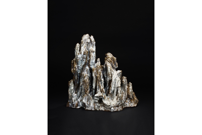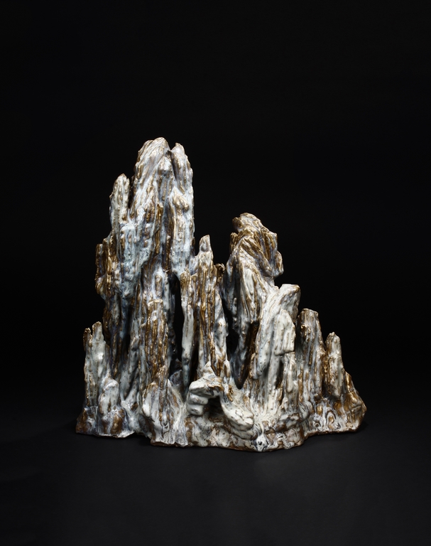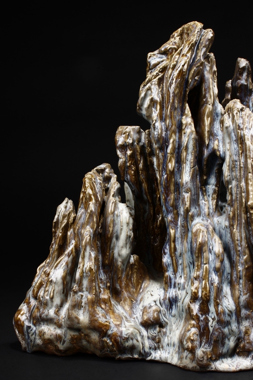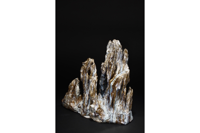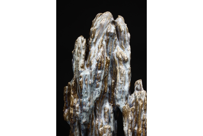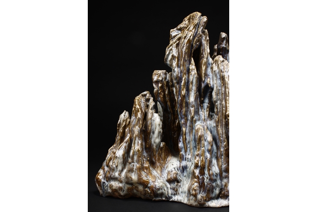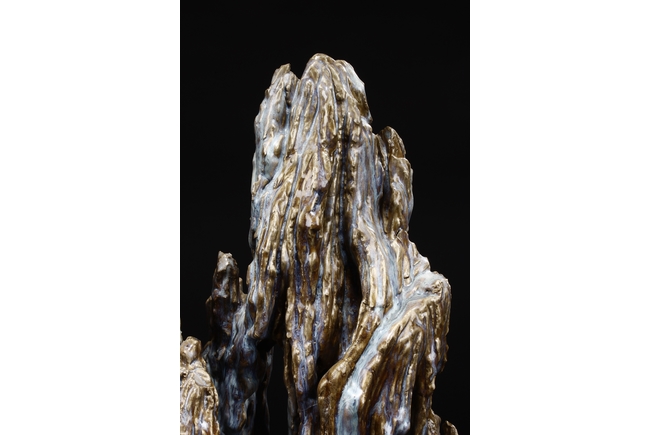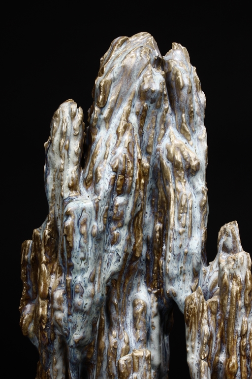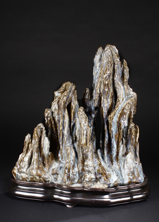 Of mountainous form, the Jun ceramic boulder intricately depicts a tall, steep, and colorful mountain, with blueish white, walnut brown, and blue colors glazed over in intricate fashion. Qing Dynasty period.