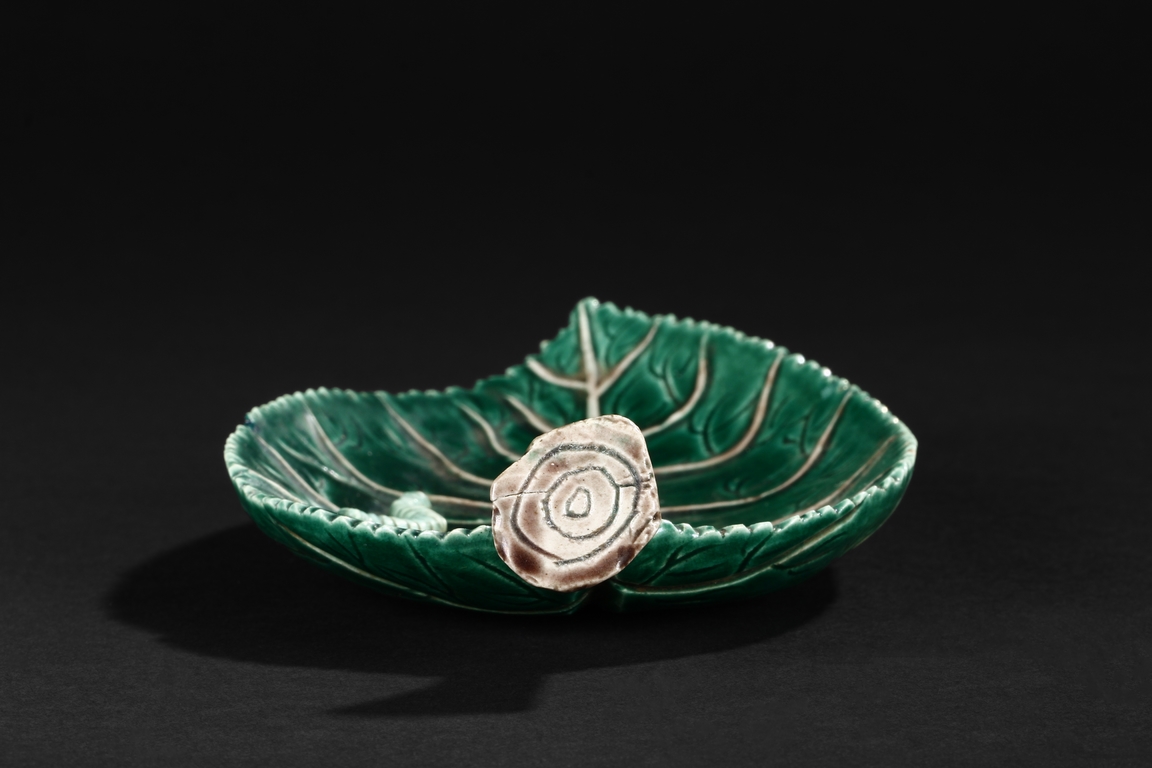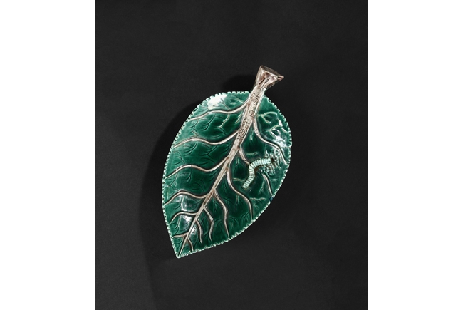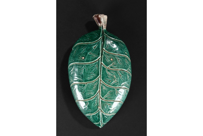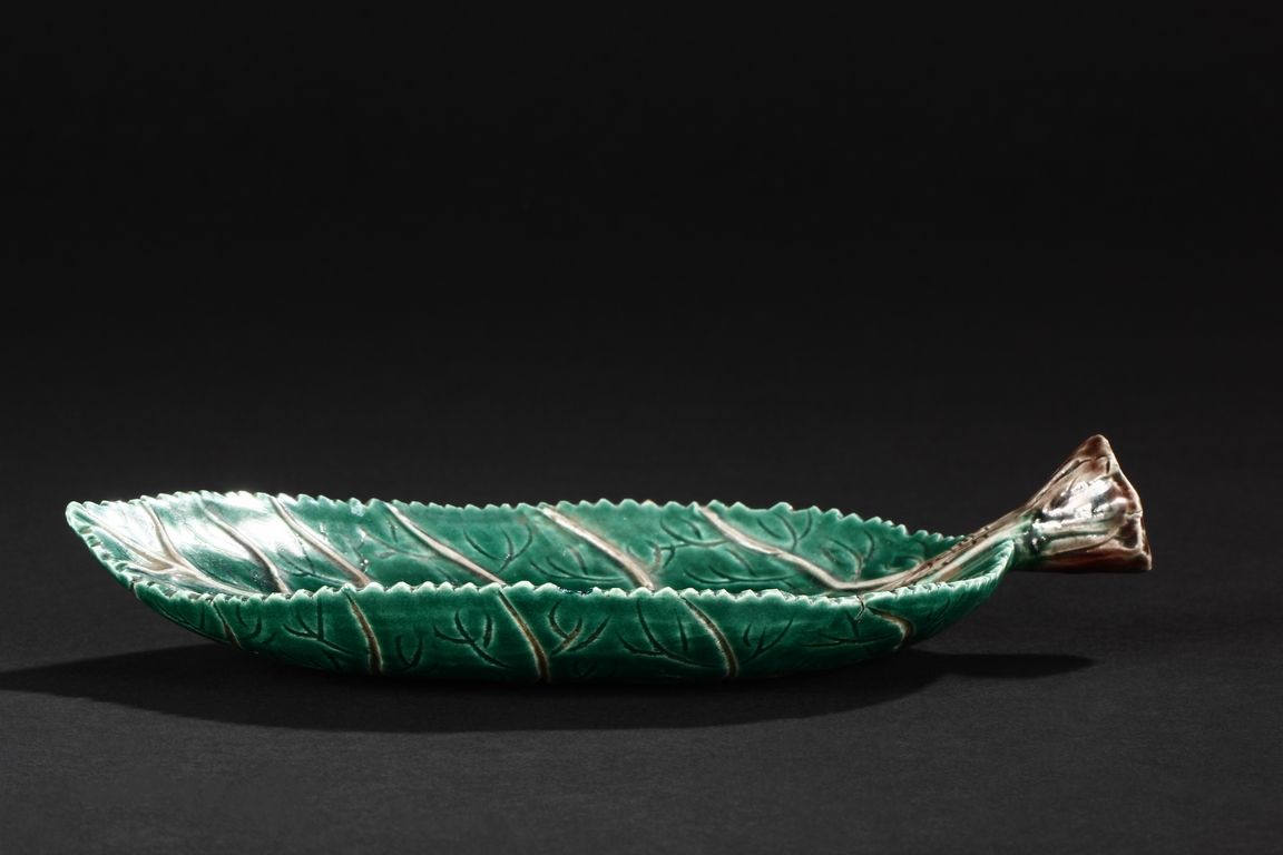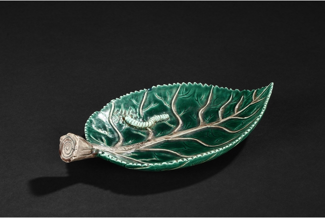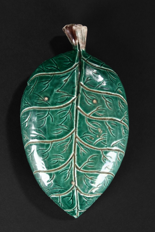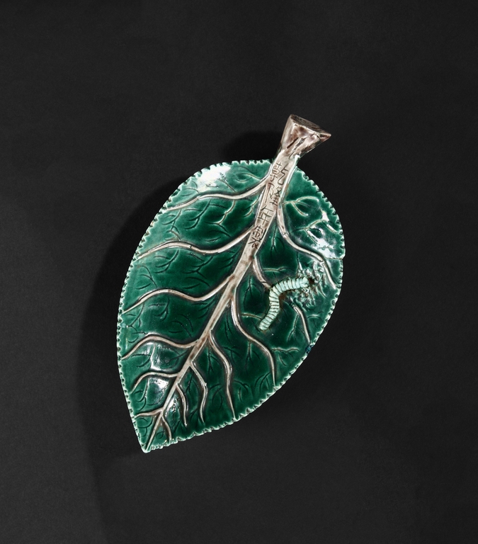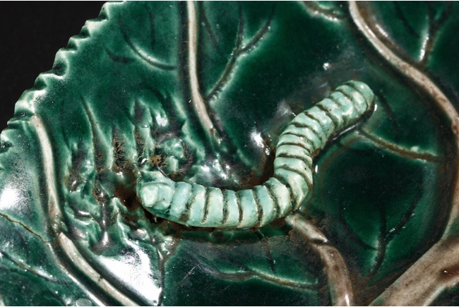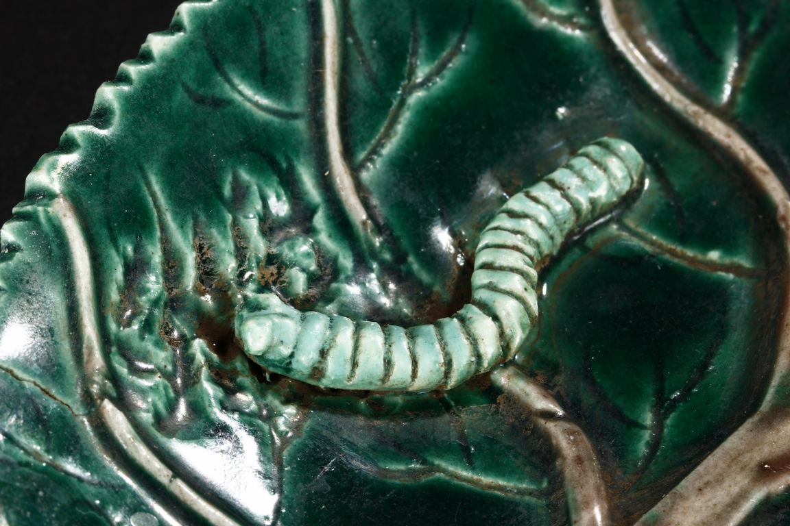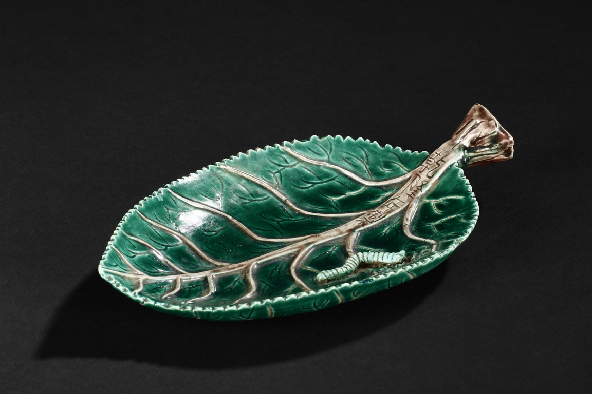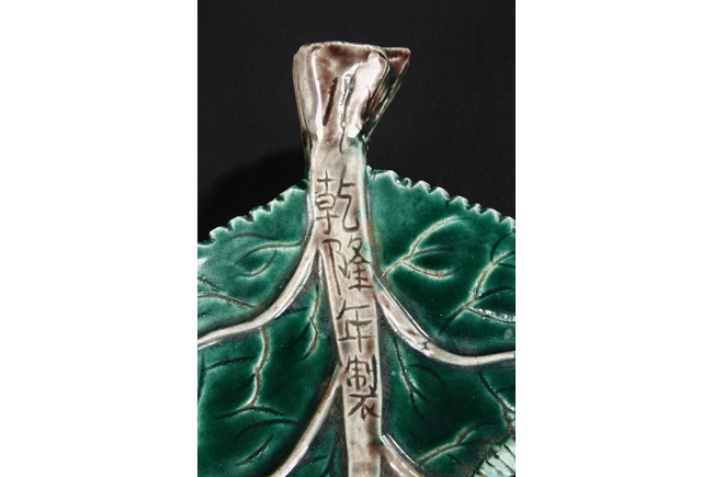 The washer styled after a green leaf, with a worm nibbling away at the top. Glazed overall in leaf green, four character mark "QIANLONG NIANZHI" marked on the center vein.