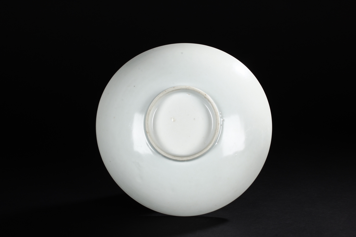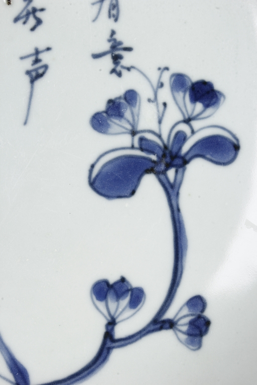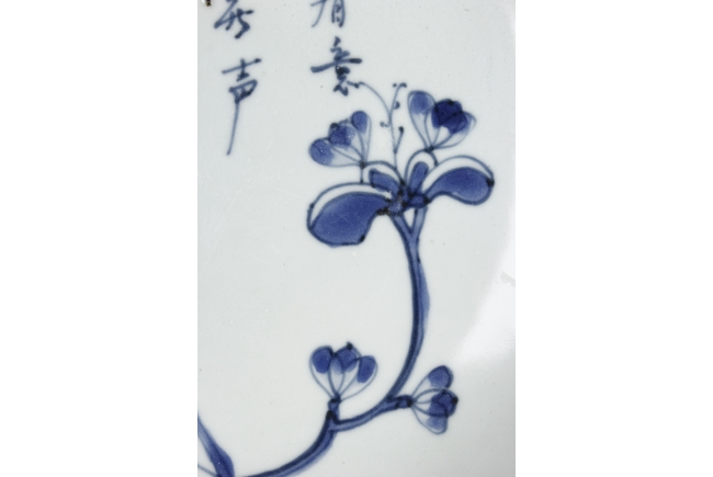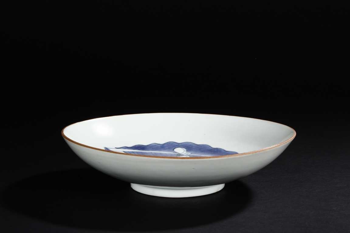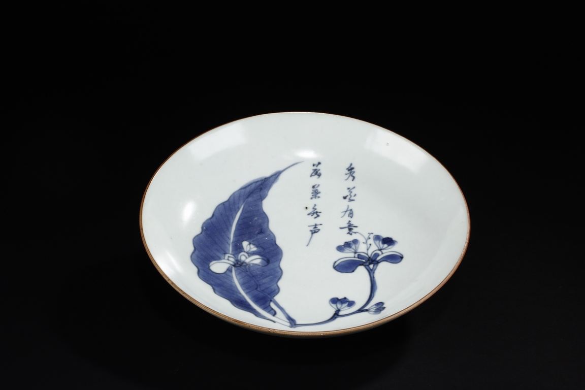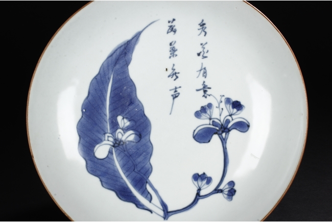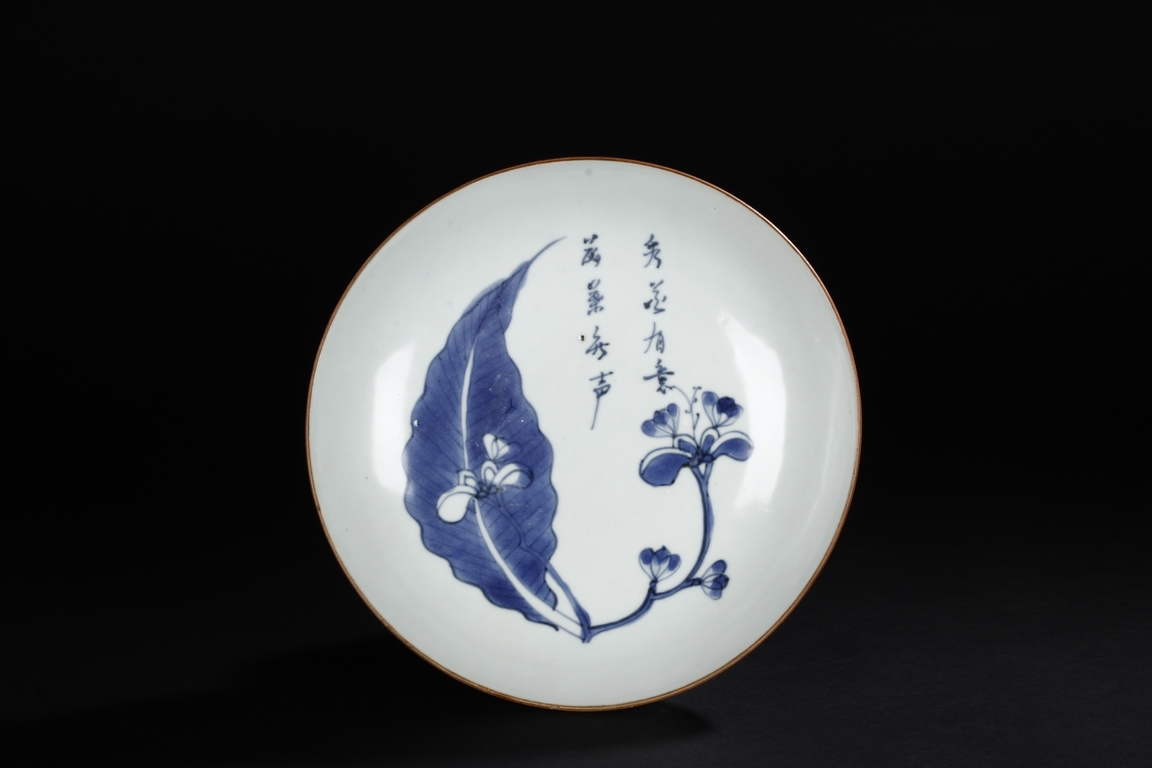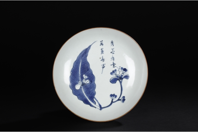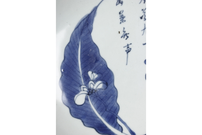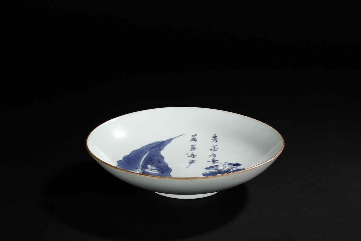 Of shallow design, supported by a round ring foot, the interior depicts wutong leaves, or Chinese parasol tree leaves, with poetry on the top right corner. Republic period.