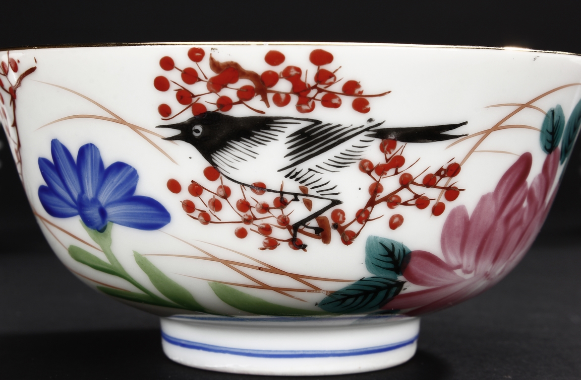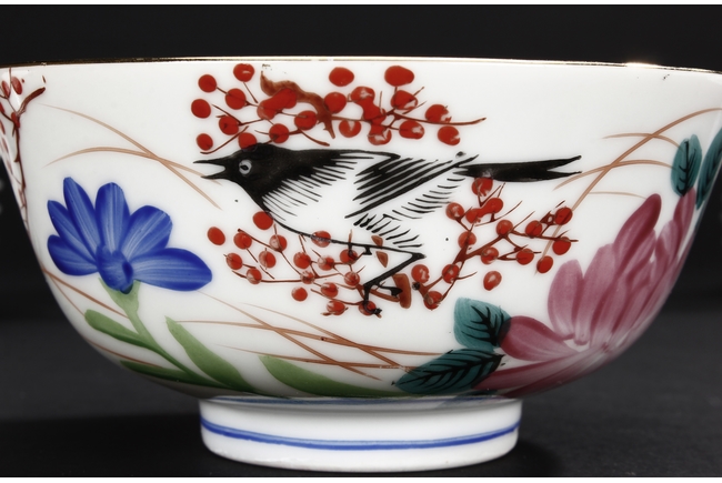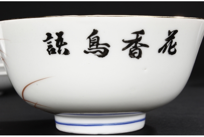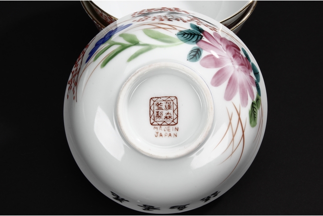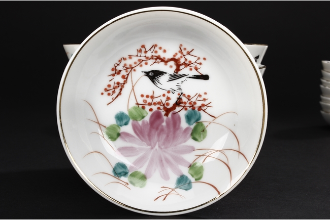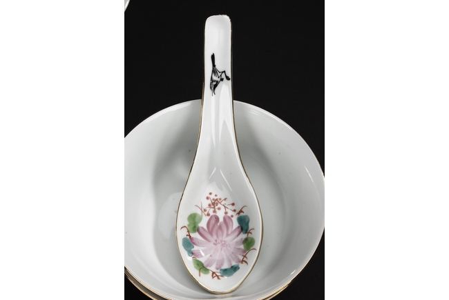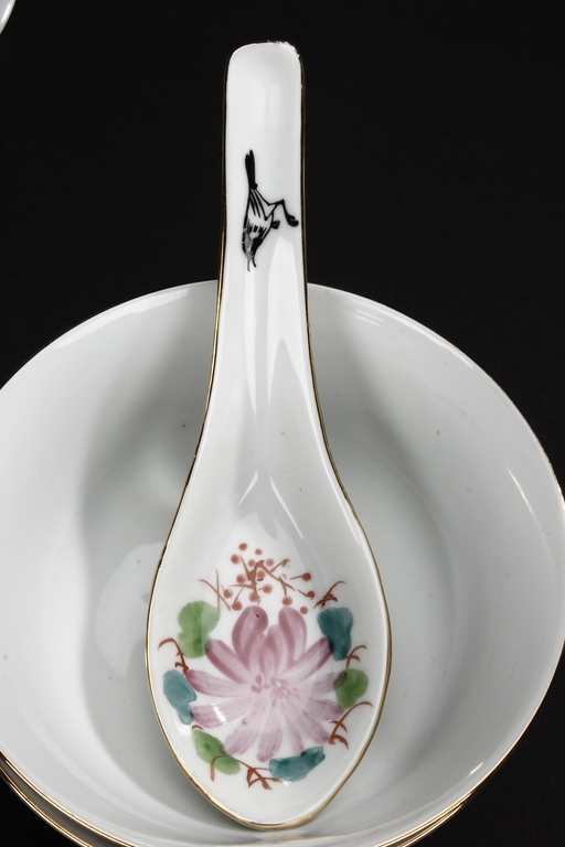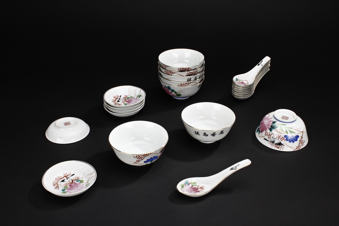The set of famille rose dinnerware includes eight bowls, six saucers, and eight spoons, the exterior themed birds and flowers, the bottom with four character seal mark, and "MADE IN JAPAN". Republic period.