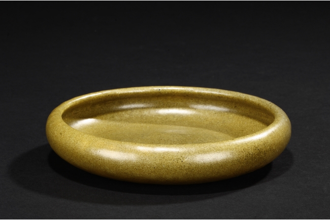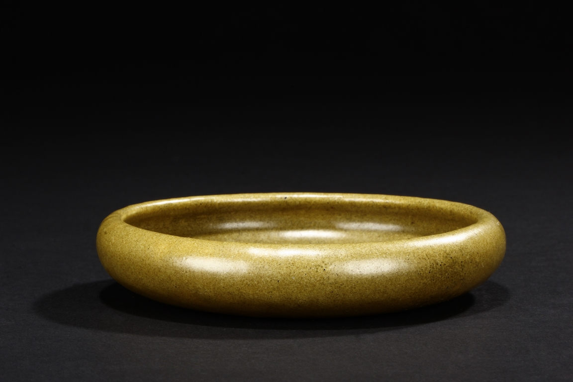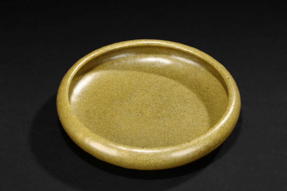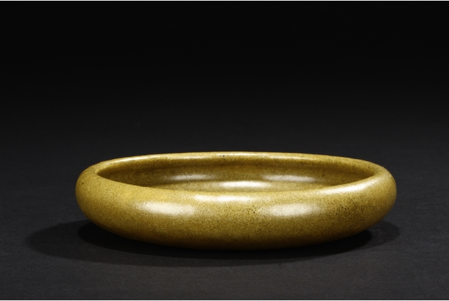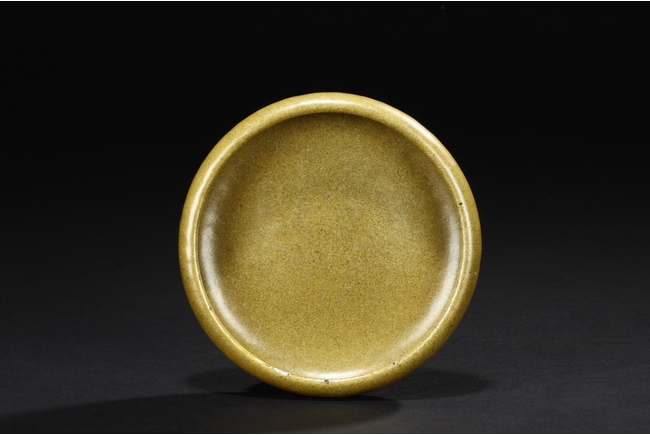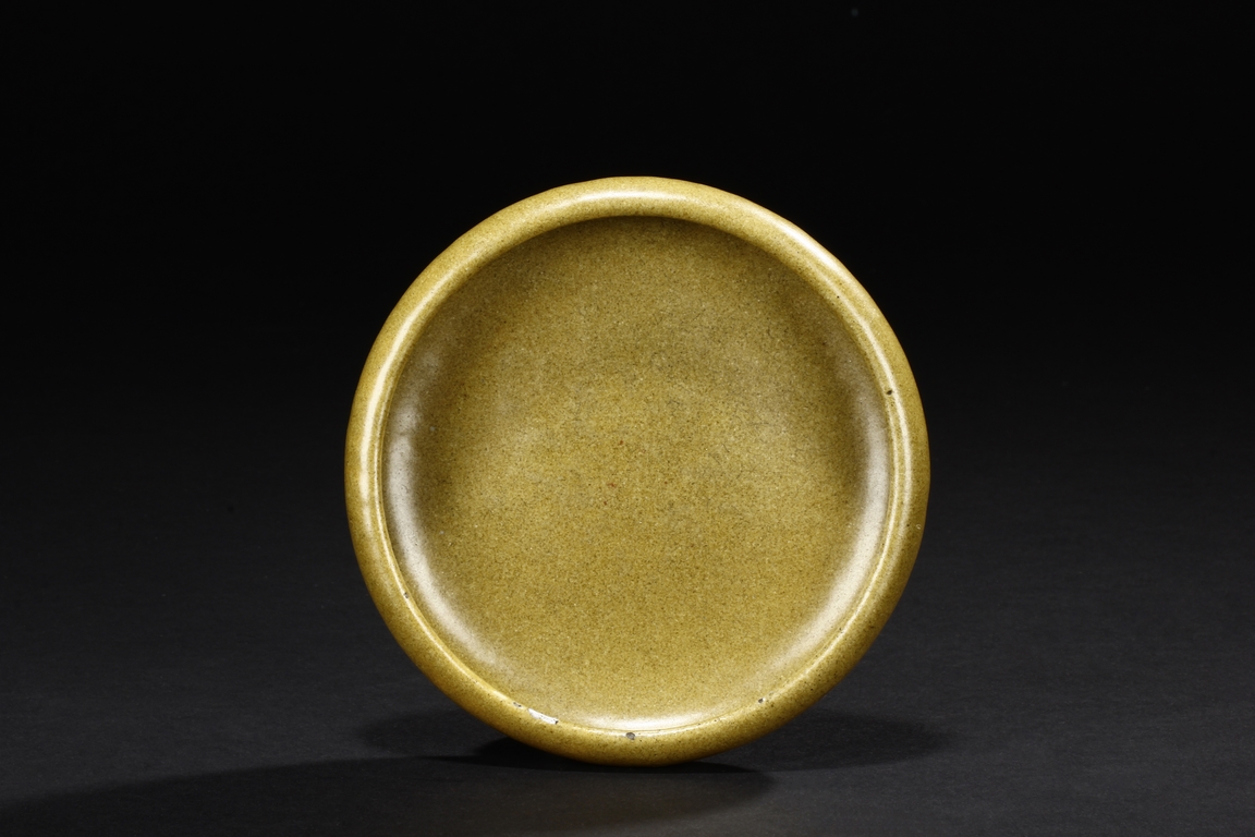Of compressed spherical shape, this shallow brush washer is covered in overall rich yellow glaze. The glazed bottom features eight spur marks. Qing Dynasty period.