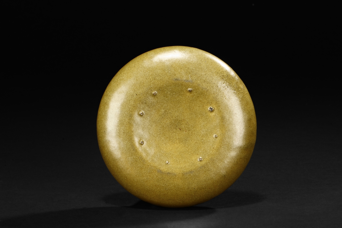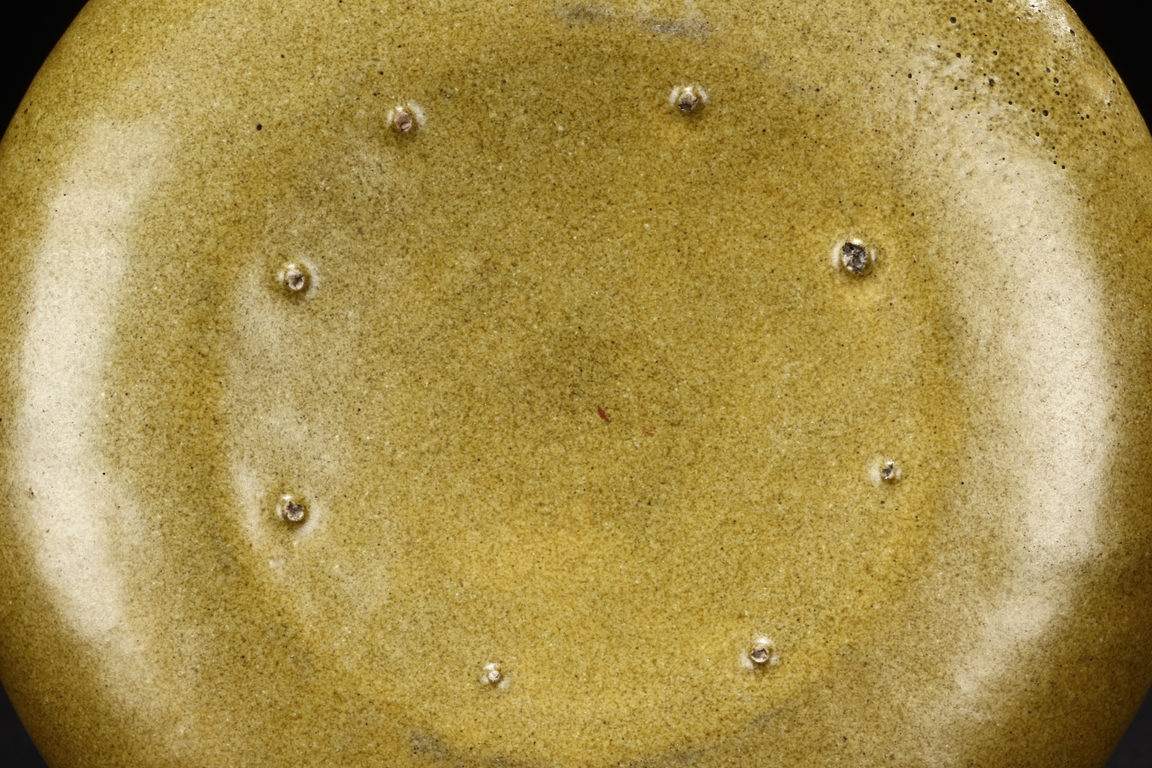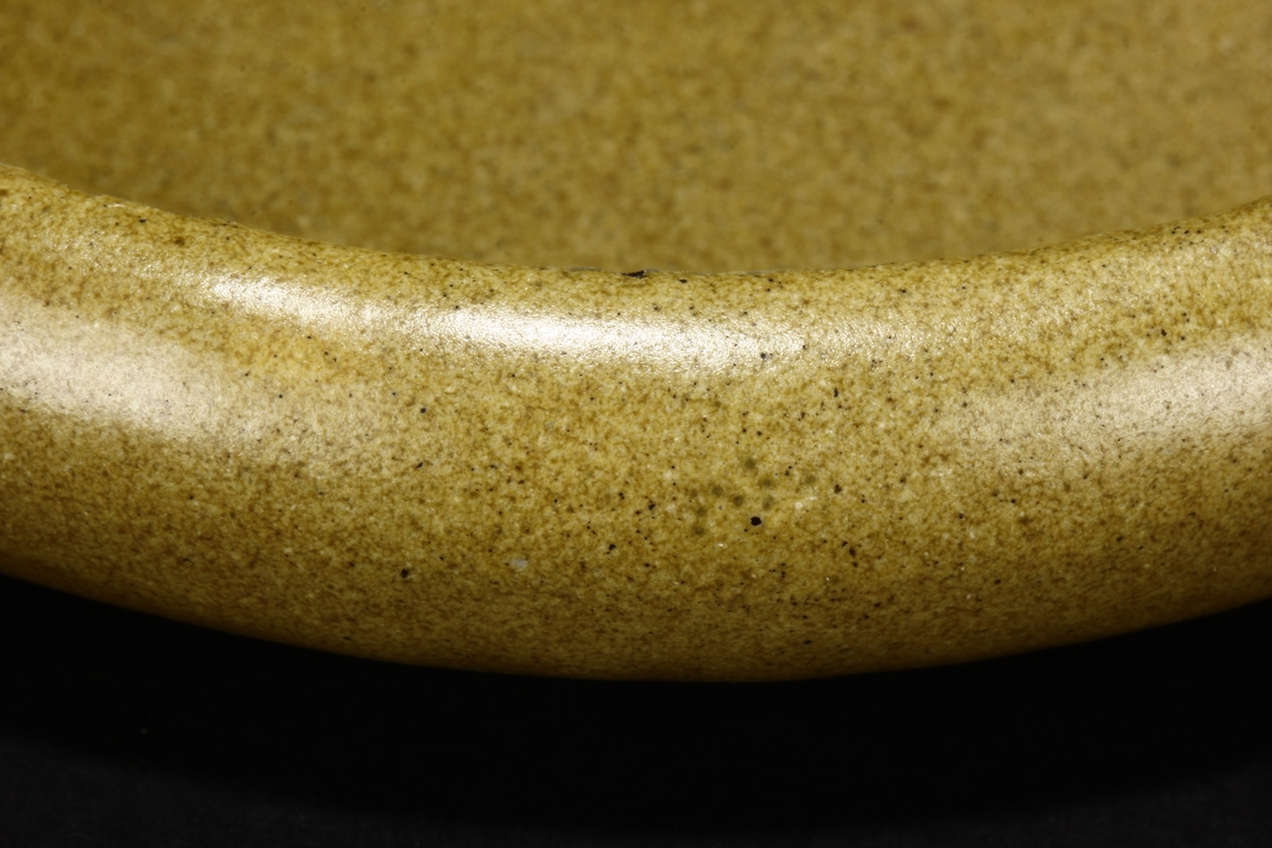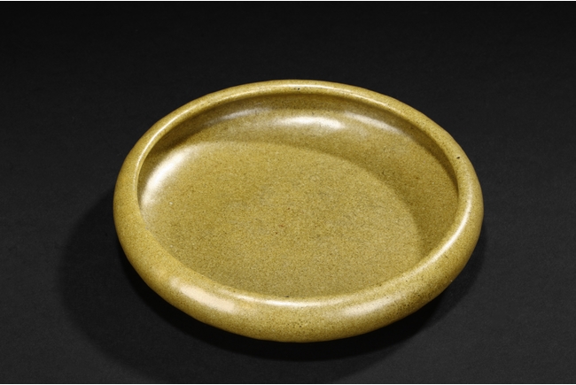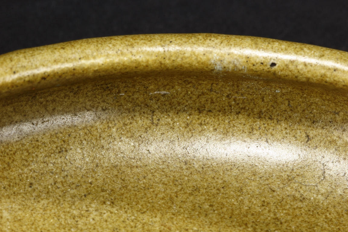 Of compressed spherical shape, this shallow brush washer is covered in overall rich yellow glaze. The glazed bottom features eight spur marks. Qing Dynasty period.