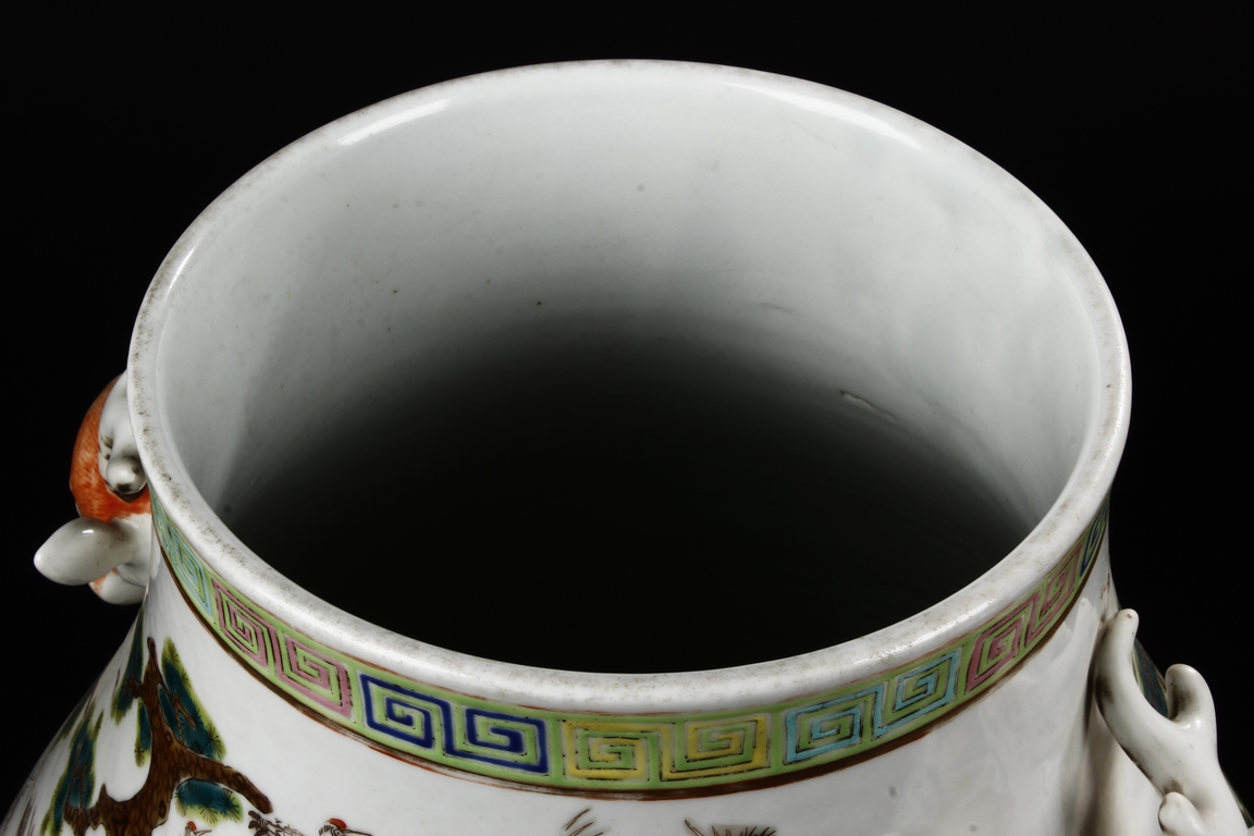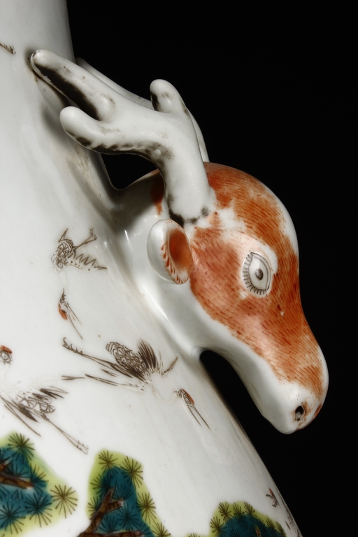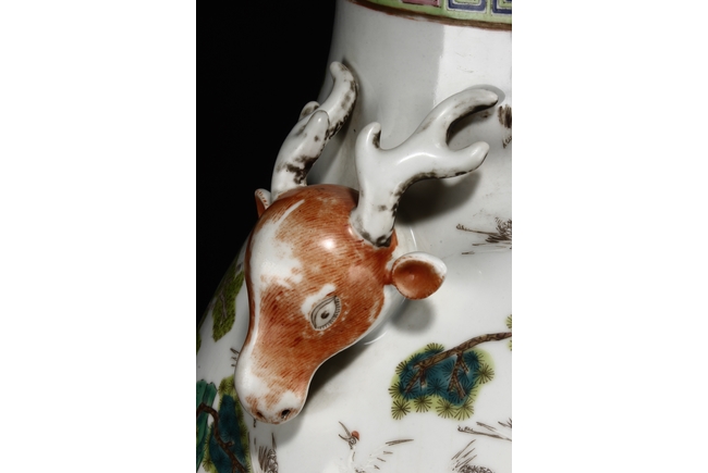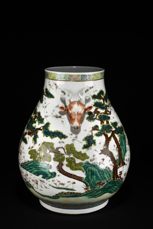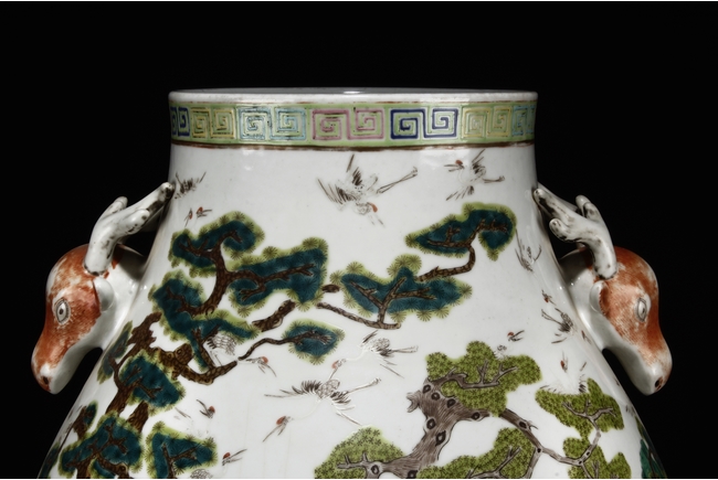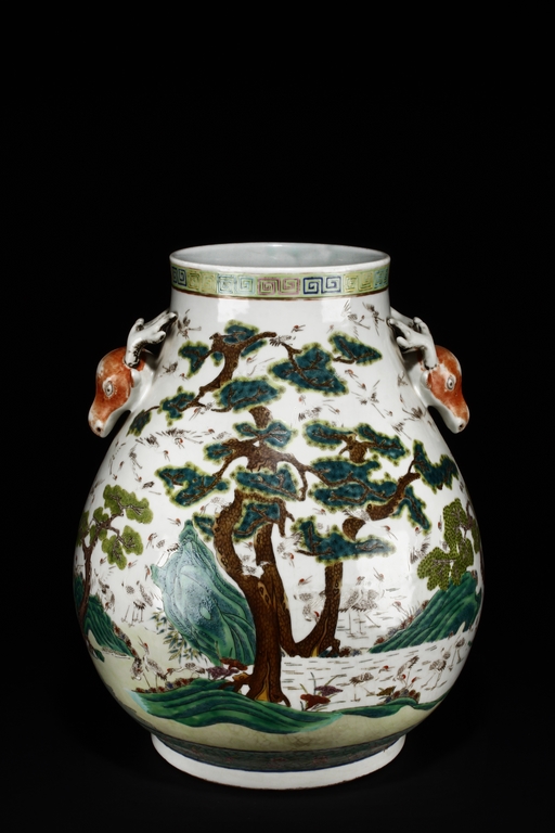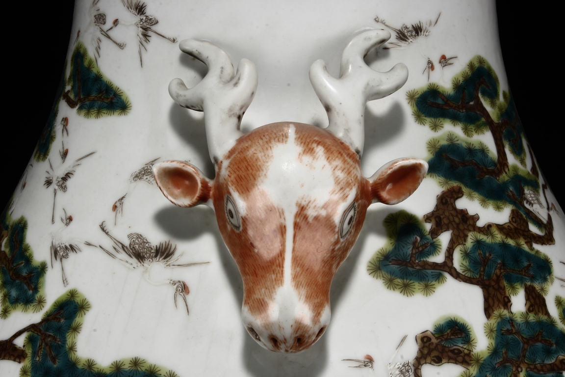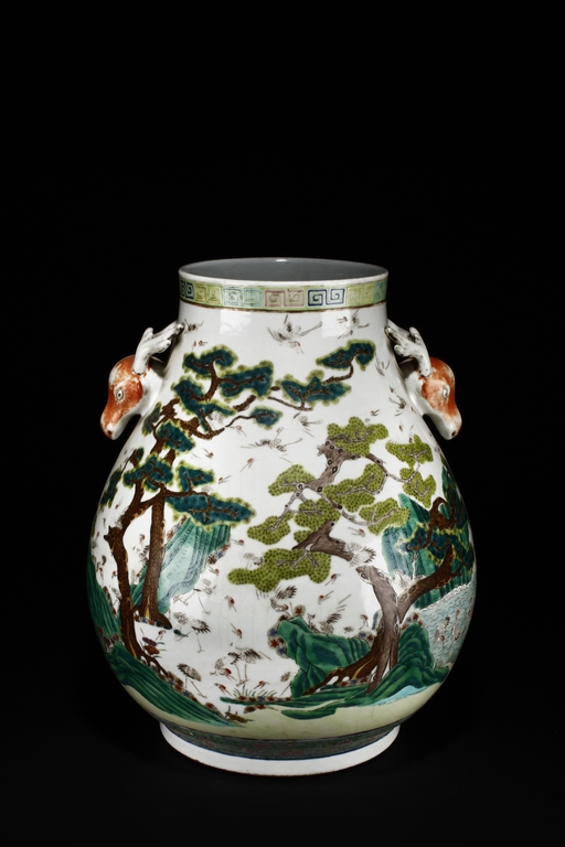 Of bulbous form, the famille rose vase's wide and round body supported by straight ring foot, with two deer head handles attached to the side, the body painted with a scene of hundred cranes in the vicinity of pine trees, mountains, and rivers, all between scrolling key-fret patterns on top and flower patterns on bottom. Six character "DAQING GUANGXU NIANZHI" mark on the crackle style bottom. Qing Dynasty period.