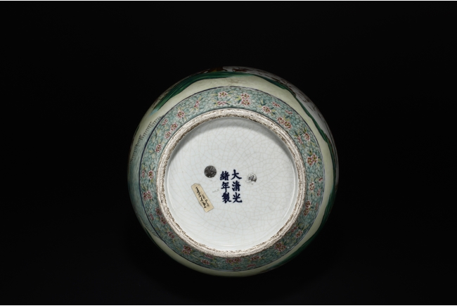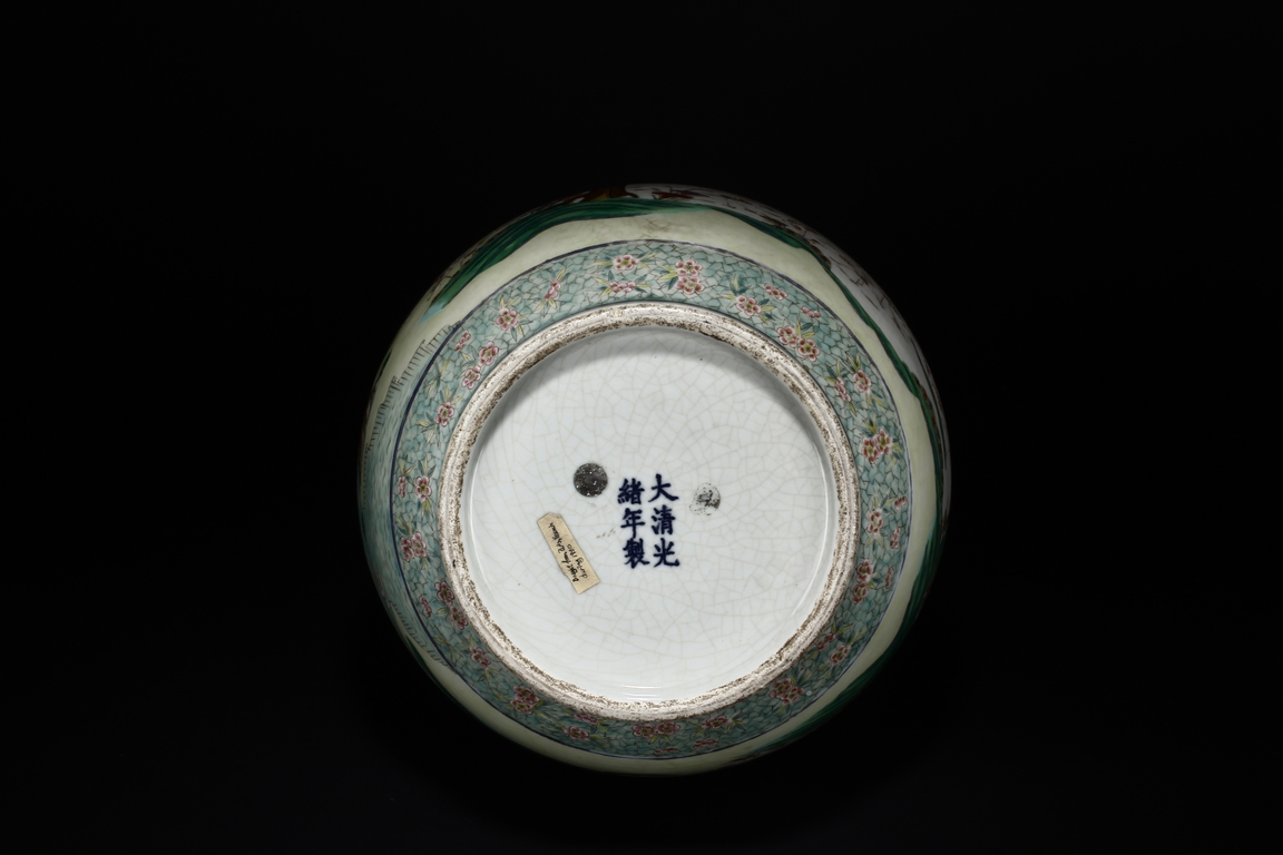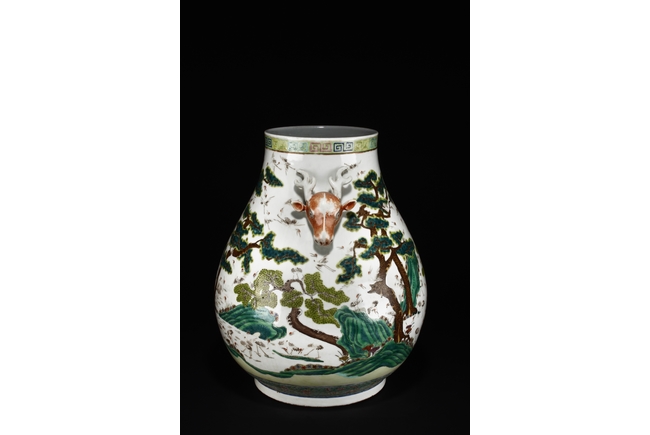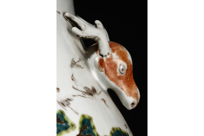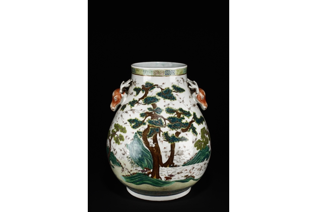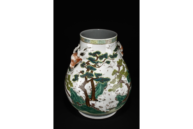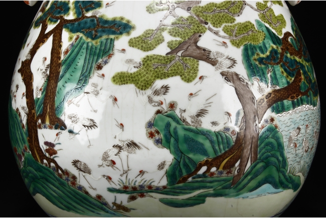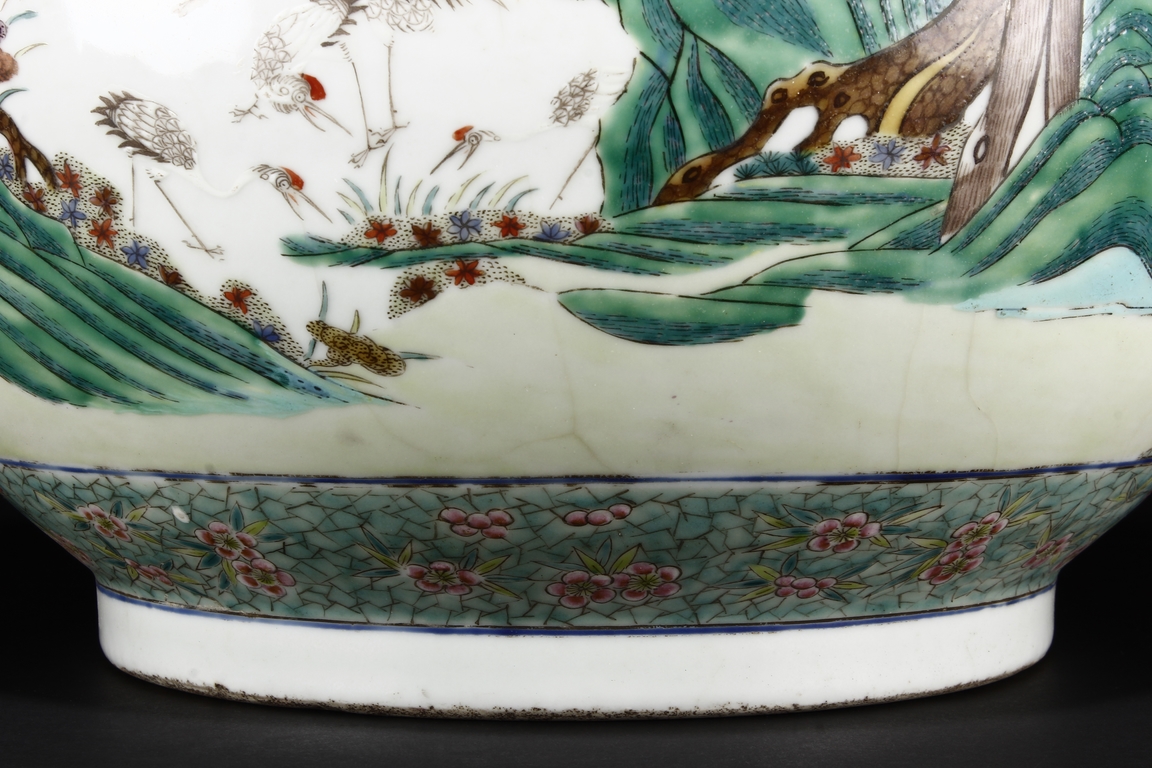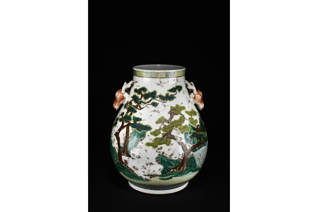 Of bulbous form, the famille rose vase's wide and round body supported by straight ring foot, with two deer head handles attached to the side, the body painted with a scene of hundred cranes in the vicinity of pine trees, mountains, and rivers, all between scrolling key-fret patterns on top and flower patterns on bottom. Six character "DAQING GUANGXU NIANZHI" mark on the crackle style bottom. Qing Dynasty period.