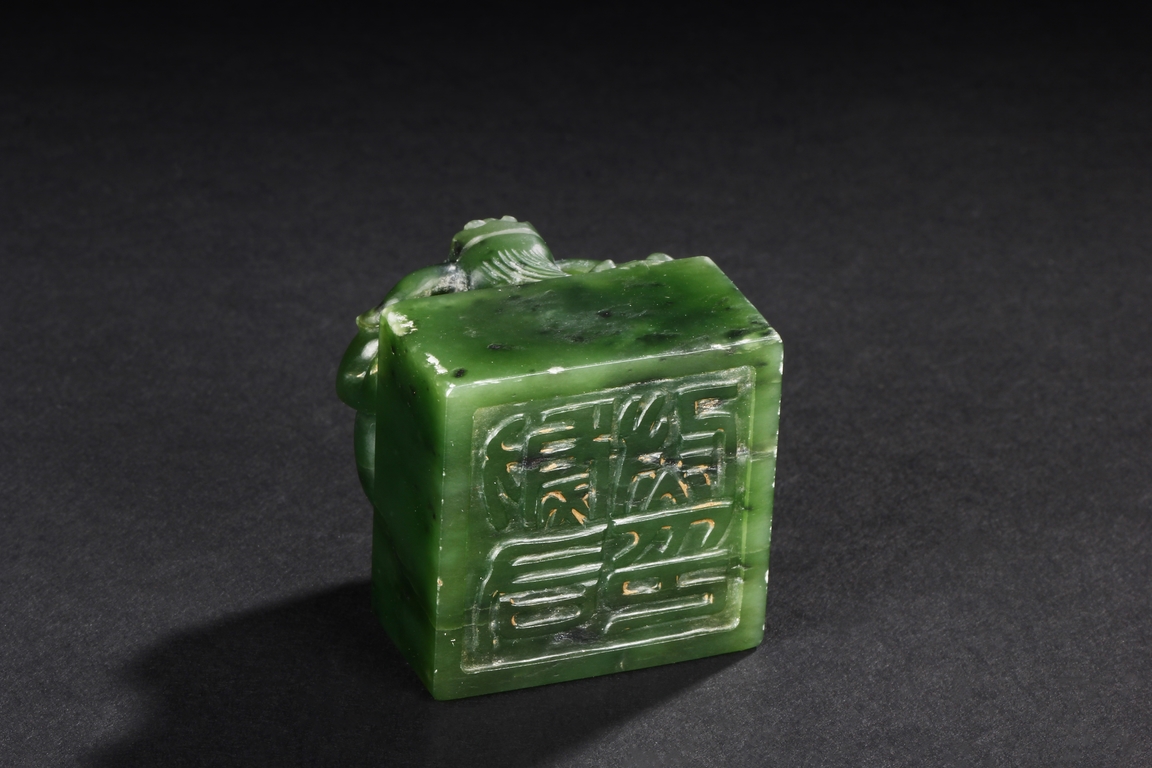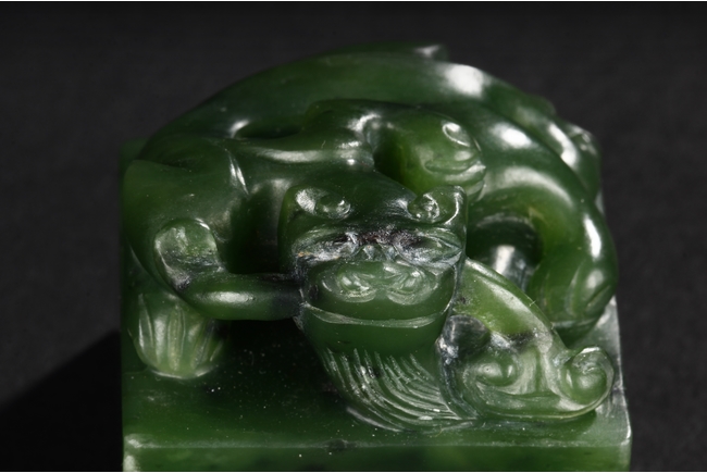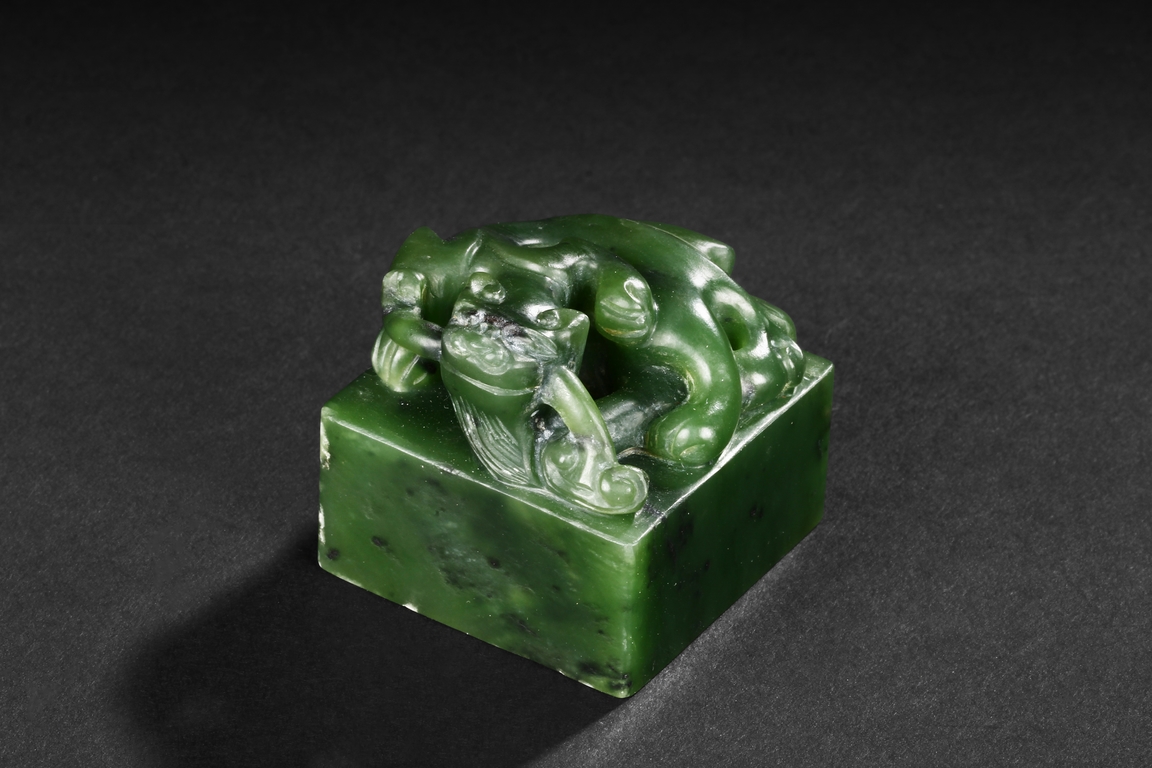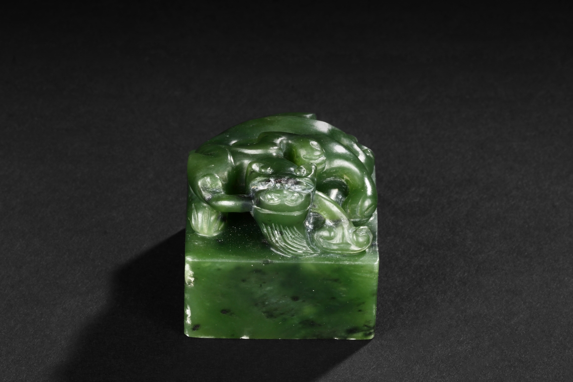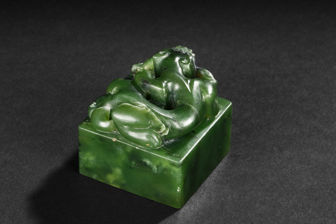 The seal has a square base, with a mythical beast curled and mounted on the top, head raised. The stone of deep spinach green color, the bottom has a four character mark. Qing Dynasty period.
