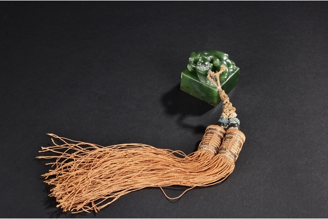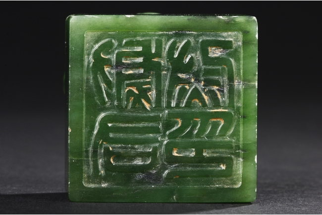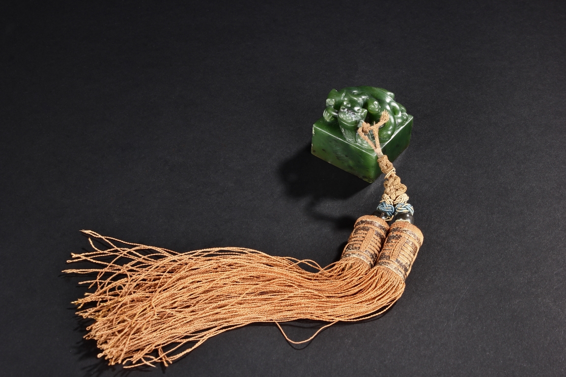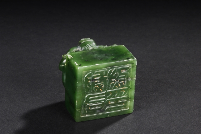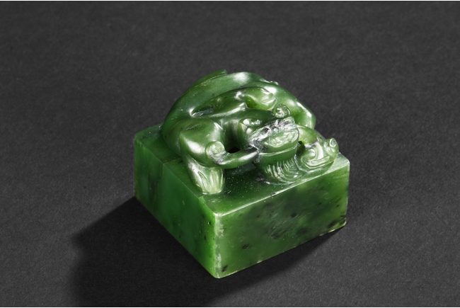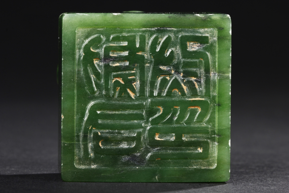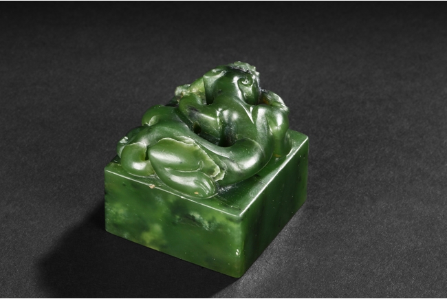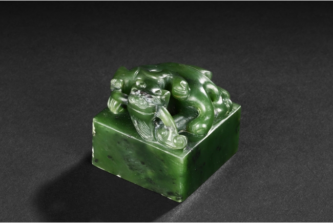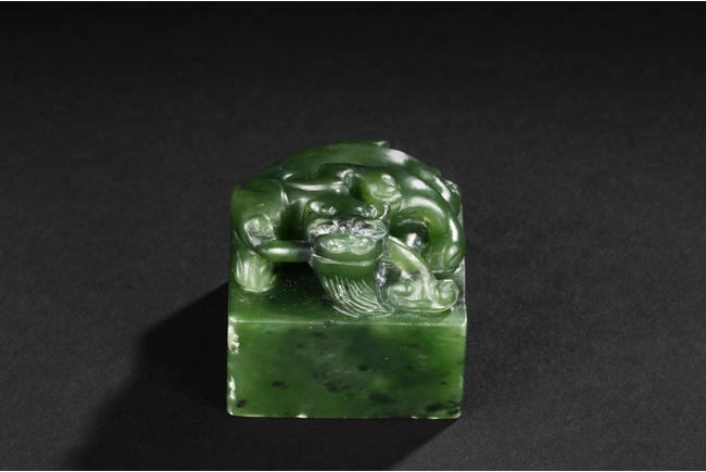 The seal has a square base, with a mythical beast curled and mounted on the top, head raised. The stone of deep spinach green color, the bottom has a four character mark. Qing Dynasty period.