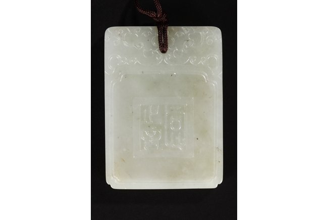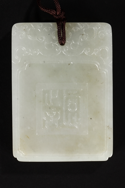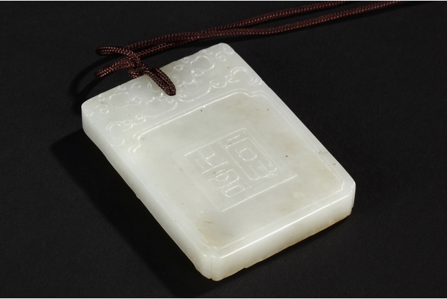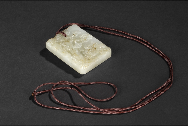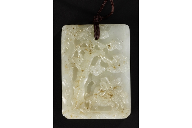 Of flattened rectangular form, one side carved with two elders on horses riding under pine trees, the reverse carved with ocean wave patterns on top and a three character seal mark in the center, the stone of white color with dotted russet.