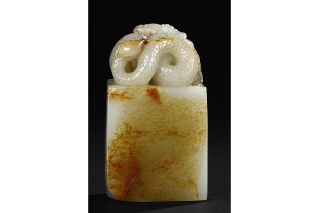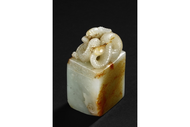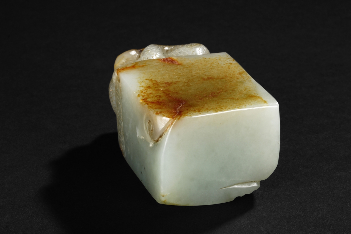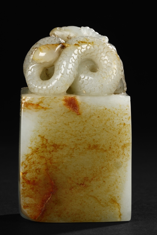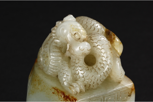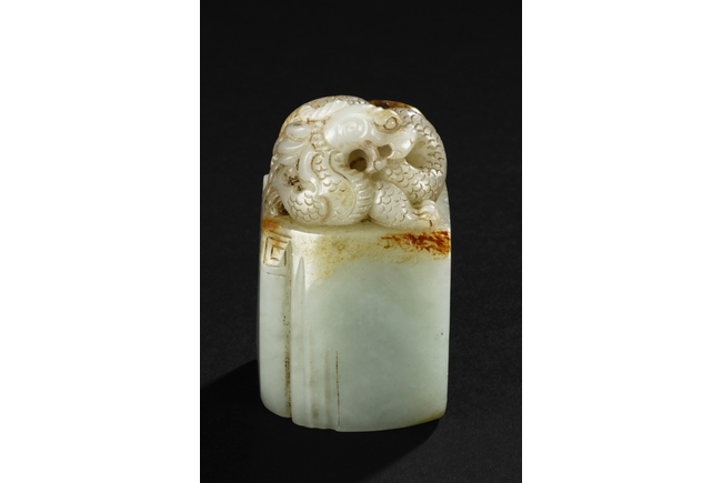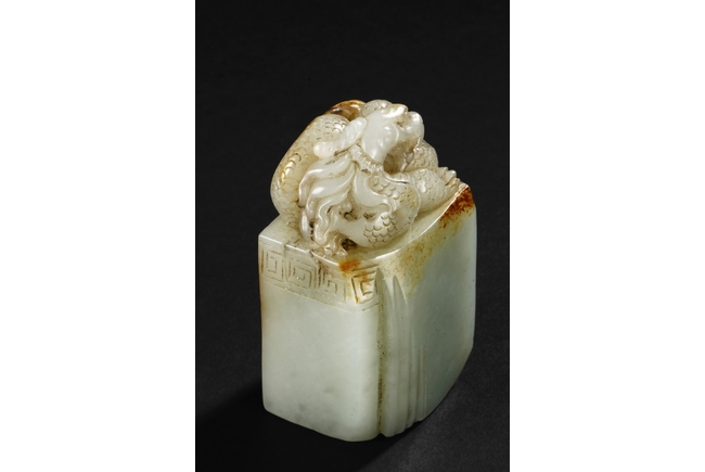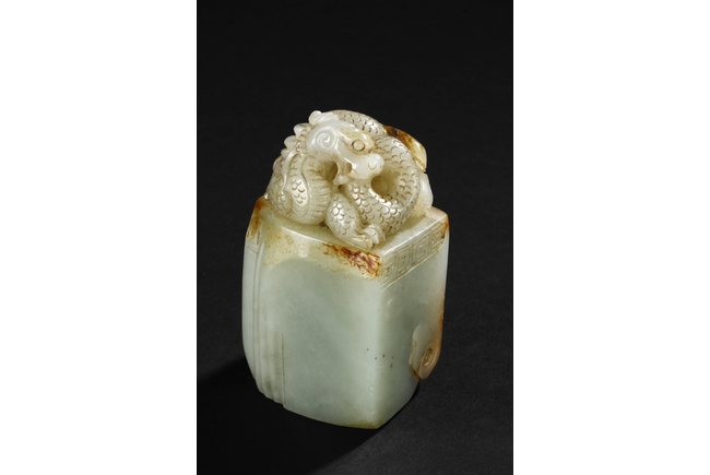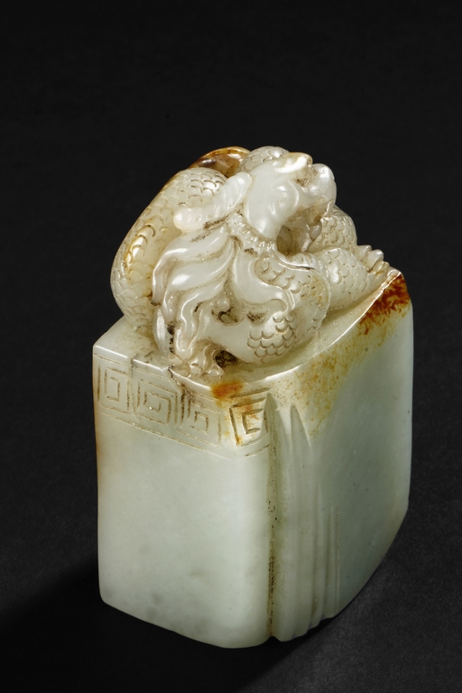 The seal has a rectangular base, two sides carved with key-fret patterns near top, the top mounted a flying four-clawed dragon, the bottom uncarved. The stone of smooth white with slight russet. Qing Dynasty period.
