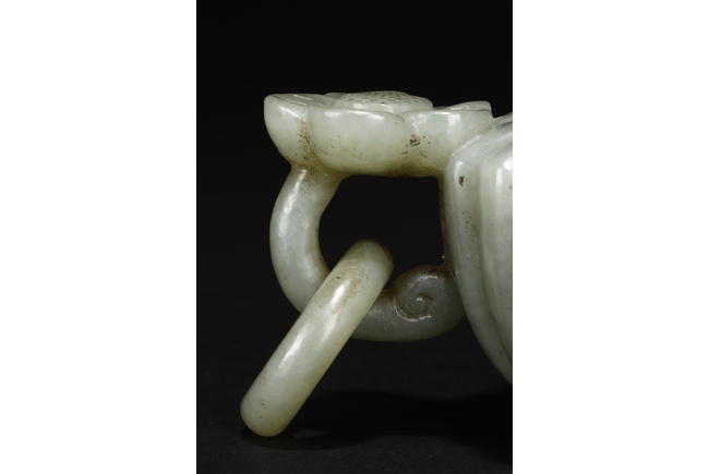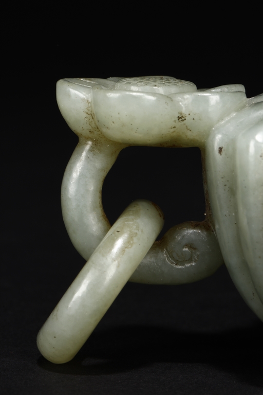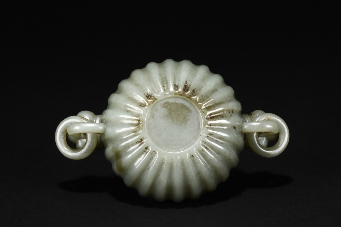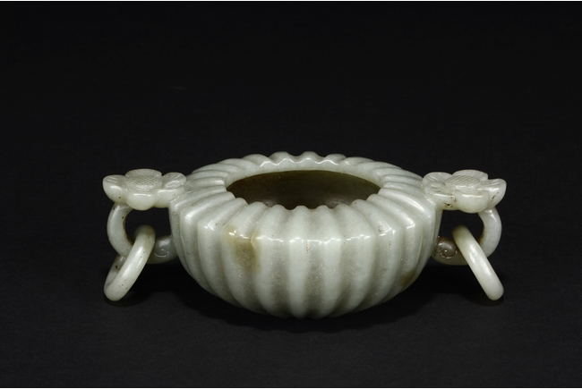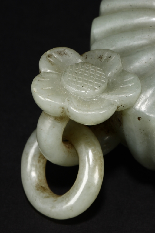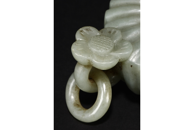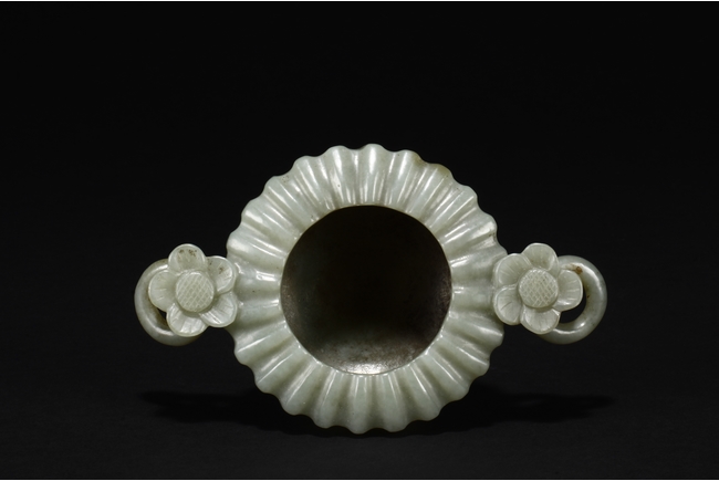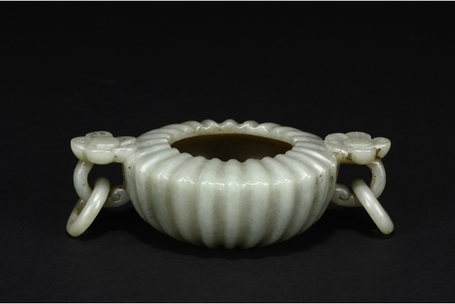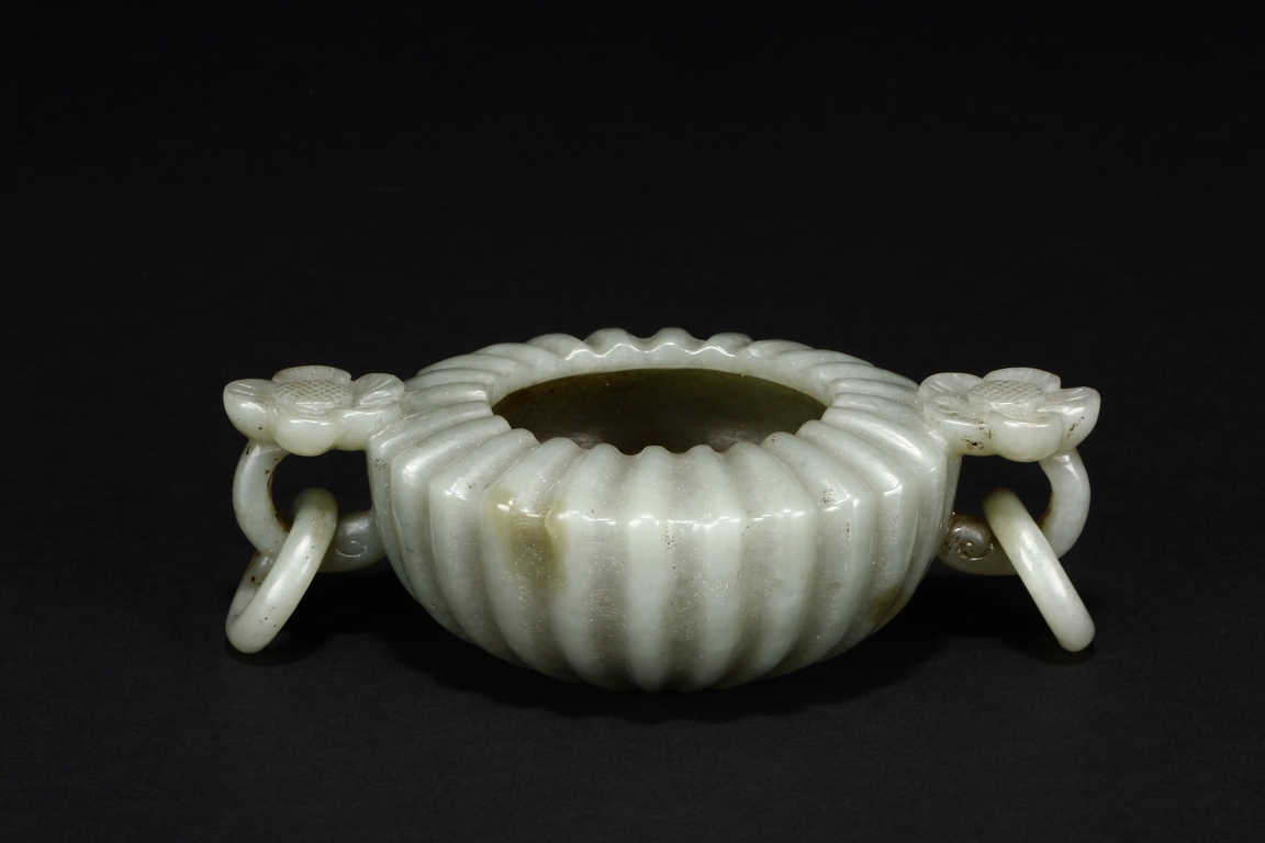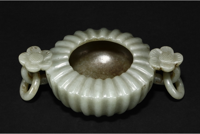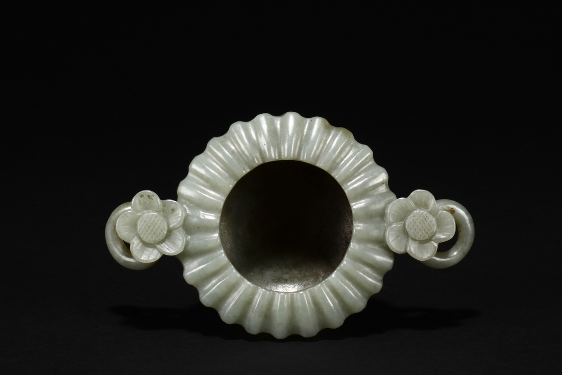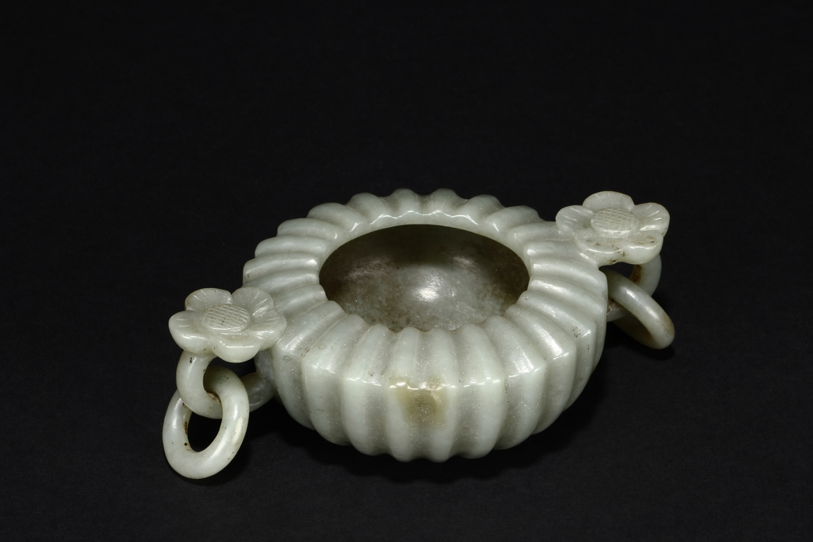 Carved from celadon jade, the Mughal-style washer with chrysanthemum flower petal-like body, the flower handles holds looped ring, the stone of dark grayish green color. Qing Dynasty period.