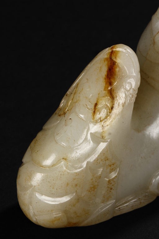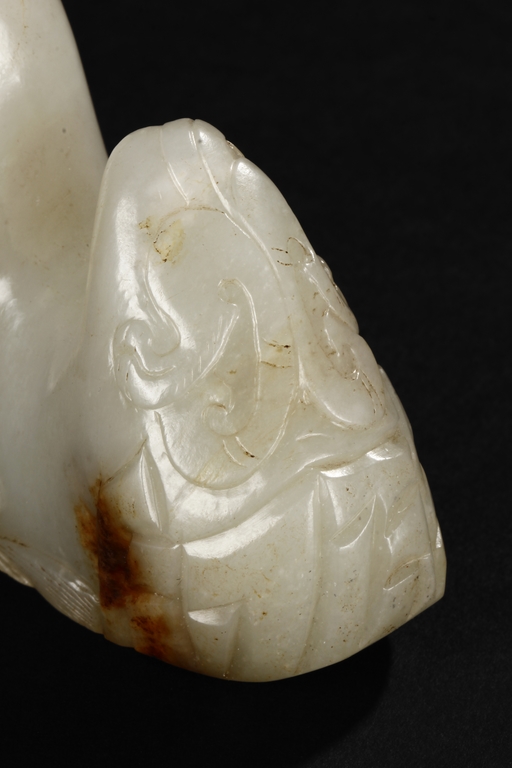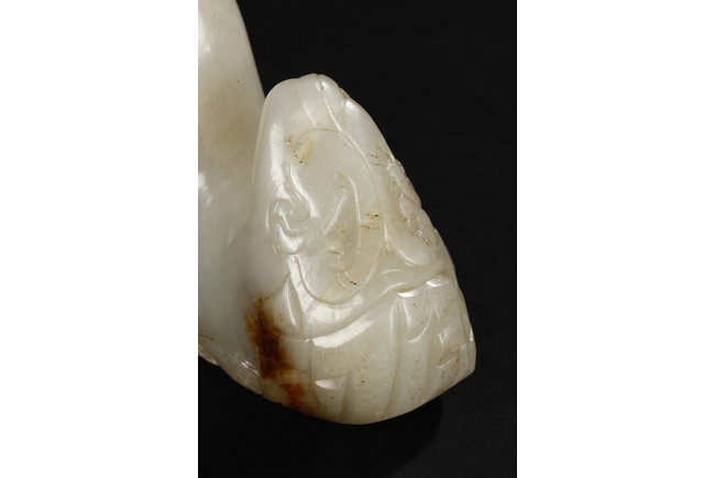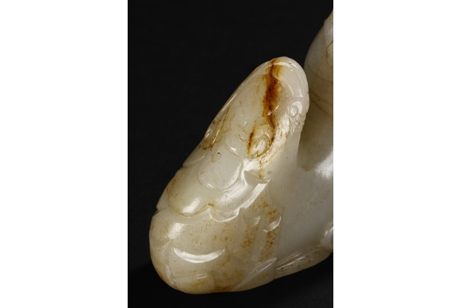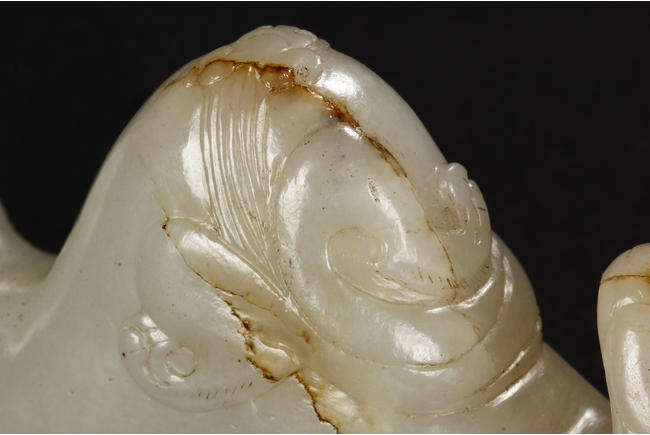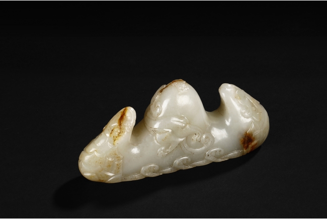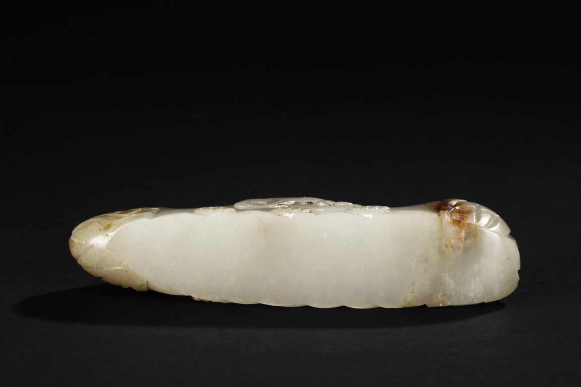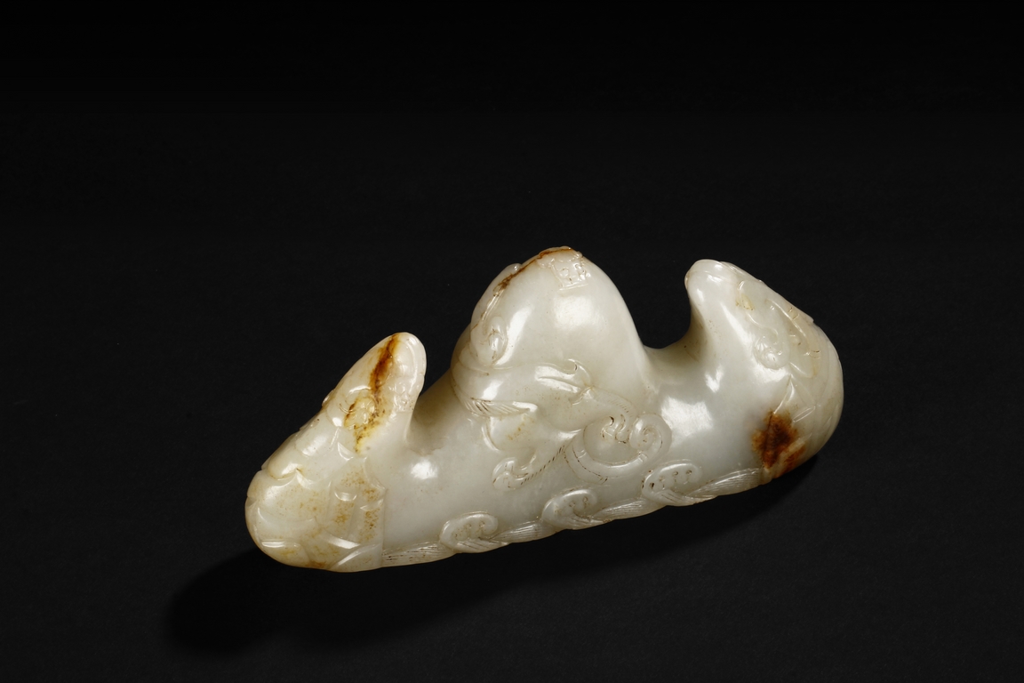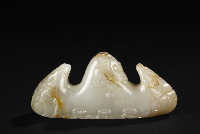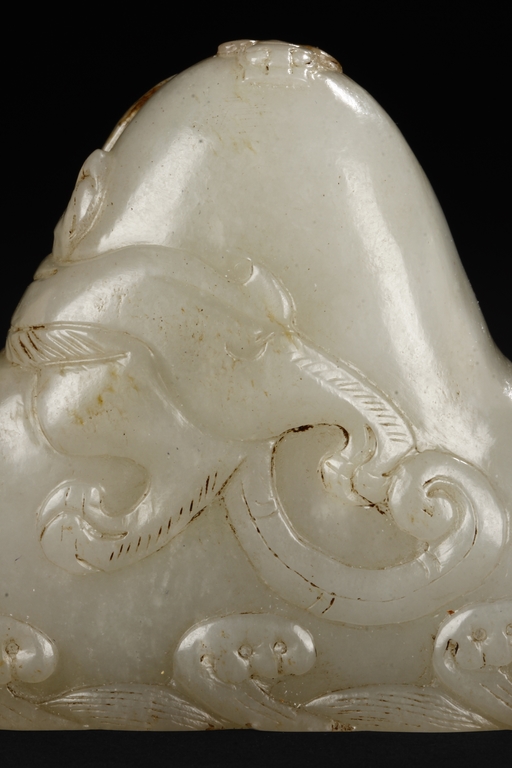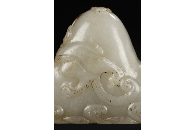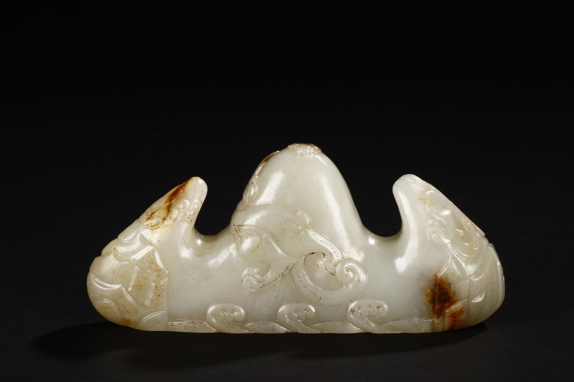 The brush rest carved in the form of mountain, the bottom carved with ocean waves, the sides carved with steep ridges, and the center carved with a chilong mounted around the mountain, the stone of patinated white with slight russet. Early Qing Dynasty period.