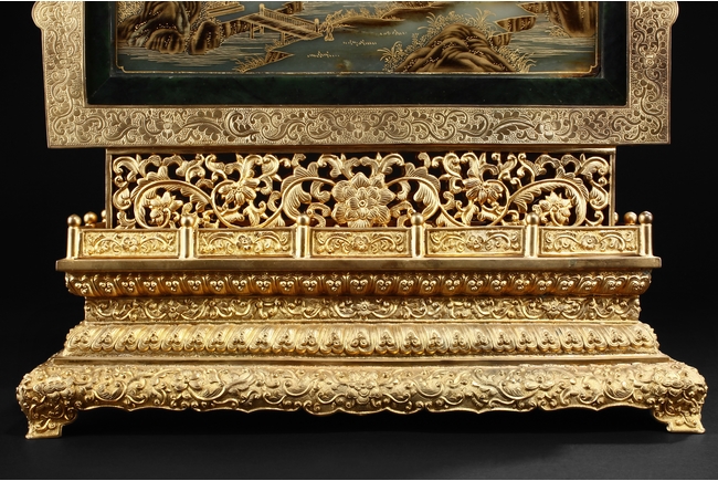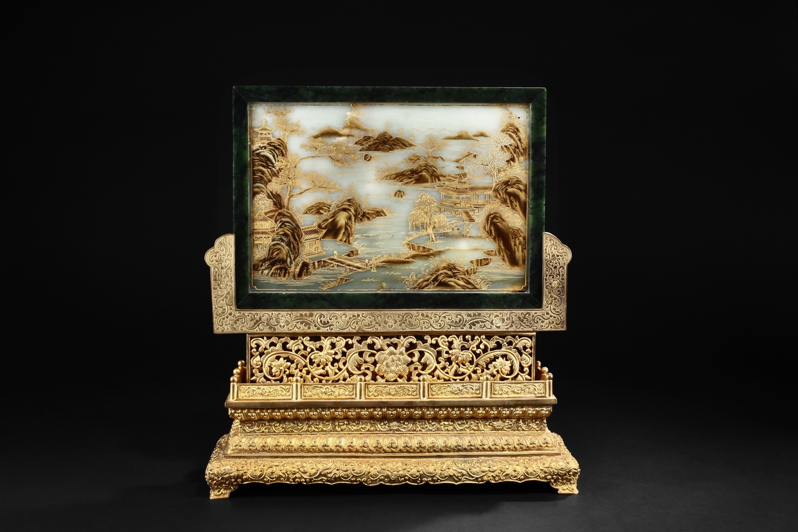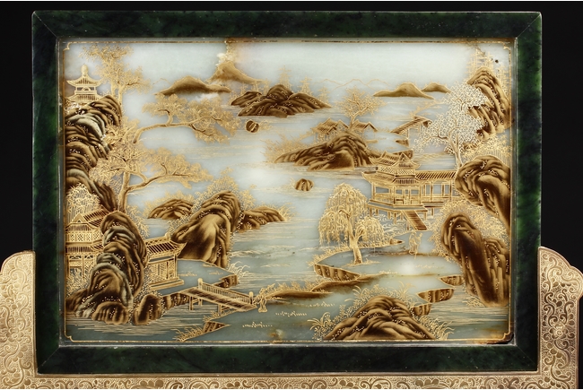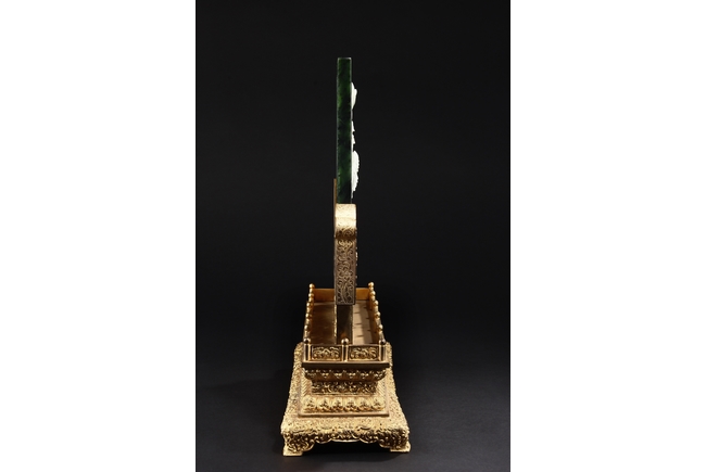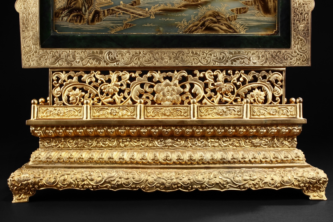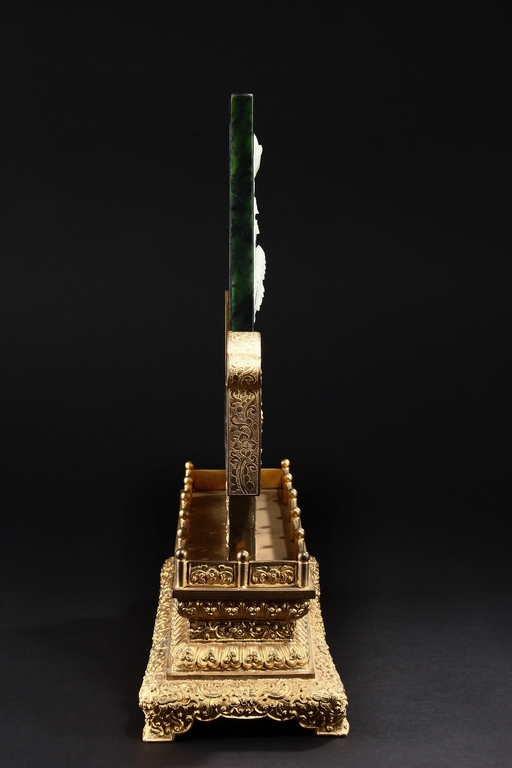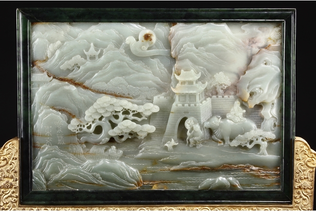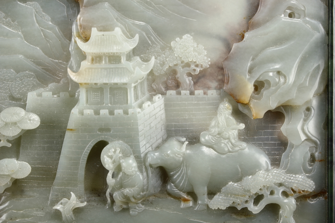 The jade plaque relief carved the story of Lao Zi, riding on a water buffalo, arrives at Hangu Guan right after the auspicious purple cloud, the idiom "Zi Qi Dong Lai" carved on the left side. The reverse is gilt decorated with a riverside scenery including village buildings, bridges, willow trees, villagers, and rockworks. The plaque is enclosed in a rectangular nephrite jade frame, all inset into a gilt bronze stand, with beautiful flower themed patterns and pedestal. 20th Century.