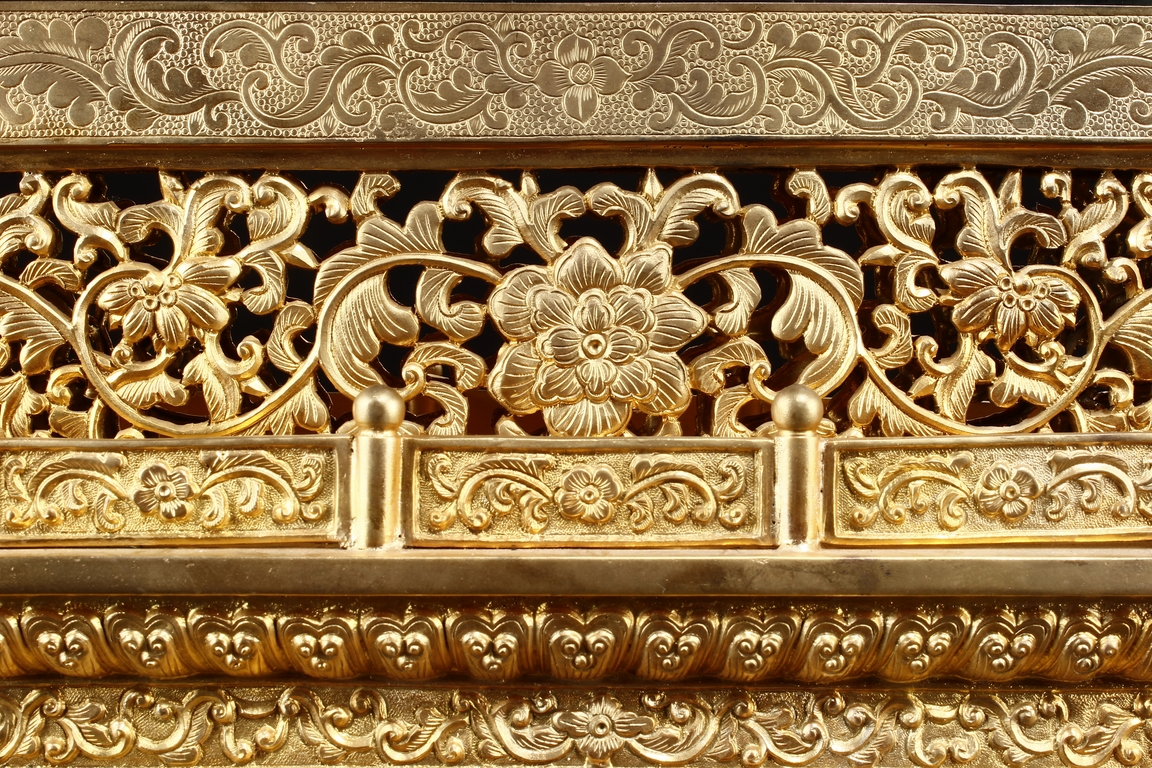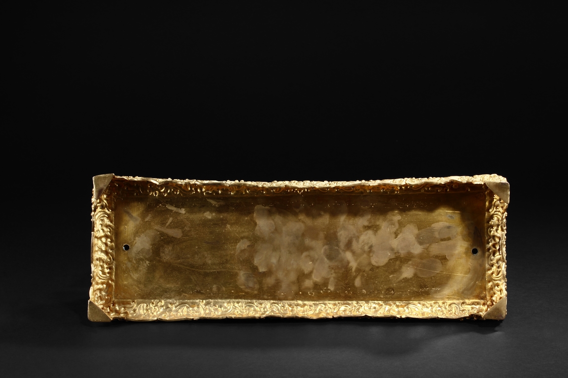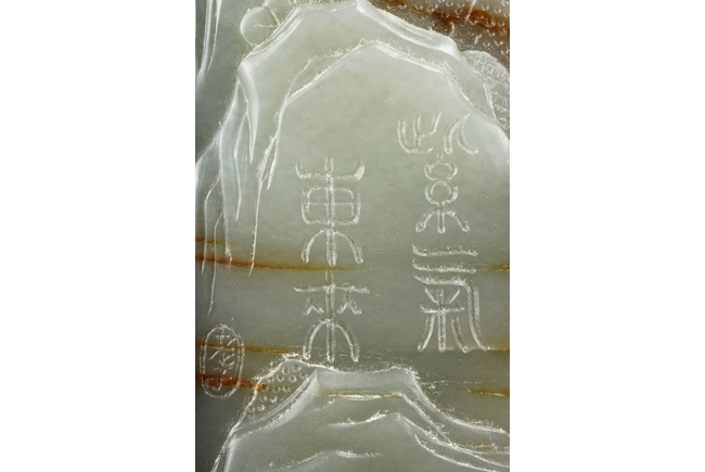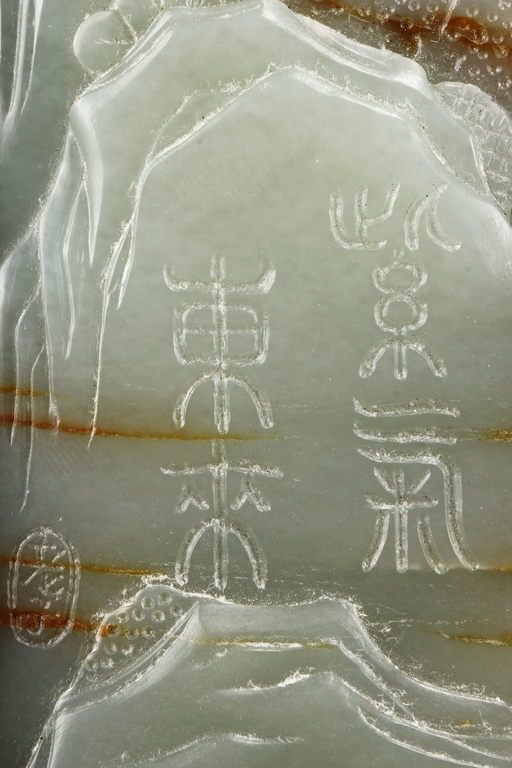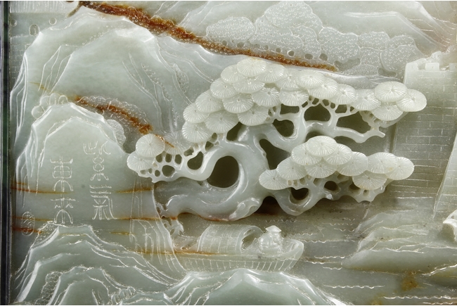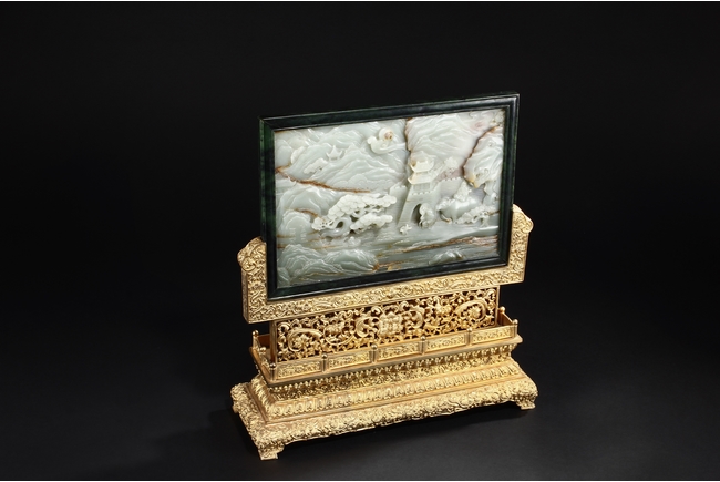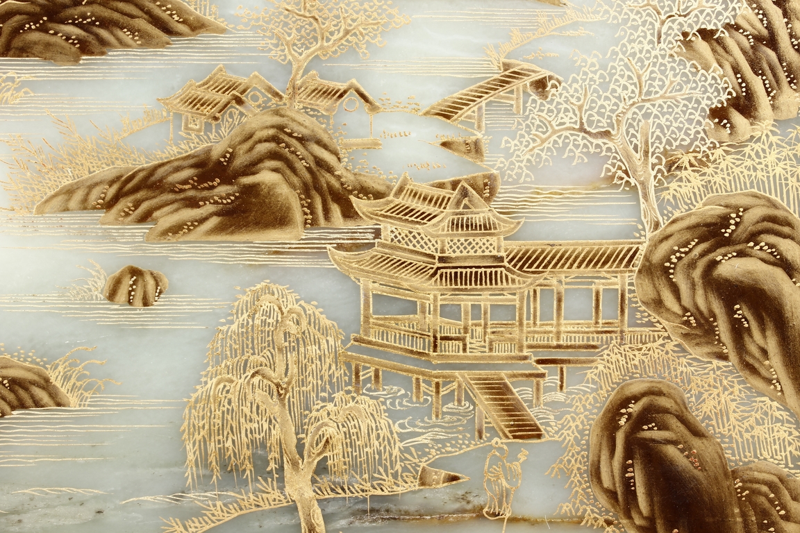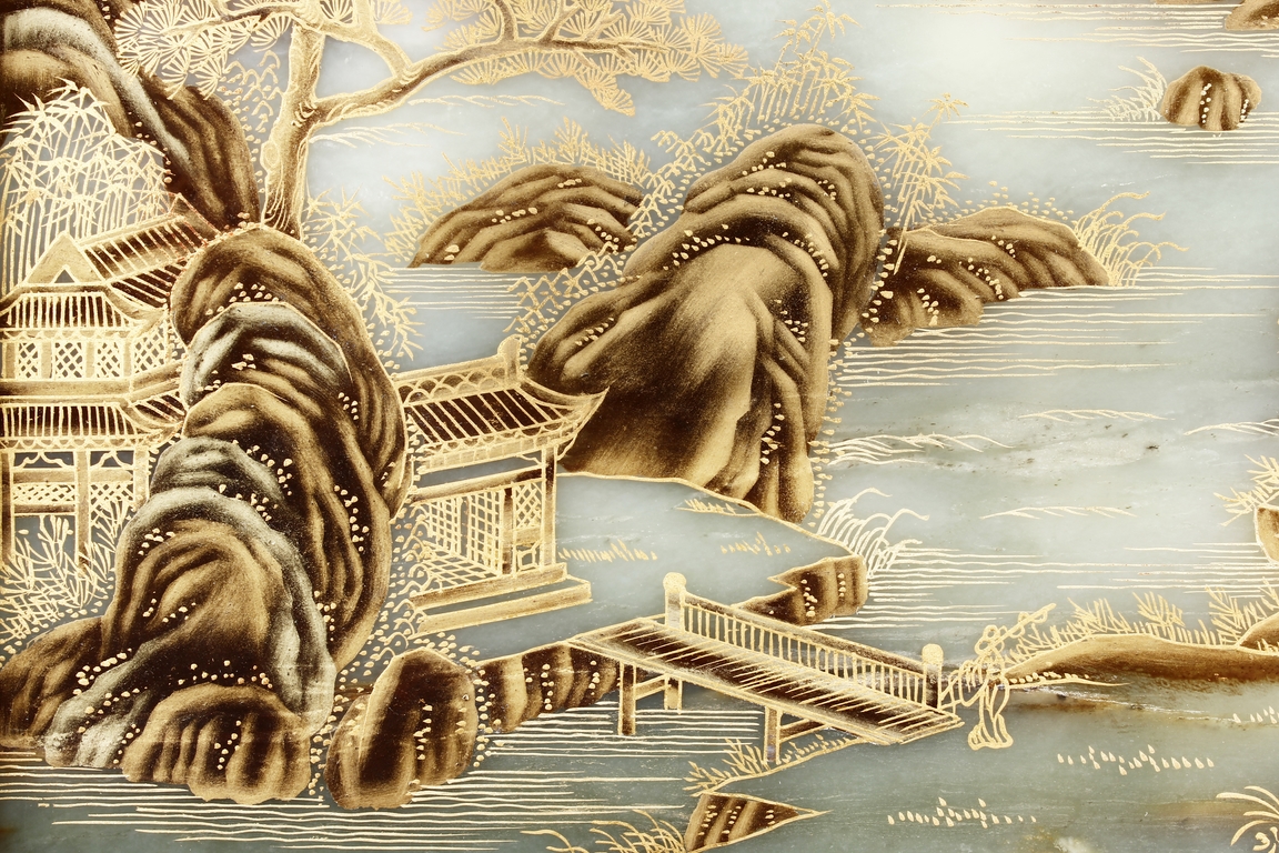 The jade plaque relief carved the story of Lao Zi, riding on a water buffalo, arrives at Hangu Guan right after the auspicious purple cloud, the idiom "Zi Qi Dong Lai" carved on the left side. The reverse is gilt decorated with a riverside scenery including village buildings, bridges, willow trees, villagers, and rockworks. The plaque is enclosed in a rectangular nephrite jade frame, all inset into a gilt bronze stand, with beautiful flower themed patterns and pedestal. 20th Century.