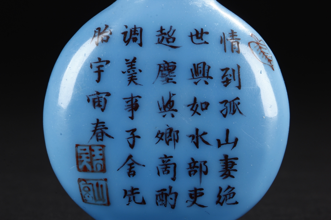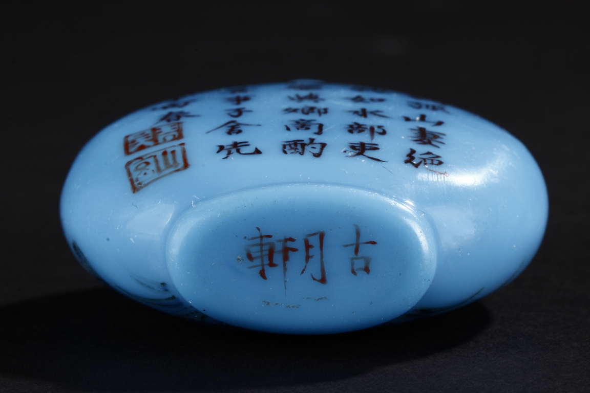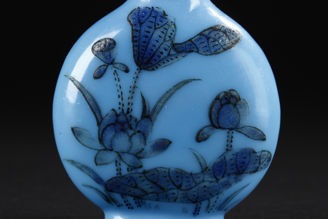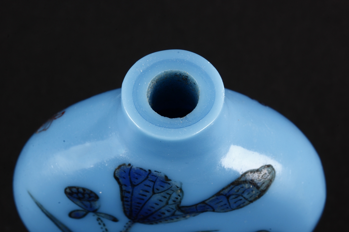 Of flattened ovoid form, the snuff bottle enameled with lotus flowers, leaves, and pods on one side, Chinese calligraphy poem on the other side, all on top of blue glass, the bottom with three character mark "GU YUE XUAN".