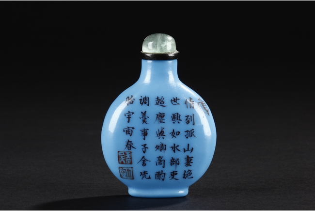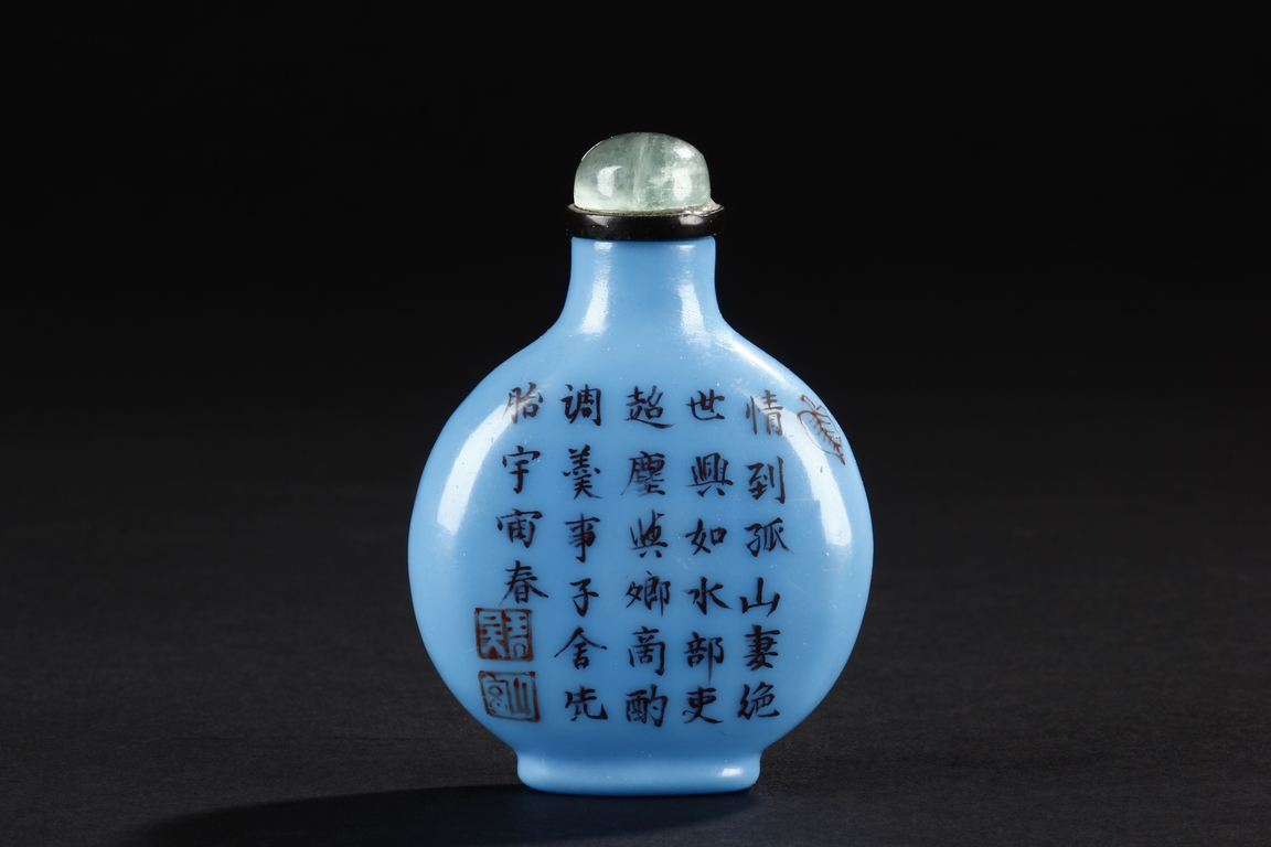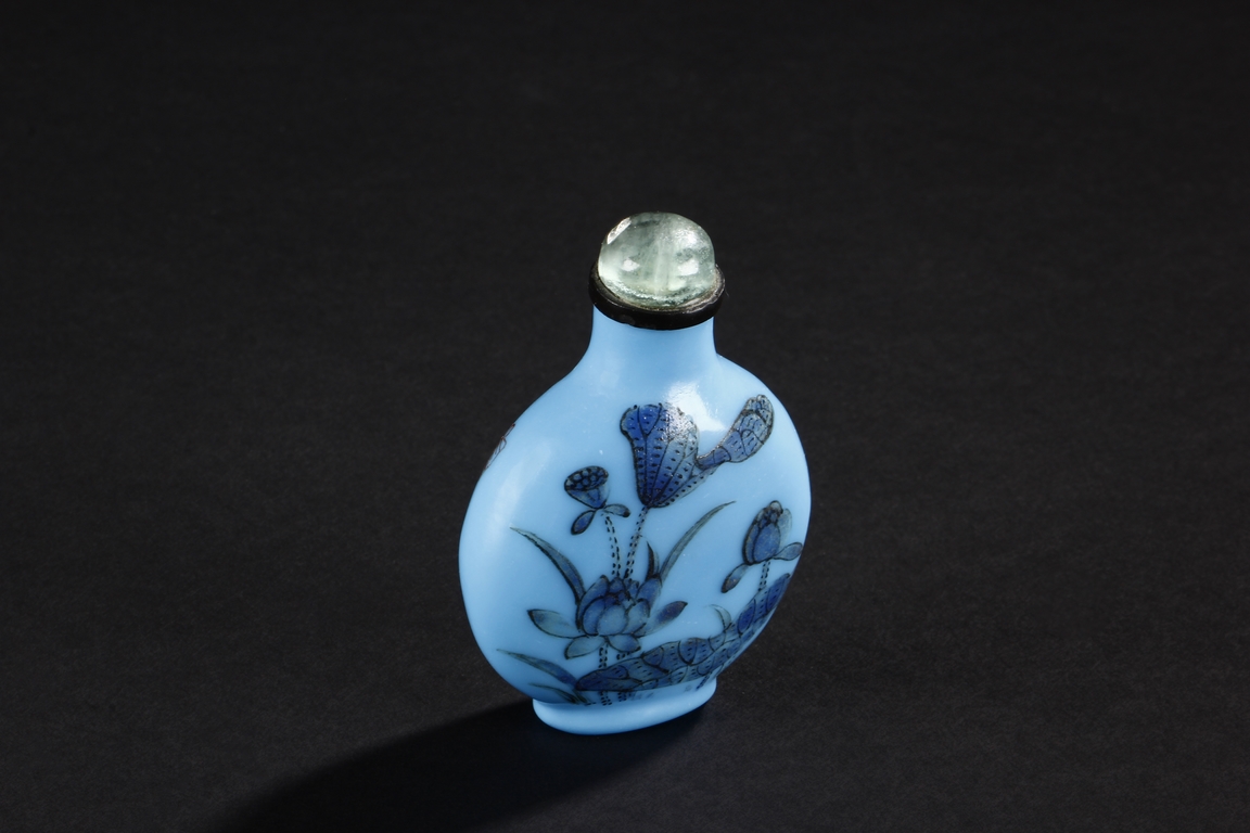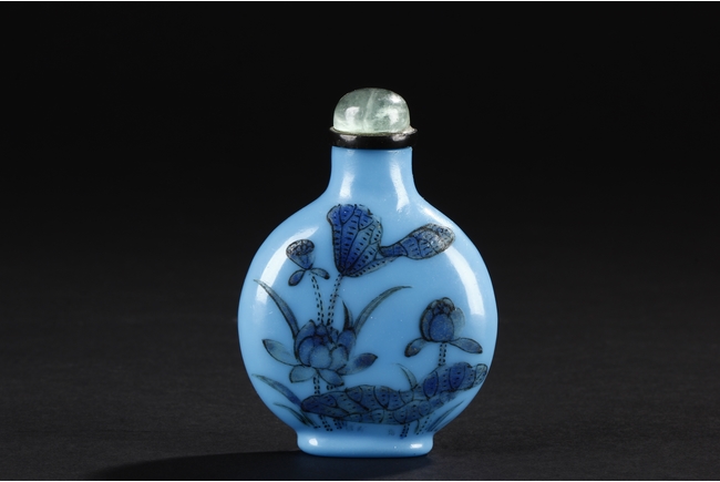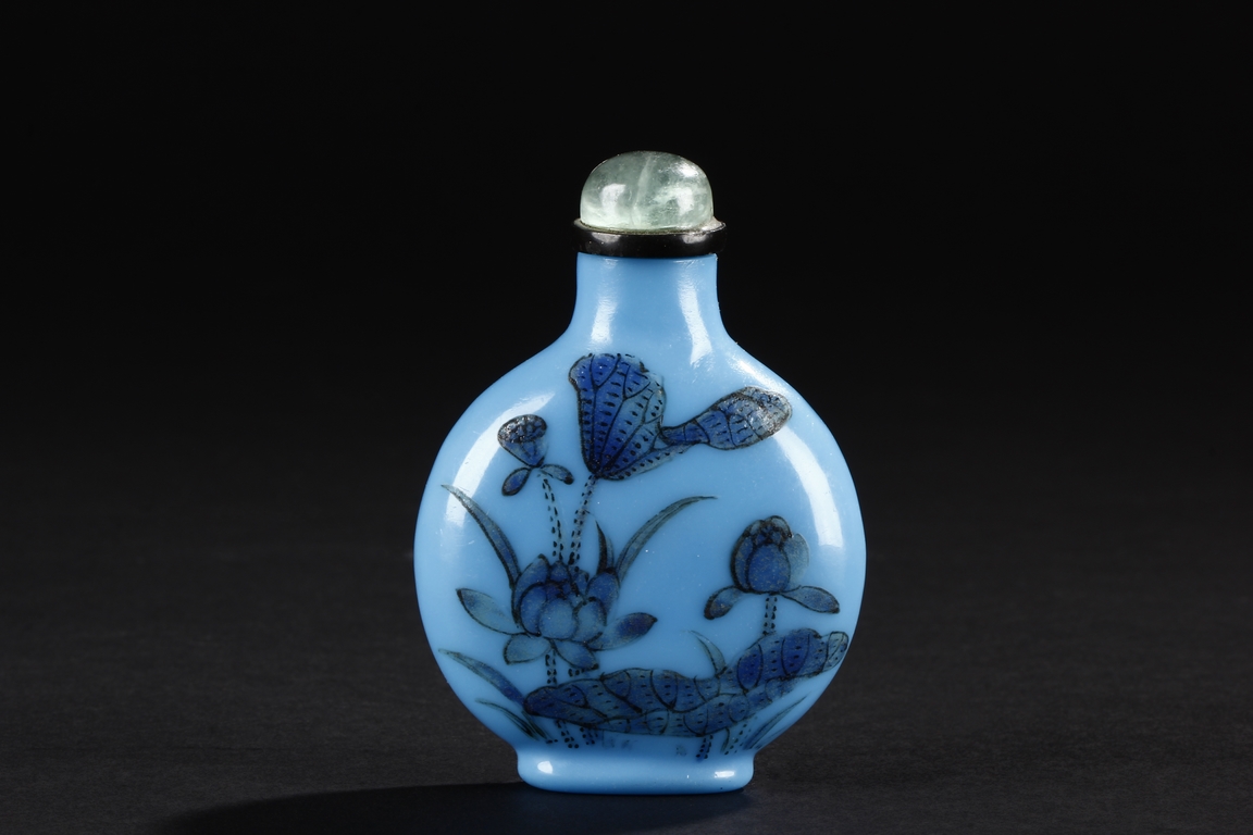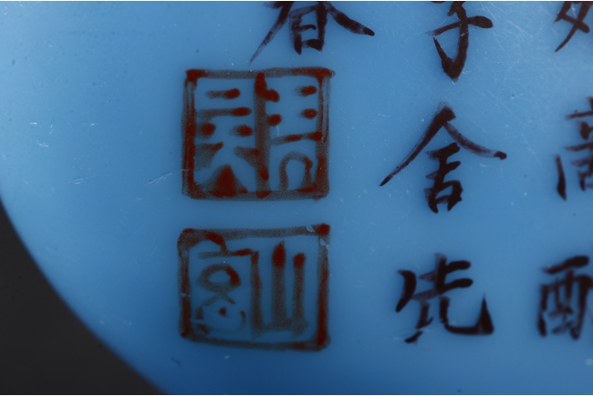 Of flattened ovoid form, the snuff bottle enameled with lotus flowers, leaves, and pods on one side, Chinese calligraphy poem on the other side, all on top of blue glass, the bottom with three character mark "GU YUE XUAN".