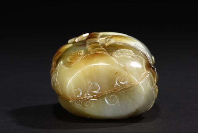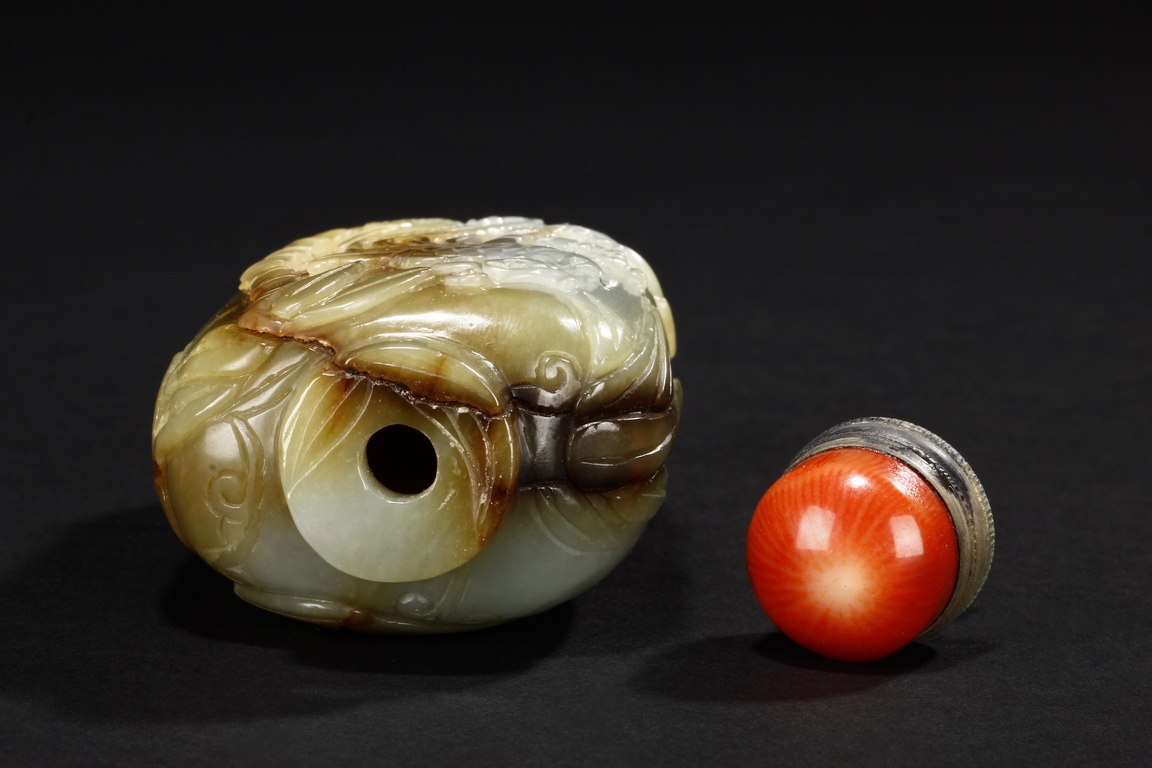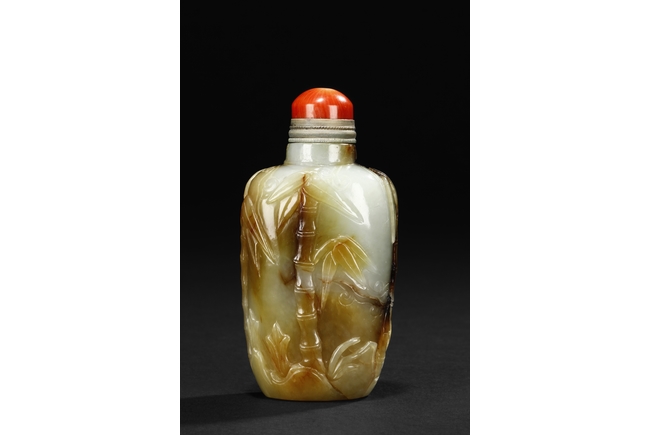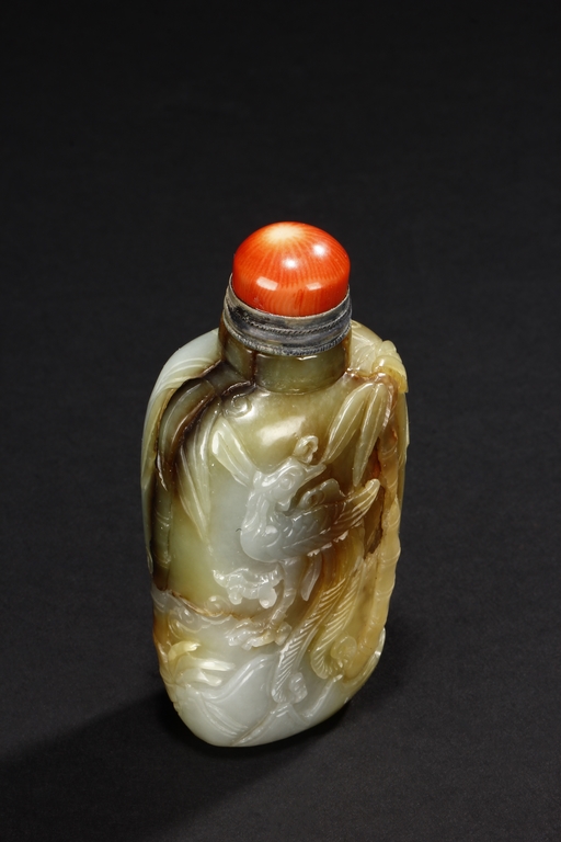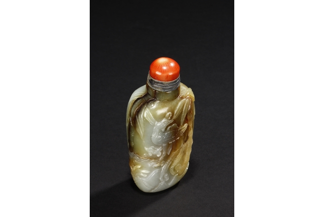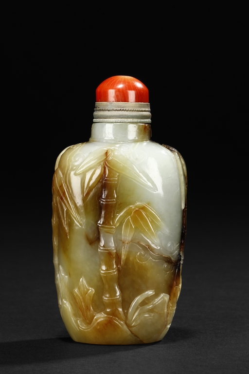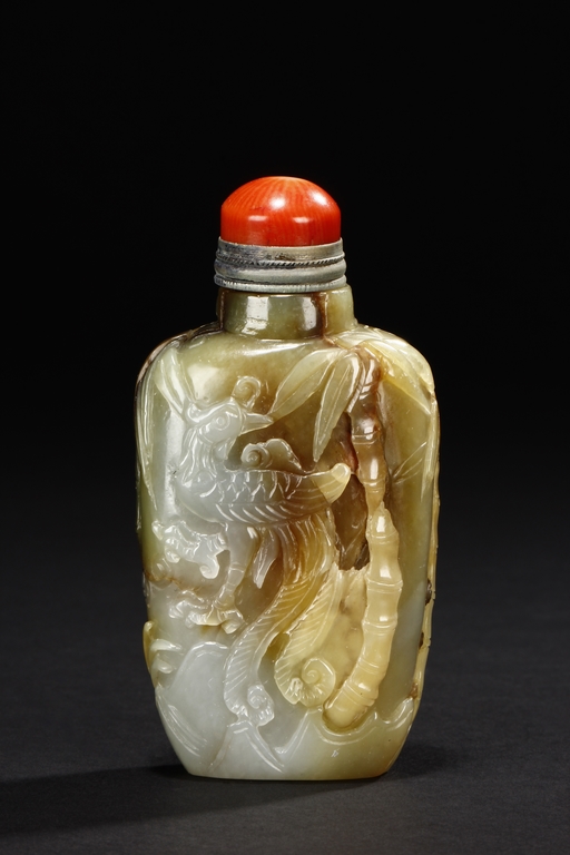 Of slightly flattened columnar form, the snuff bottle relief carved with phoenix wandering in a bamboo forest, completed by a domed coral stopper. The stone of grayish white with russet. Visible hairline on the snuff bottle.