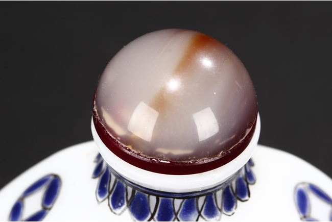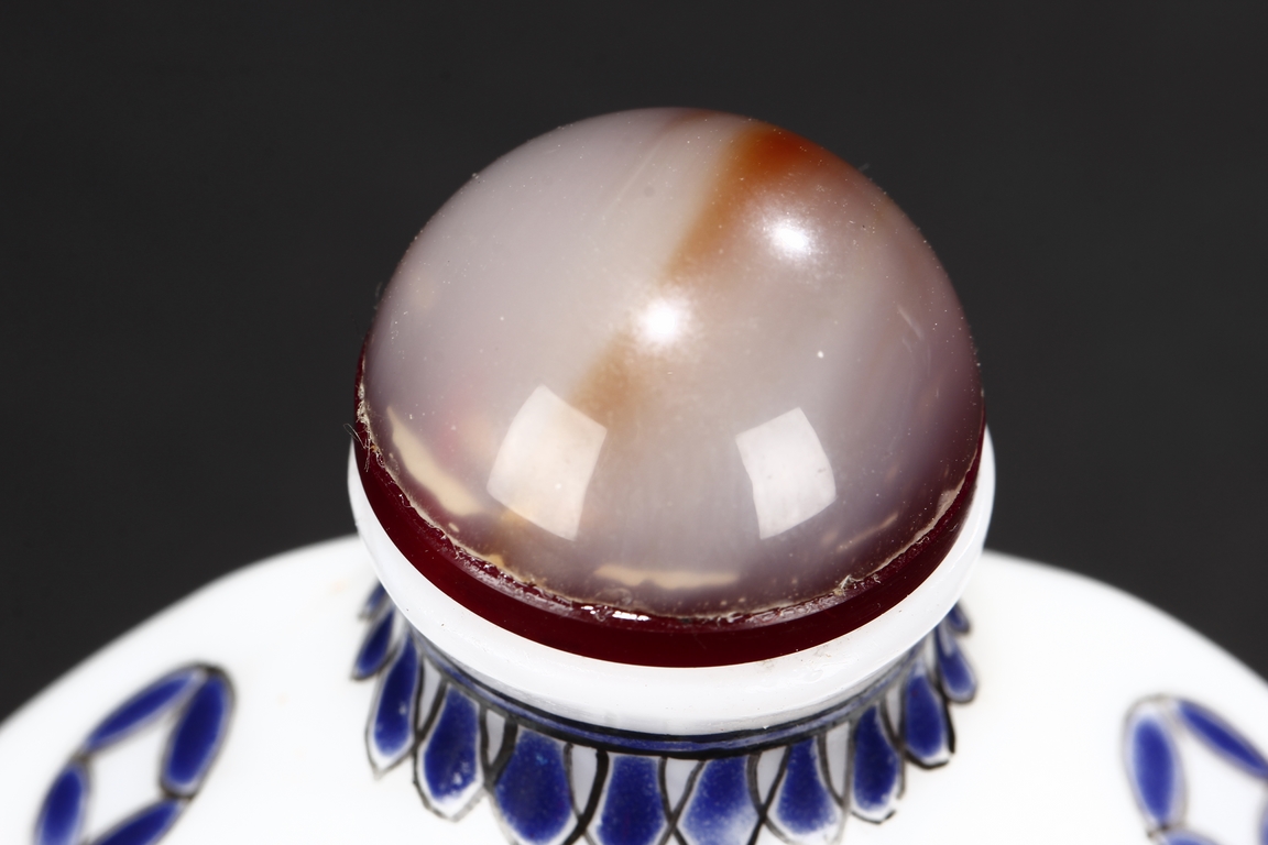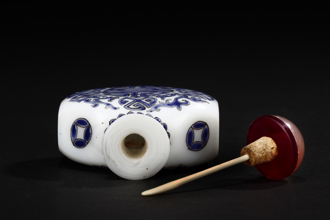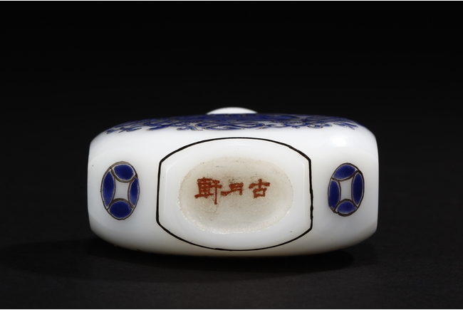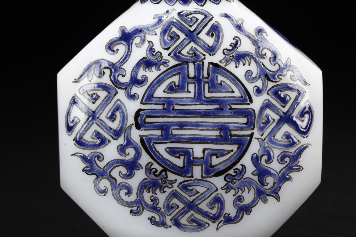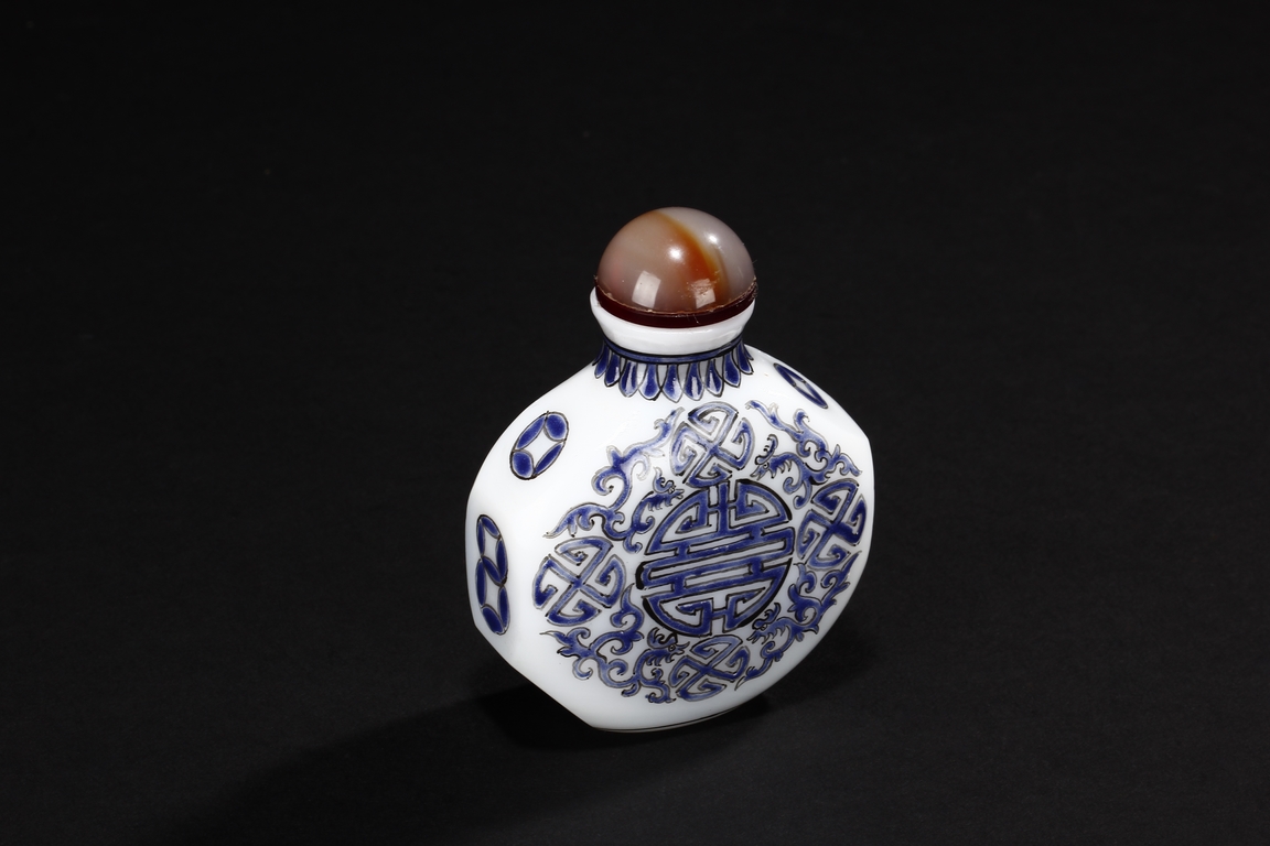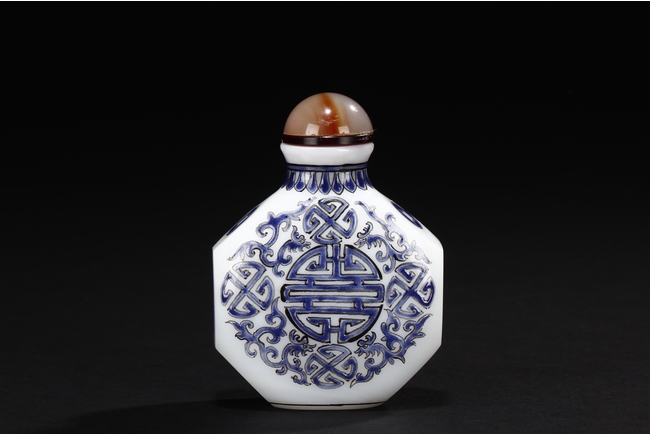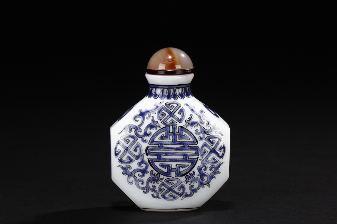 Of flattened octagonal form, the snuff bottle enameled with four dragons surrounding the center 'Shou' character, separated by four stylized circular symbols, the neck with scrolling reversed lappet patterns, the sides with coin symbols, and completed with an agate stopper. Bottom bears mark "GU YUE XUAN".