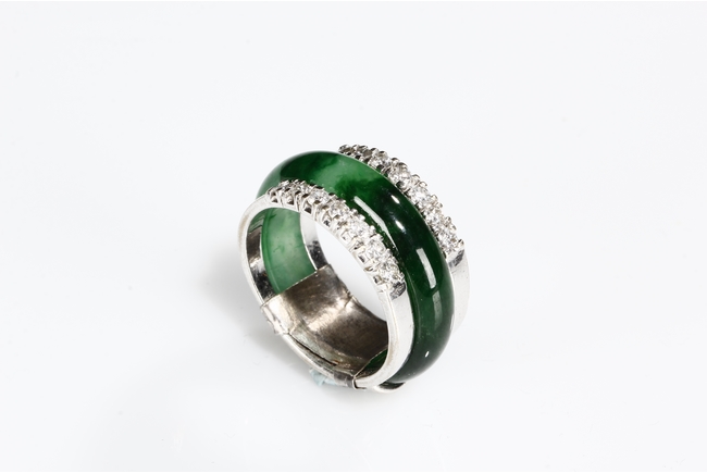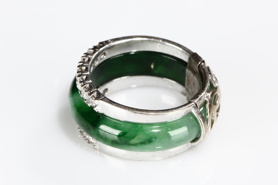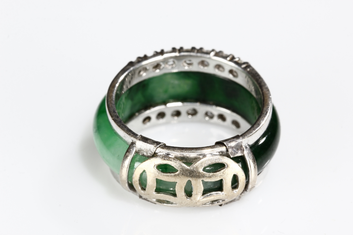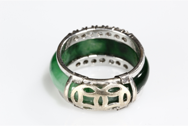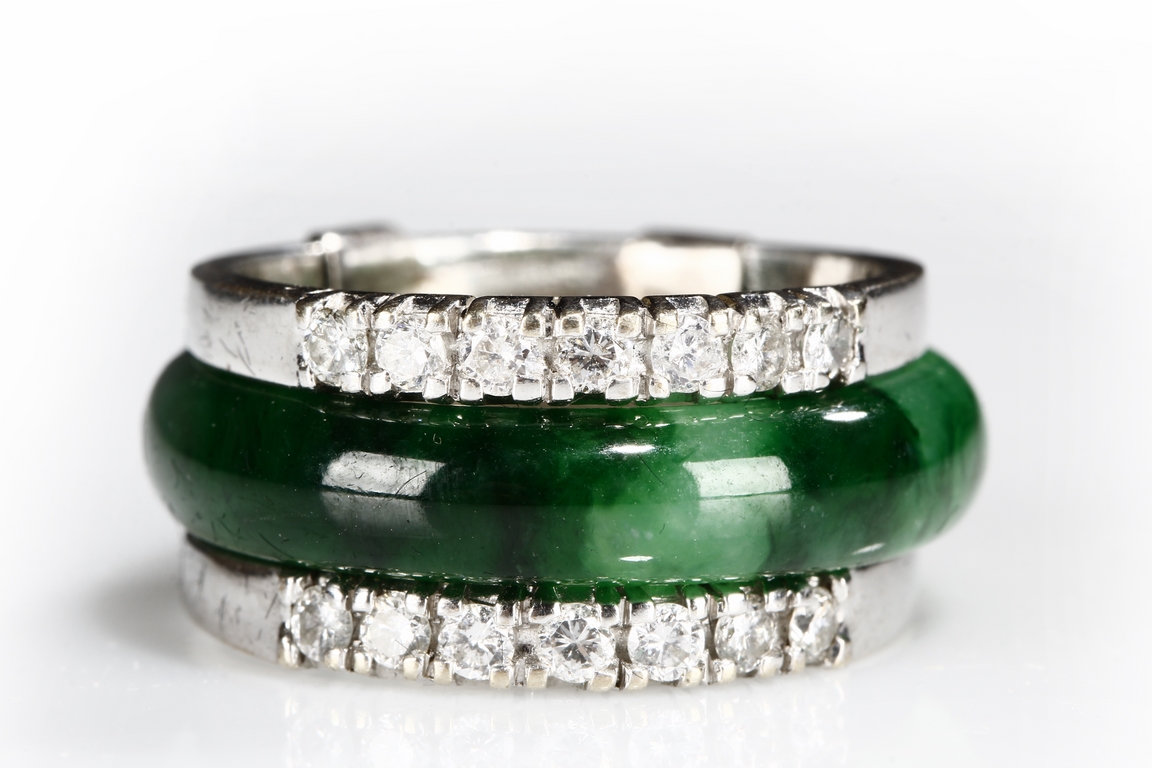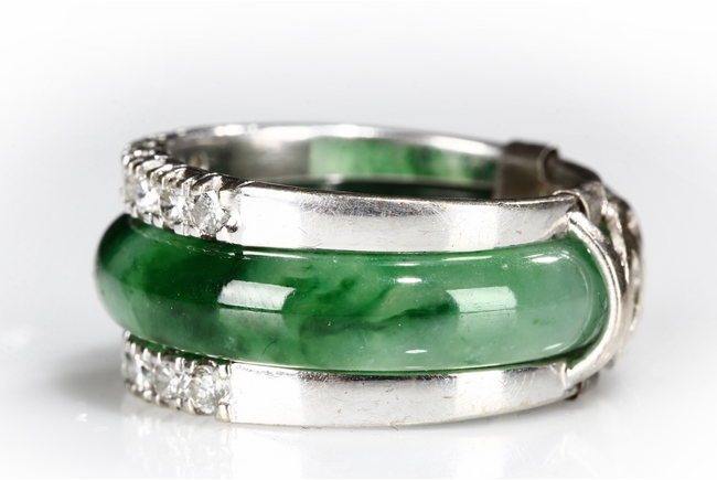 The ring made from a circular band of jadeite, ornate on top and bottom with 14 small diamonds, attached to white gold band, the reverse with yellow gold double coin setting. Total weight is 8.15 grams. Includes certificate by Cal Gems Institute as natural A jadeite with natural colors and natural diamonds, number 213J0406596.