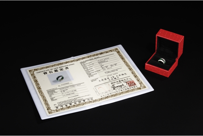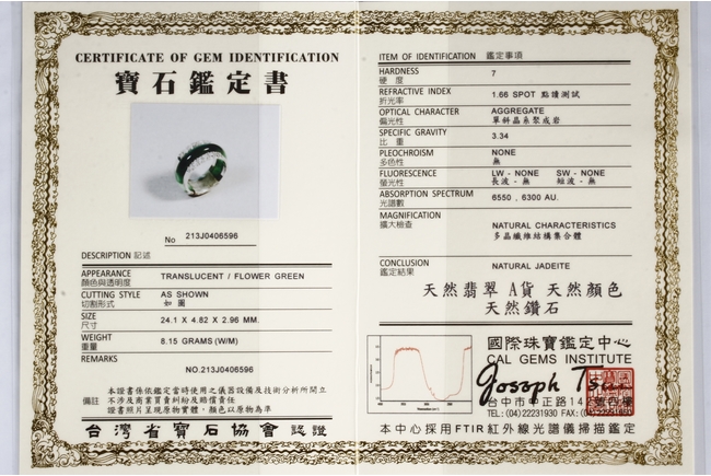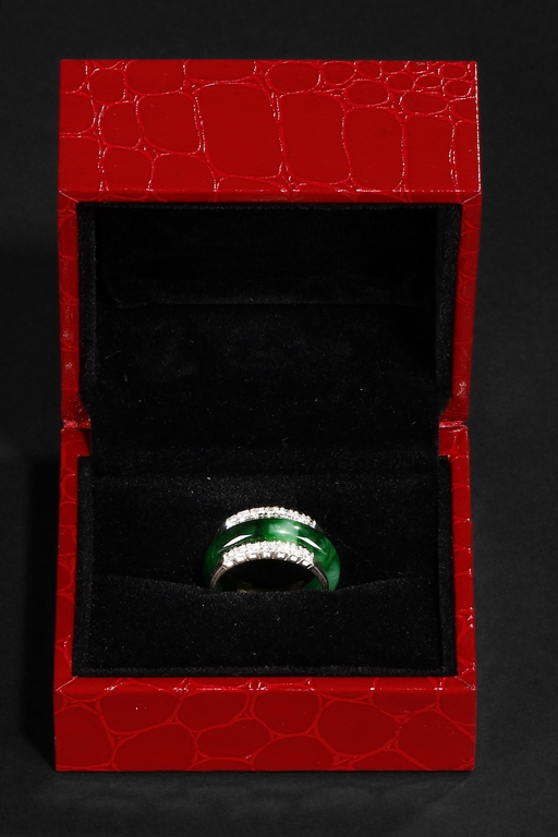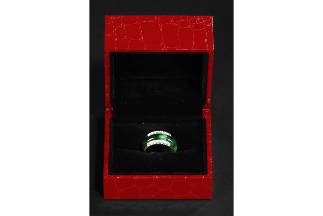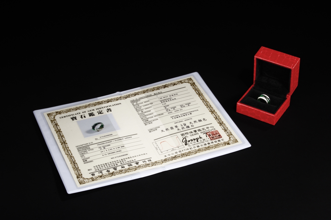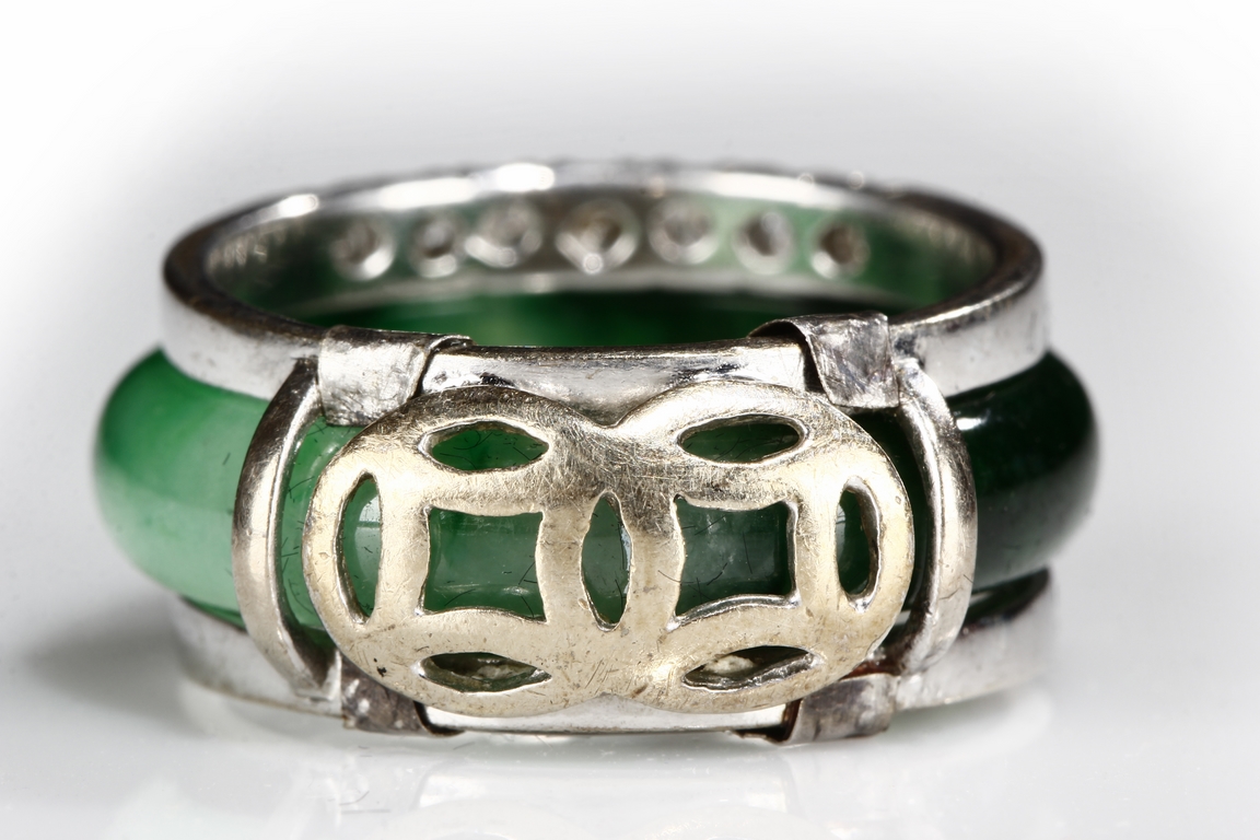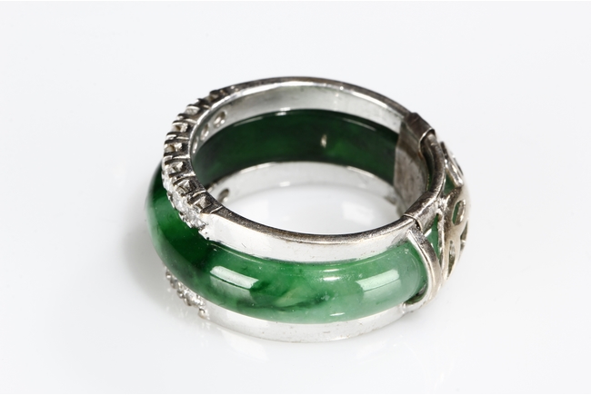 The ring made from a circular band of jadeite, ornate on top and bottom with 14 small diamonds, attached to white gold band, the reverse with yellow gold double coin setting. Total weight is 8.15 grams. Includes certificate by Cal Gems Institute as natural A jadeite with natural colors and natural diamonds, number 213J0406596.