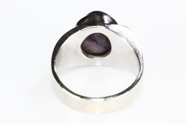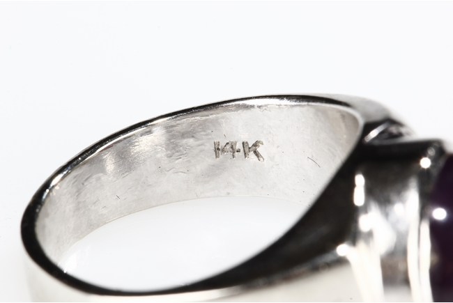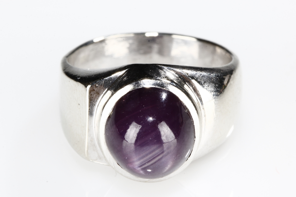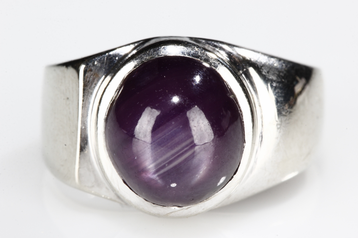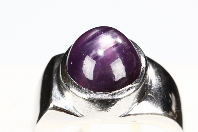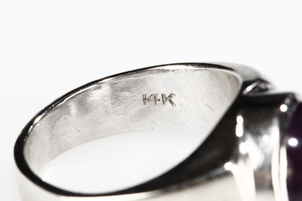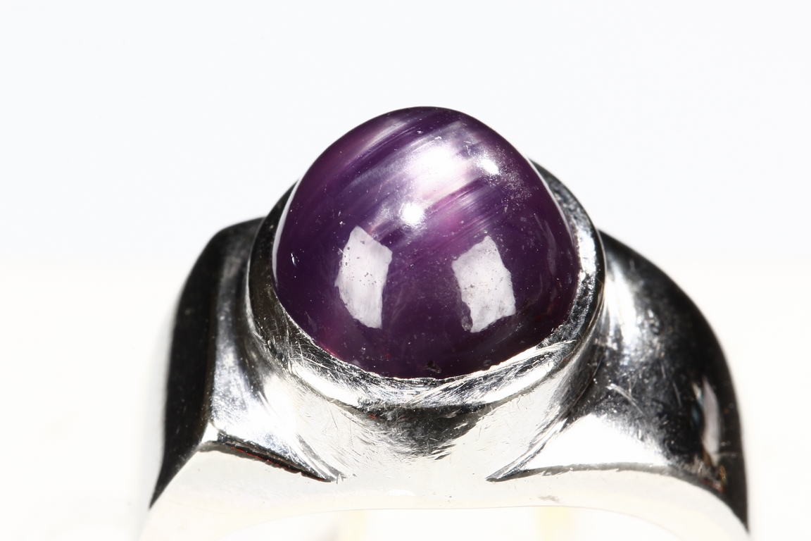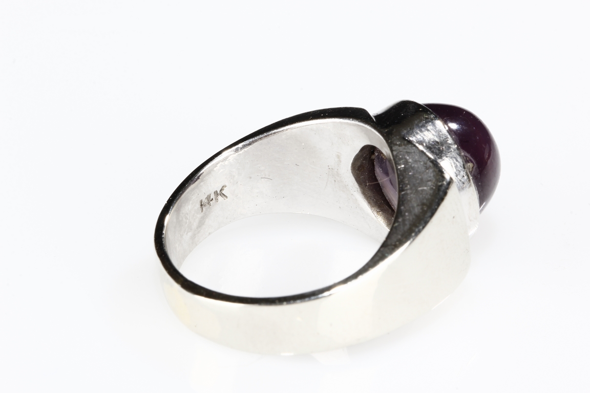 The ring features a large round star ruby, measuring approximately 9mm diameter, inset into a 14k white gold band. Visible hairline on the star ruby.