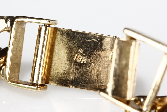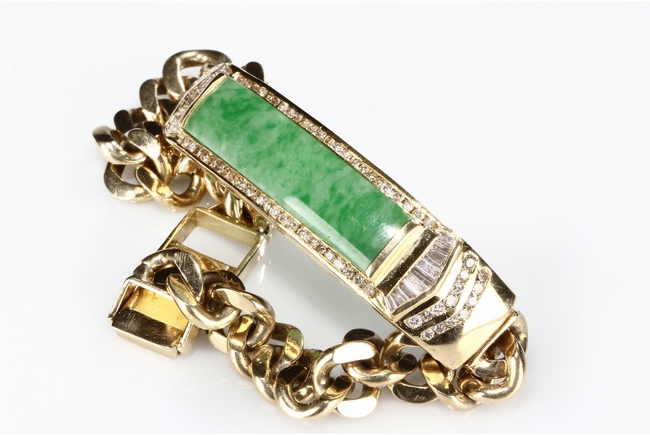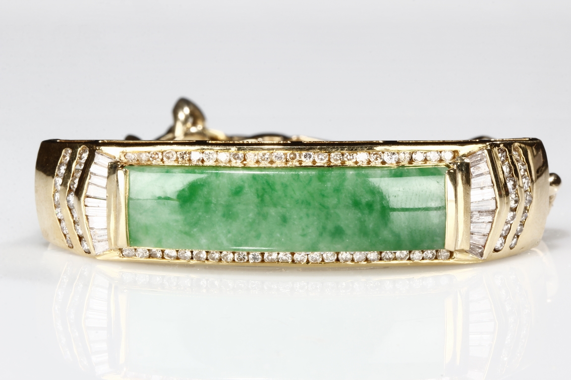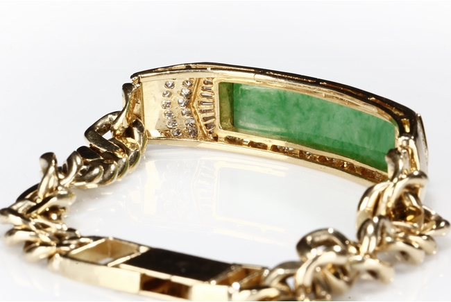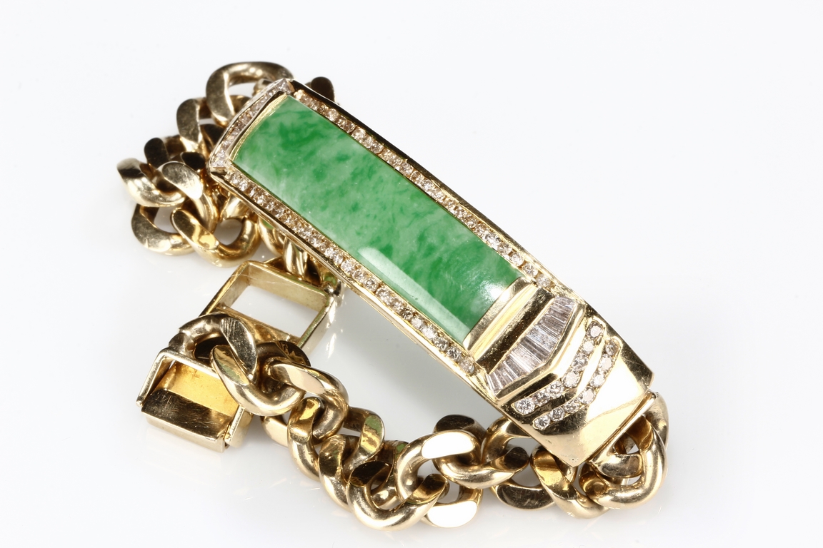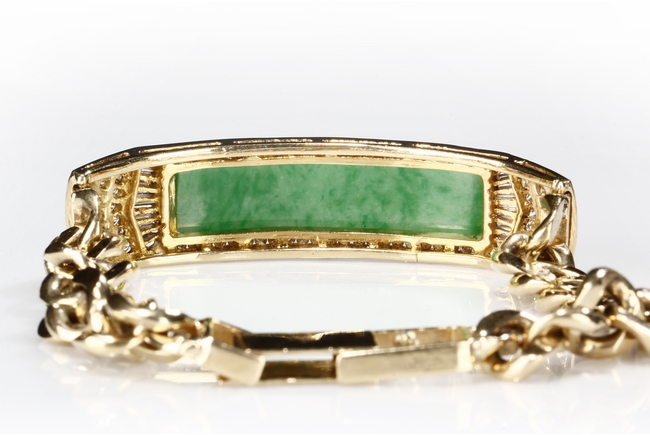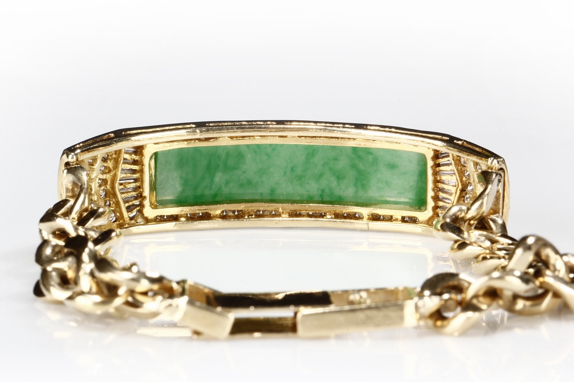 The rectangular jadeite is of apple green and white color, inset into a 18k yellow gold chain bracelet, surrounded by loose diamonds of different cuts.