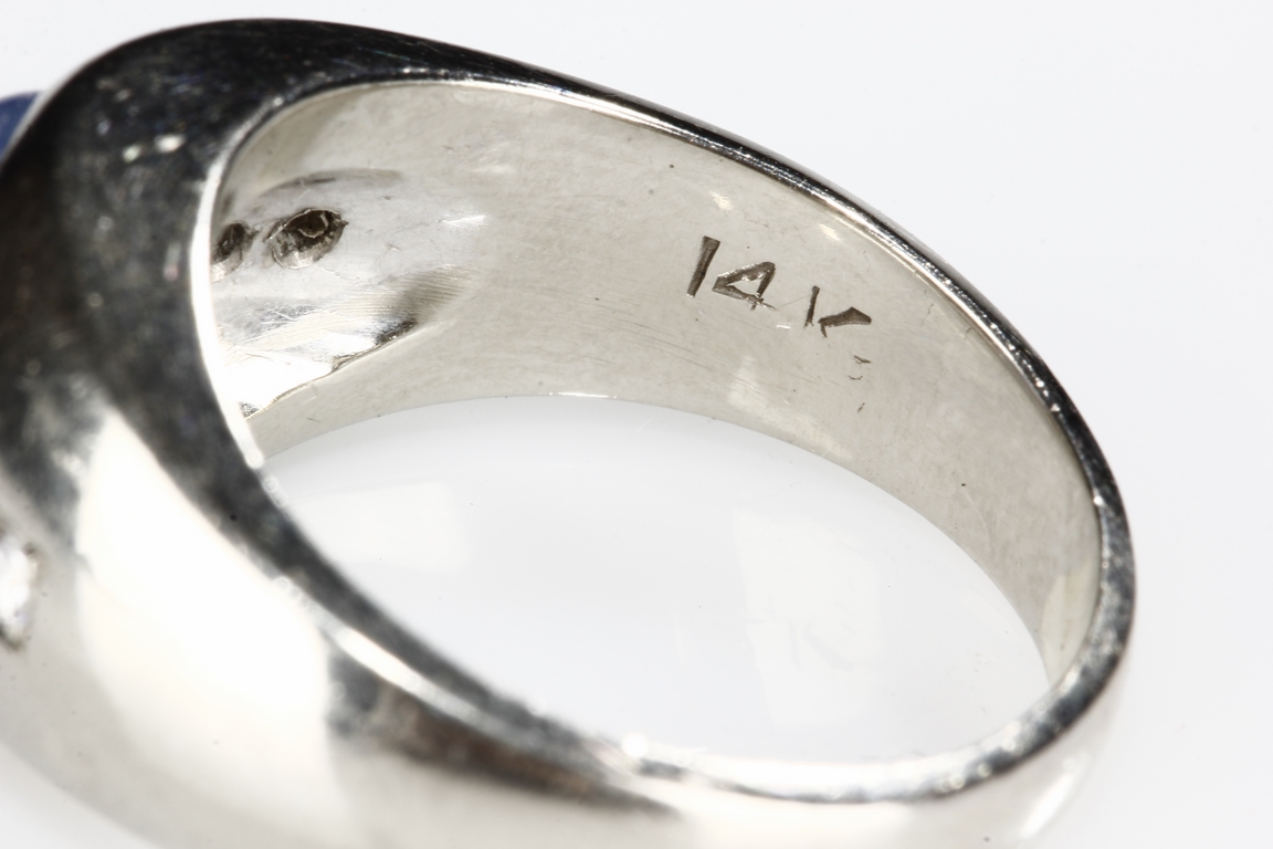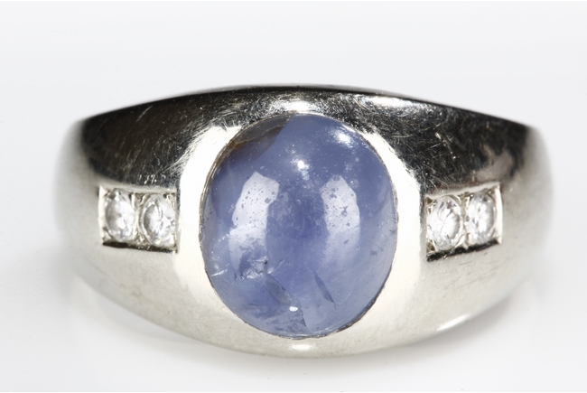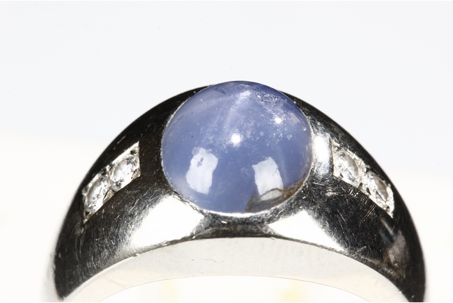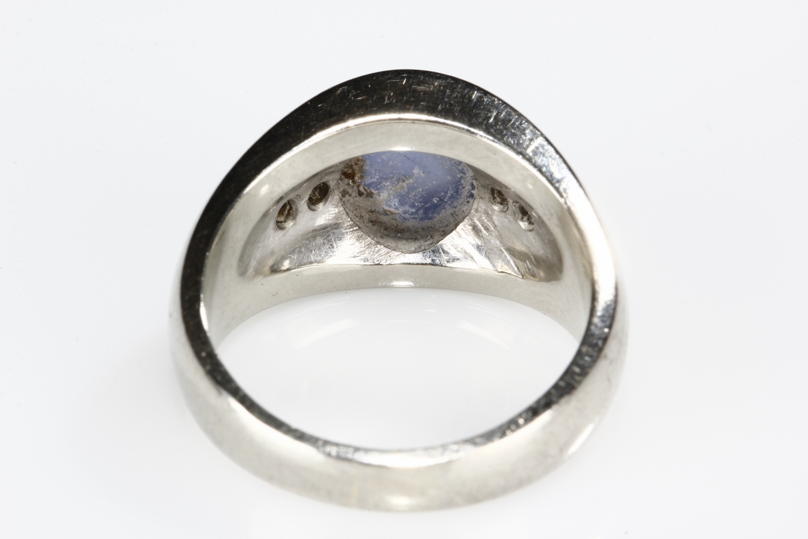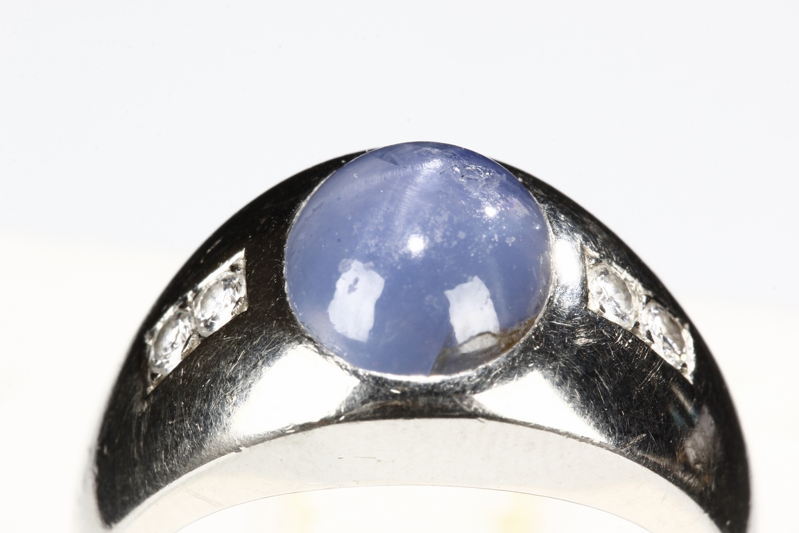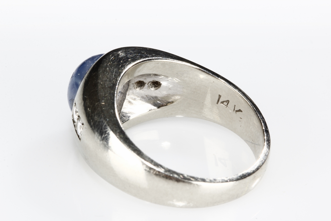 The ring features a star sapphire, measuring approximately 7mm, inset into a 14k white gold band, along with four small diamonds. Minor imperfections on the gemstone.