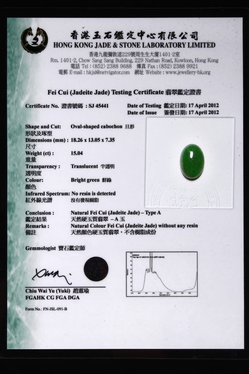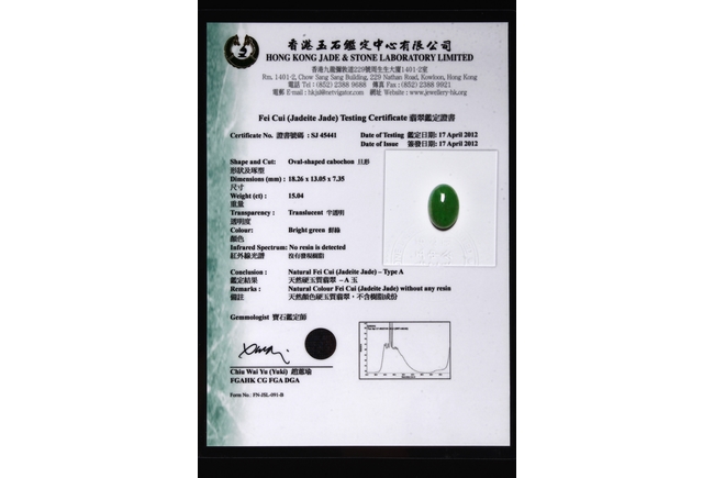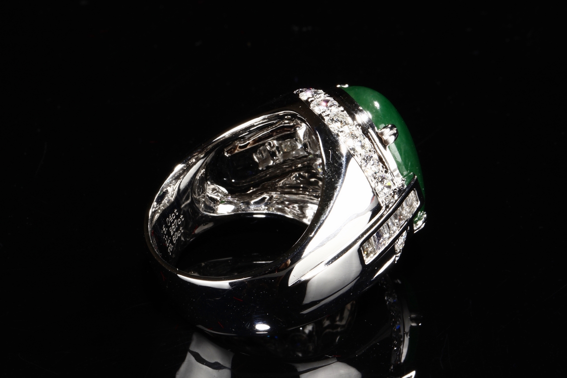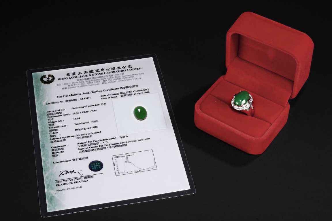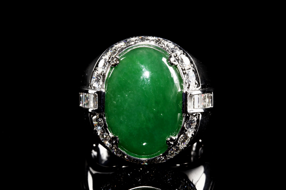 Type A untreated natural jadeite with an AIGS test certificate no. GF13040873 indicating no polymer impregnation or dyeing.Heavy and big ring size: 9.