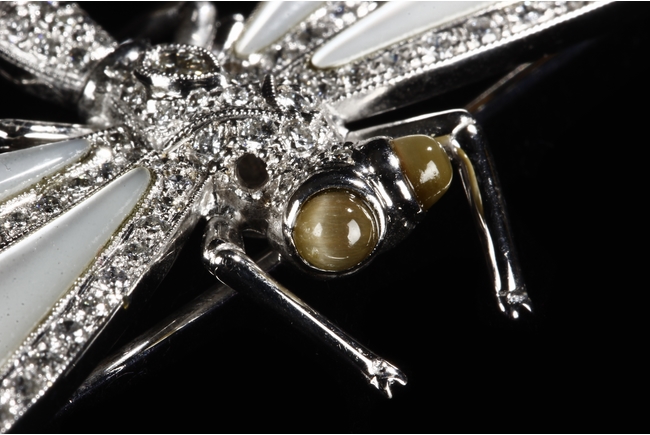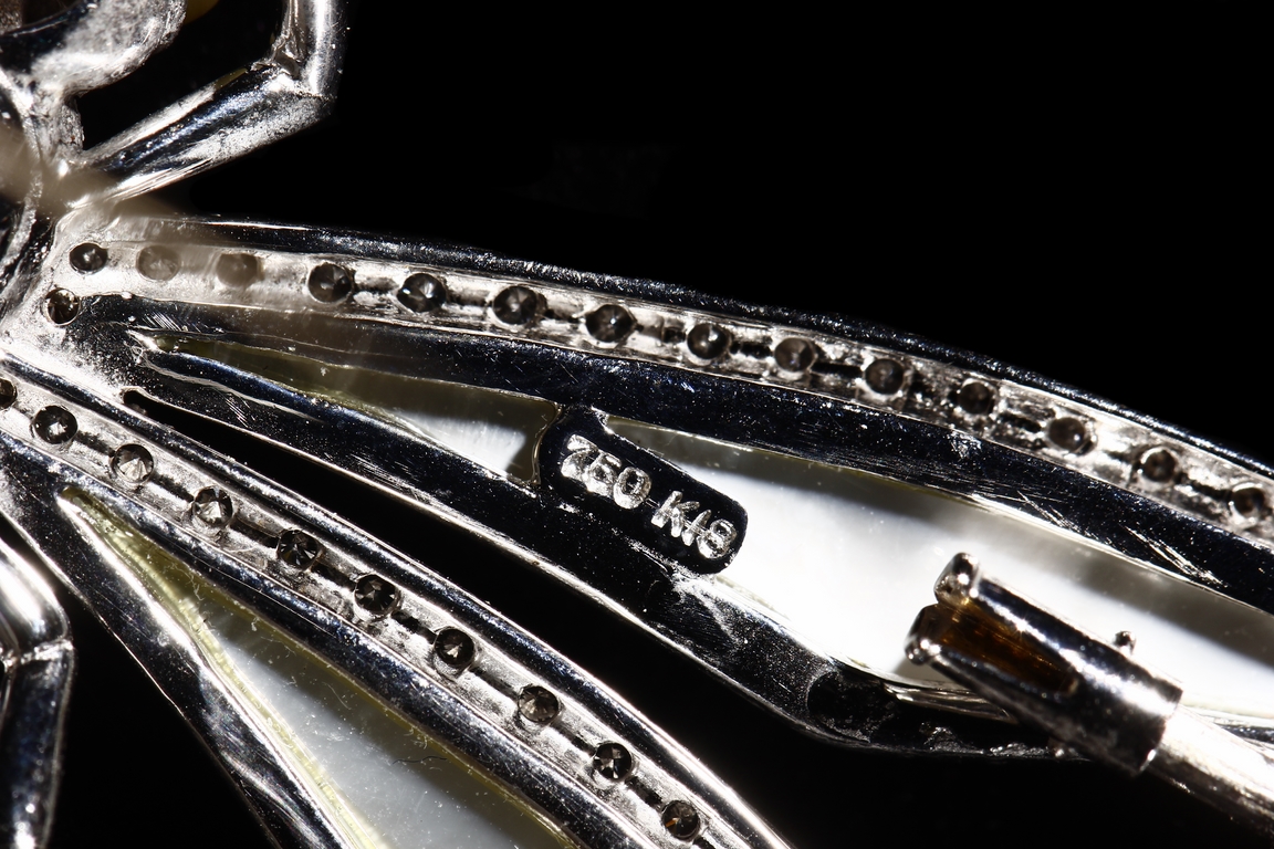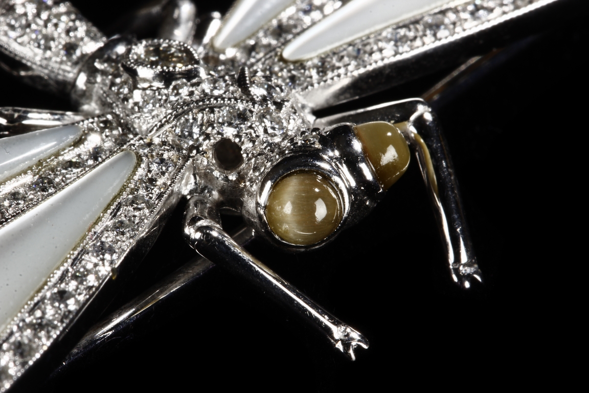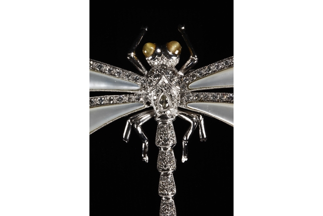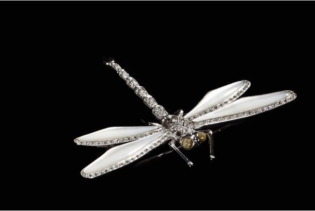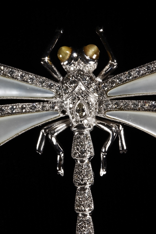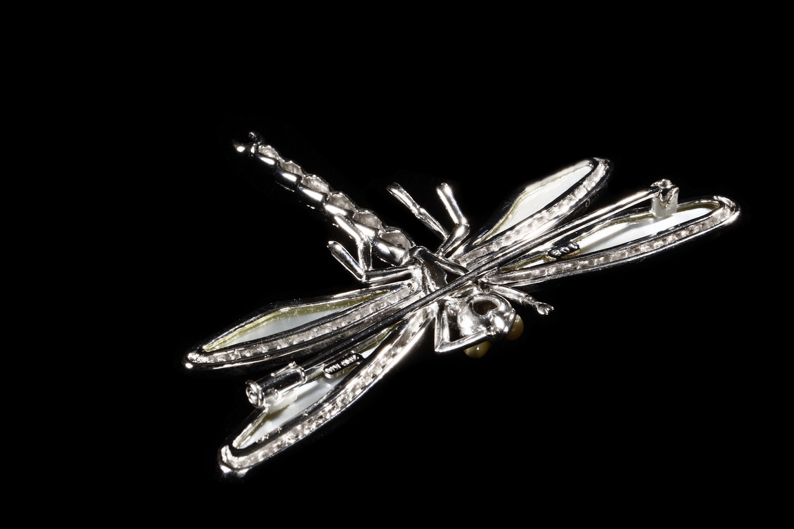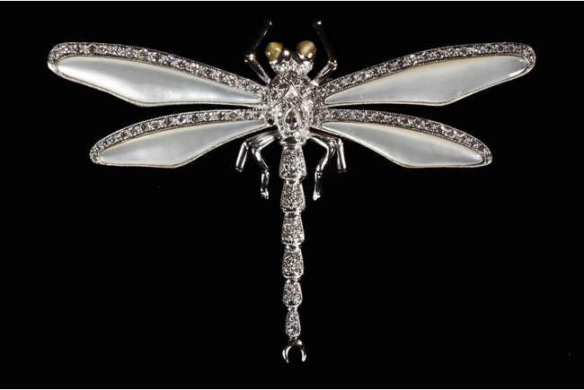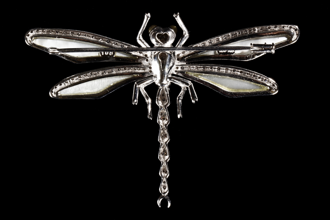 The beautiful dragonfly pin made from 18k white gold, and it is decorated with 1.08 total carat weight of diamonds, with two mother of pearl as eyes. Missing two stones near end of wing.