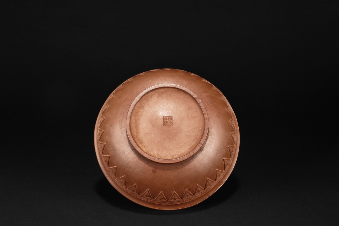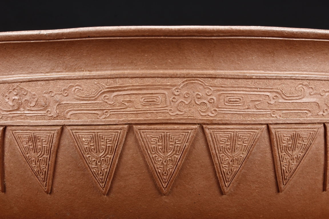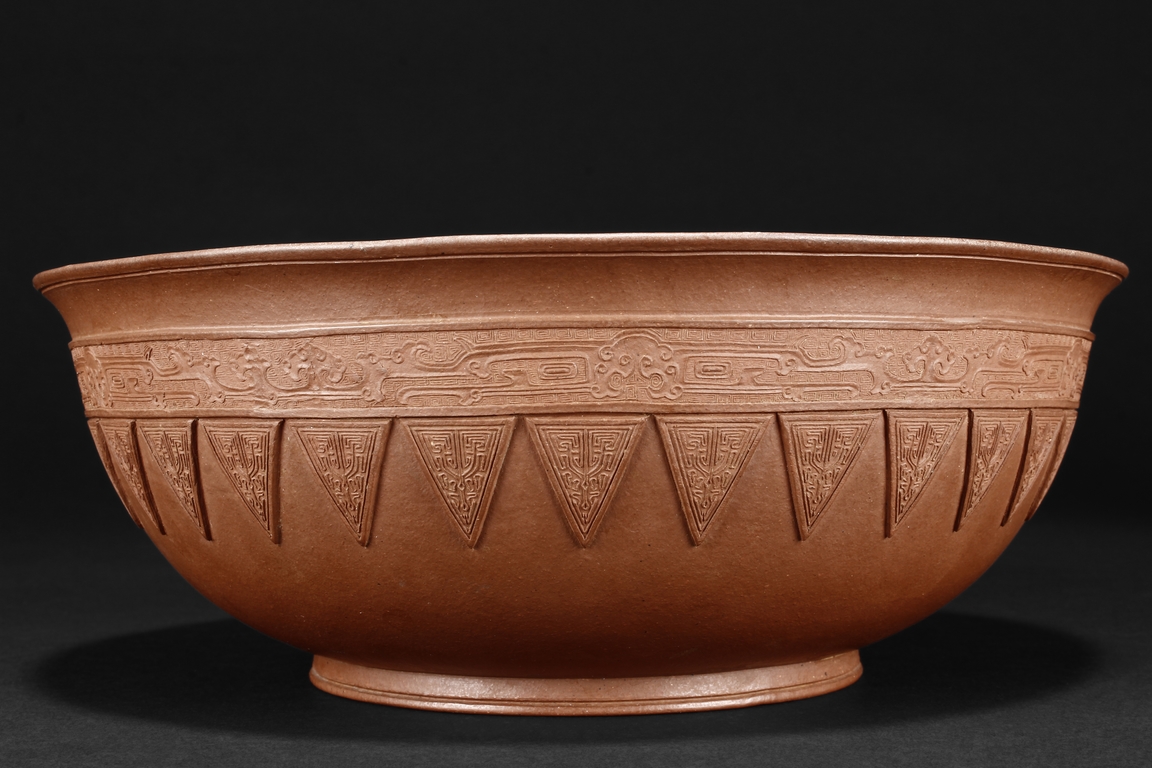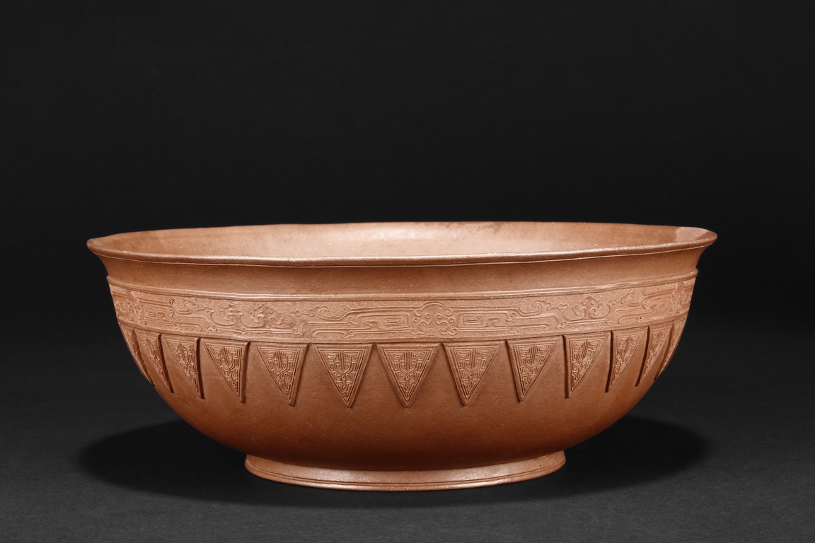 The bowl made from red clay, the rim flared, the body tapering gently to the ring foot, the exterior with detailed scrolling band of chilong on top of key-fret patterns, above inverse triangular form enclosing beast mask patterns, the bottom with four character mark “Xu Ru Cheng Zhi”. Sign of repair at rim.