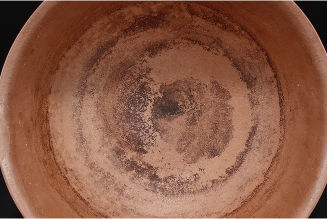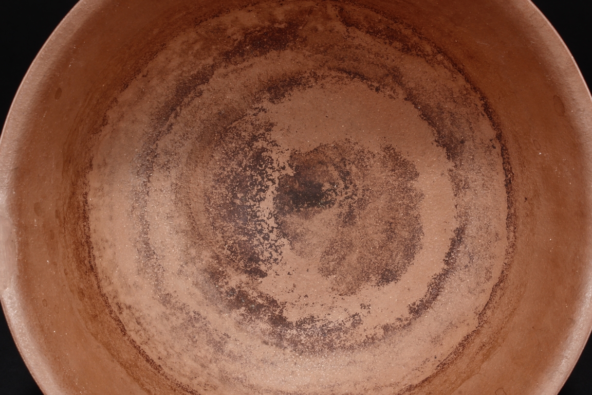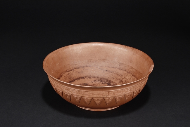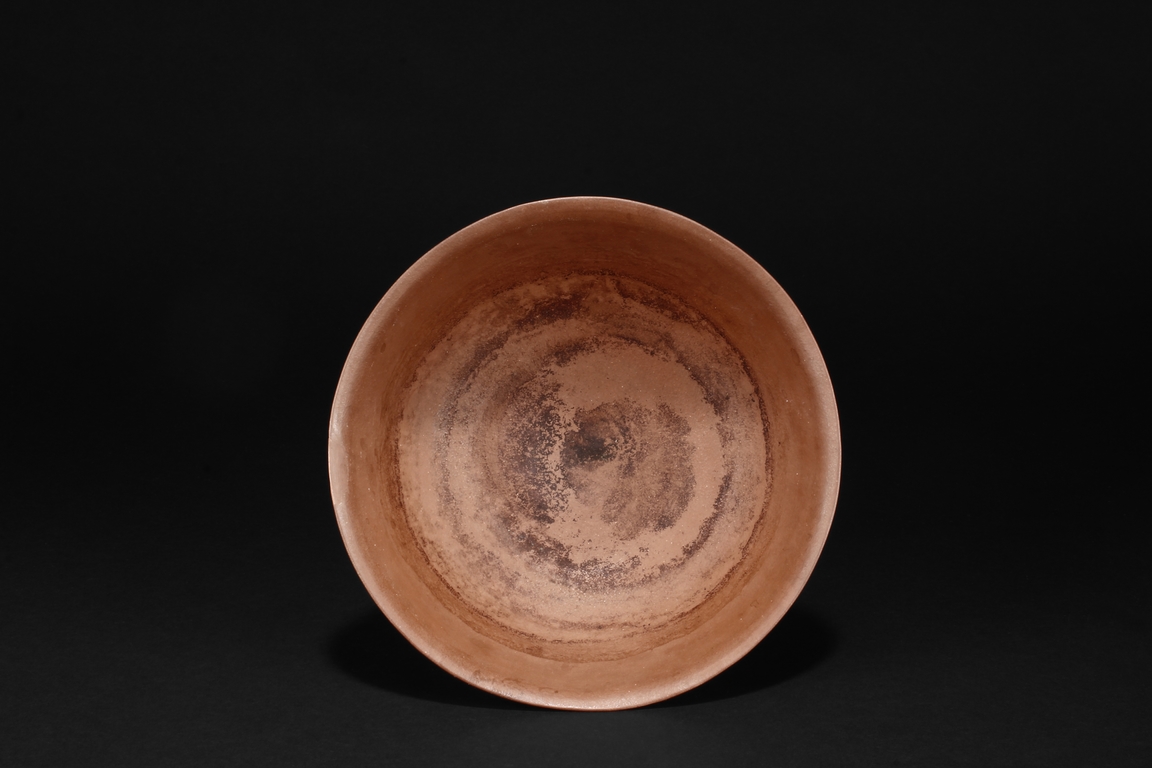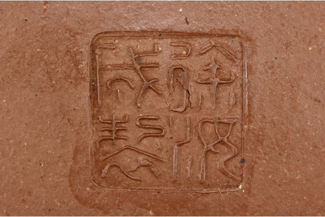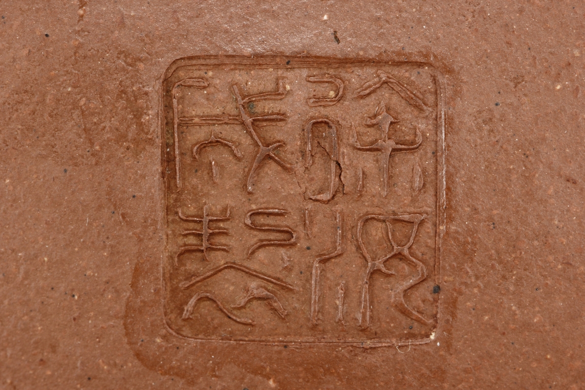 The bowl made from red clay, the rim flared, the body tapering gently to the ring foot, the exterior with detailed scrolling band of chilong on top of key-fret patterns, above inverse triangular form enclosing beast mask patterns, the bottom with four character mark “Xu Ru Cheng Zhi”. Sign of repair at rim.