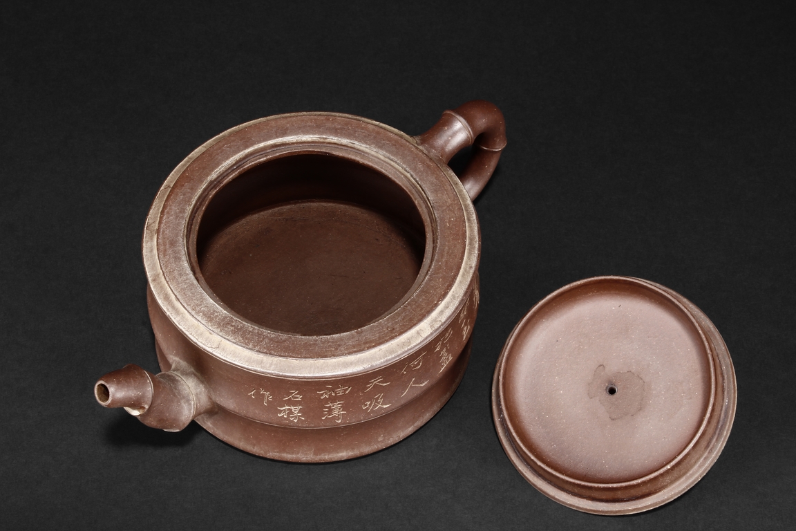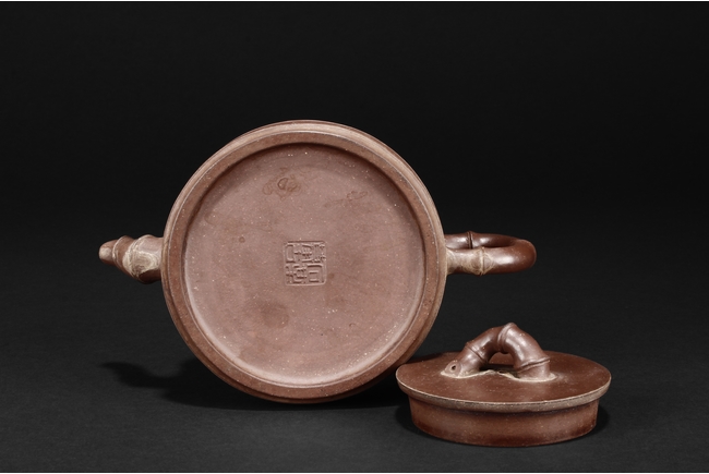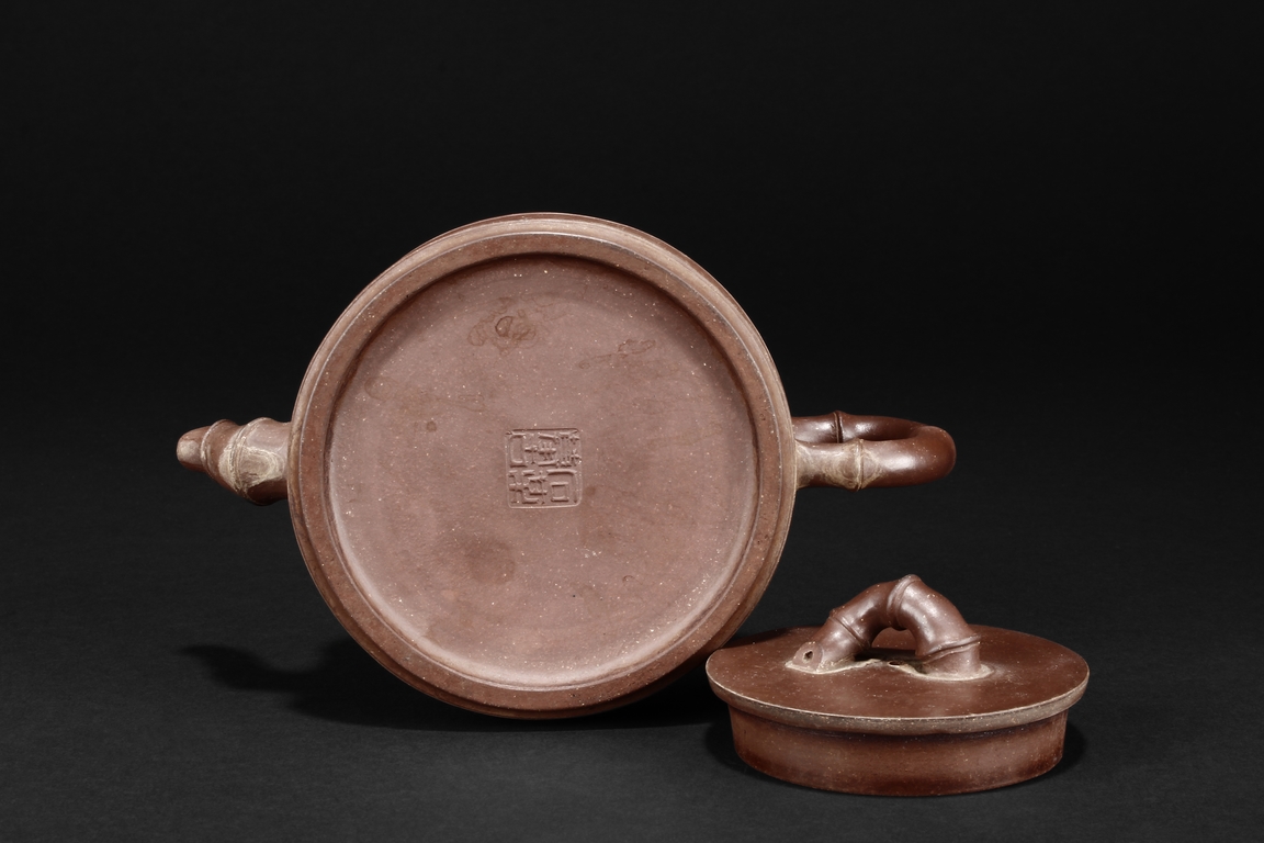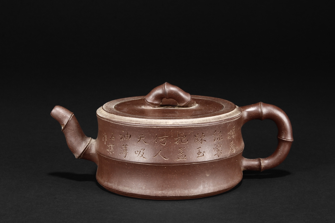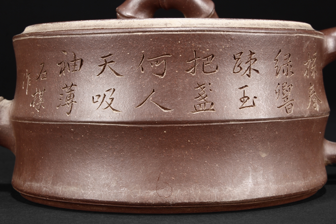 Of round bamboo sections form, the teapot features similarly sized and bamboo shaped spout, handle, and finial, the side incised with calligraphy poetry written by “Shi Mei”, with additional four character artist mark on the bottom.