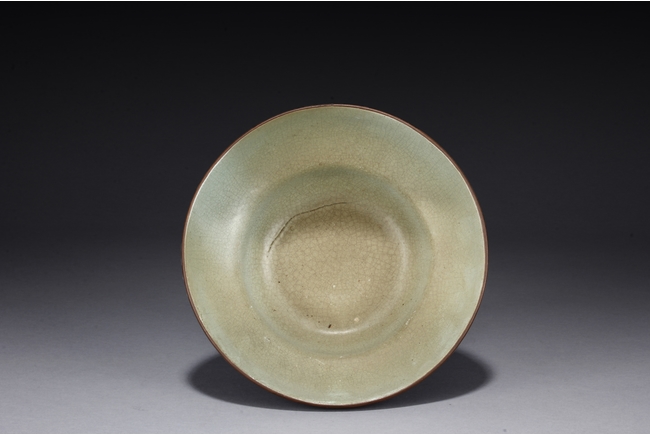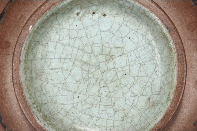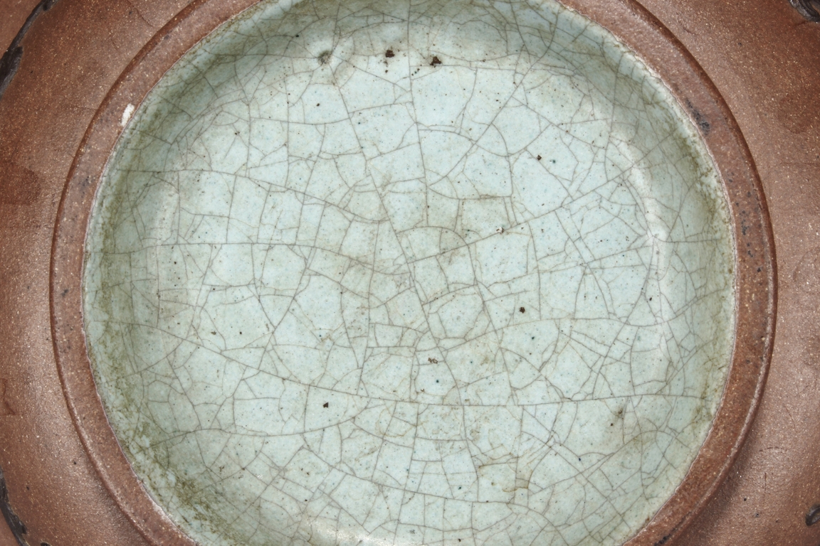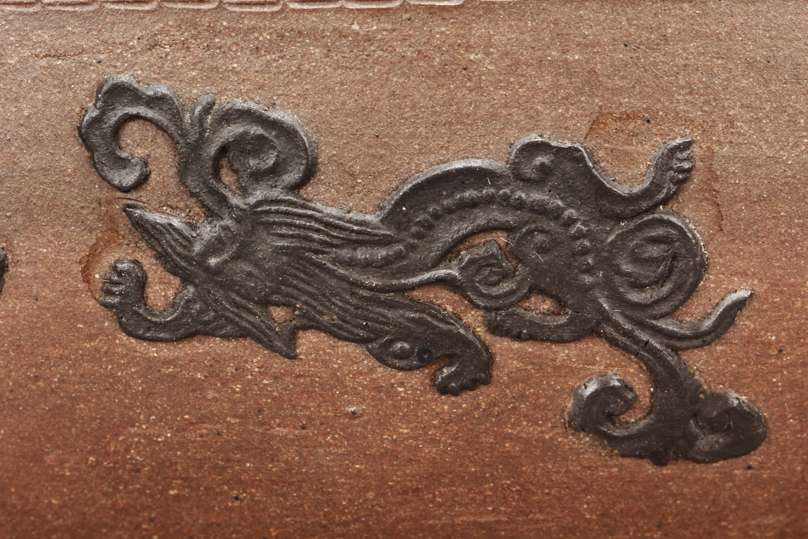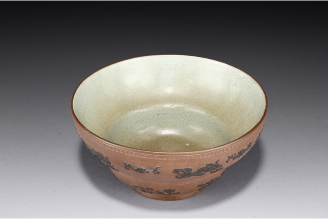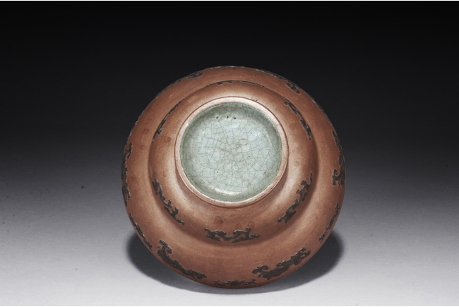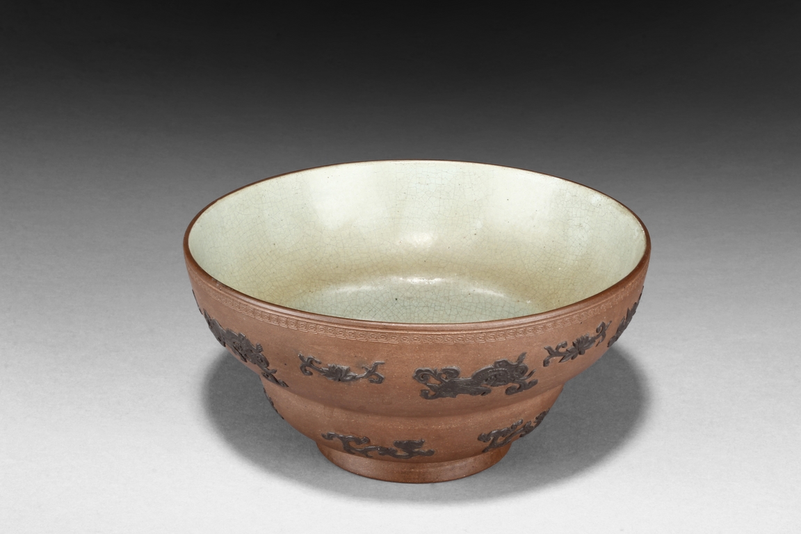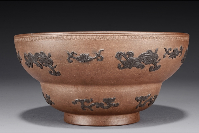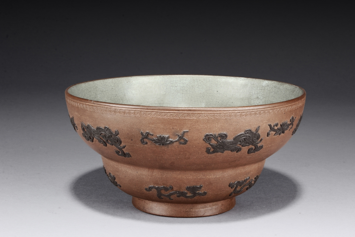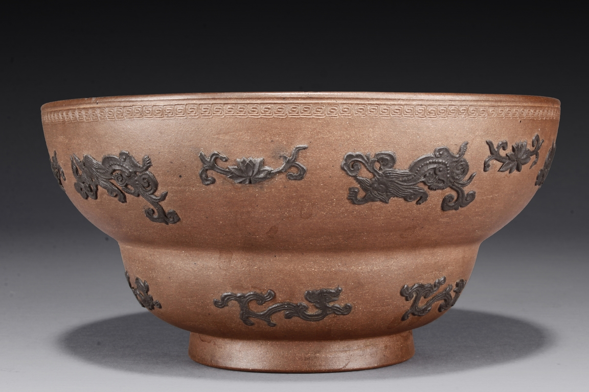 The bowl tapering twice at the body, supported by a ring foot, the exterior of brown color, the top rim incised with scrolling band of key-fret patterns, with a band of chilong alternating with flowers pasted, and another band of smaller chilong pasted below, the interior and bottom of bowl glazed with crackle patterns. Mid Qing Dynasty period.
