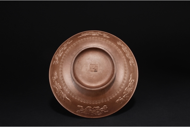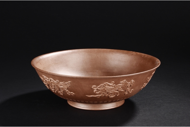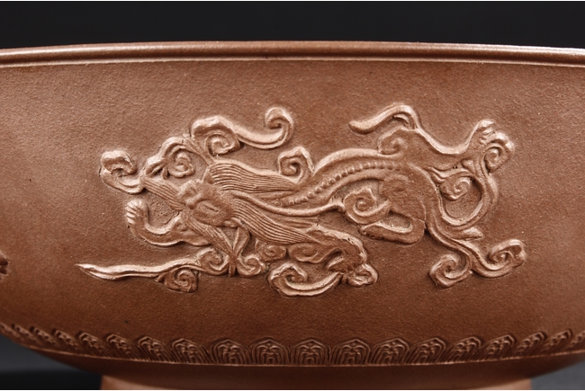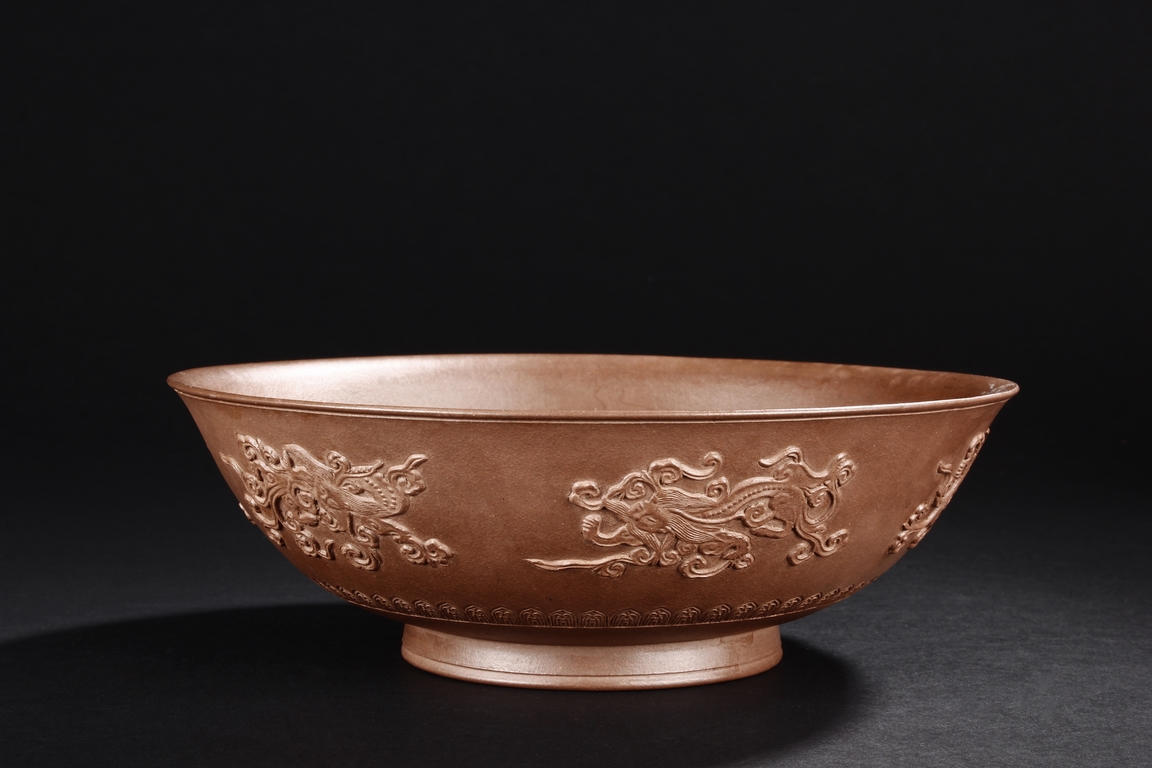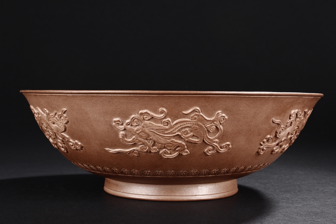 The the shallow bowl tapers quickly to a ring foot, with slightly flaring rim, the body decorated with a band of six chilong, above scrolling band of lappet patterns. Bottom bears three character mark “Lu Ming Chun”.