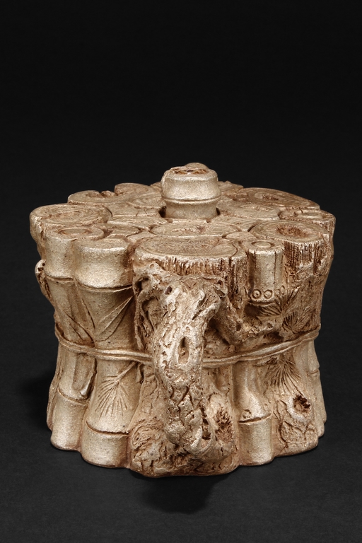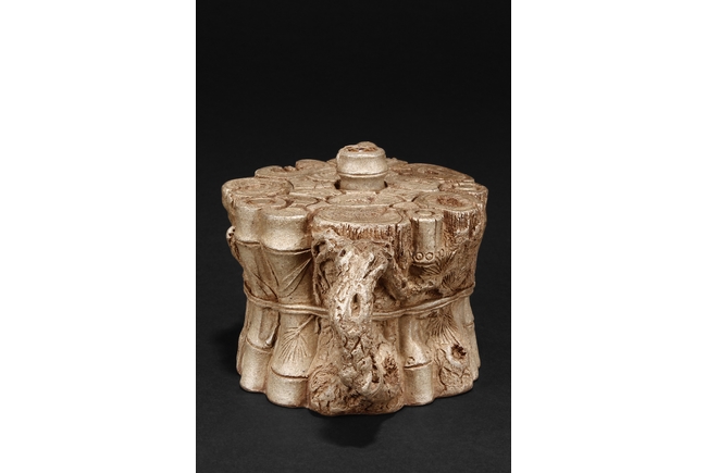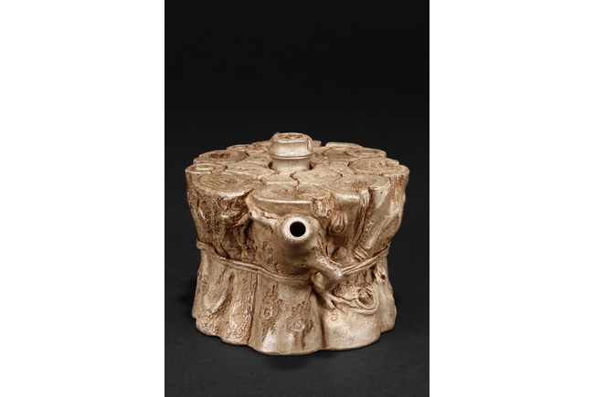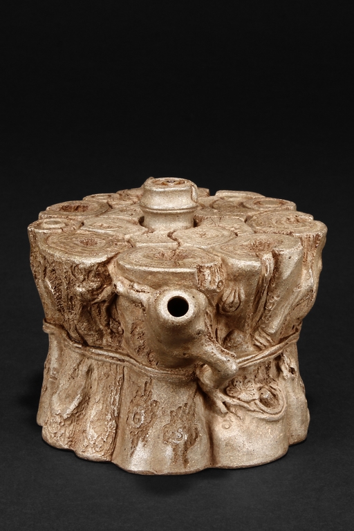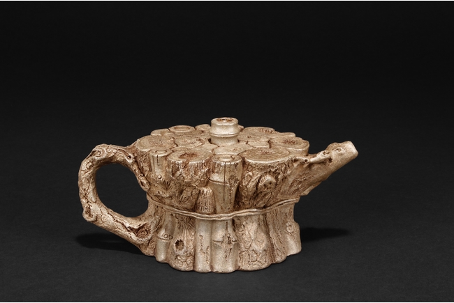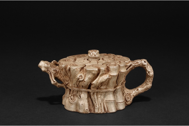 The teapot designed as bundles of wood including bamboo, with waisted body, a naturalistic branch extending outwards as the spout, and a curved C shaped branch as handle, the finial is a bamboo section raising higher than the other woods. Bottom bears colophon and two character artist signature “MINGYUAN”, additional four character artist stamp impressed below.