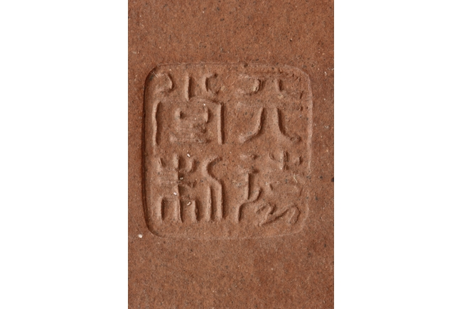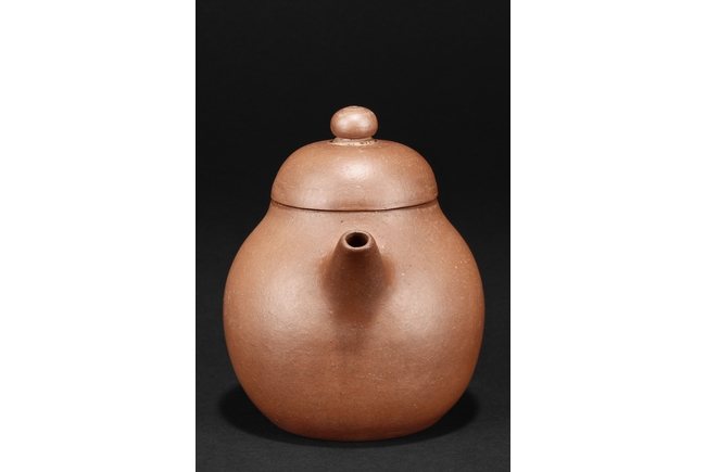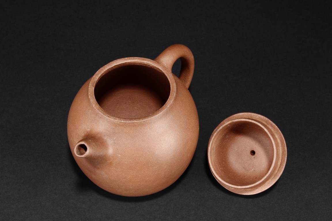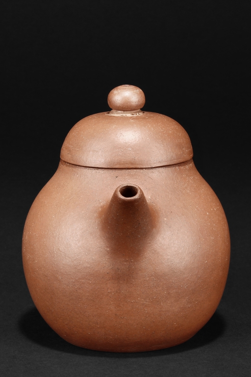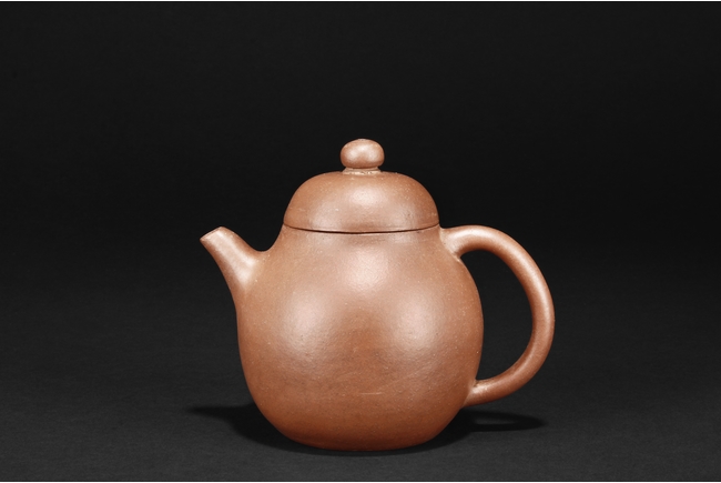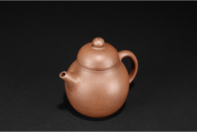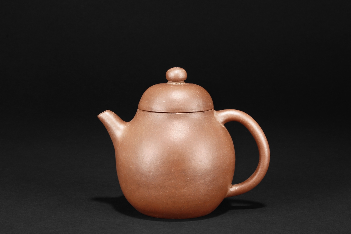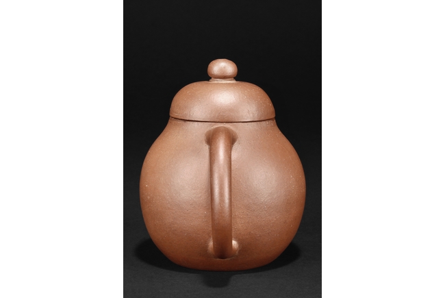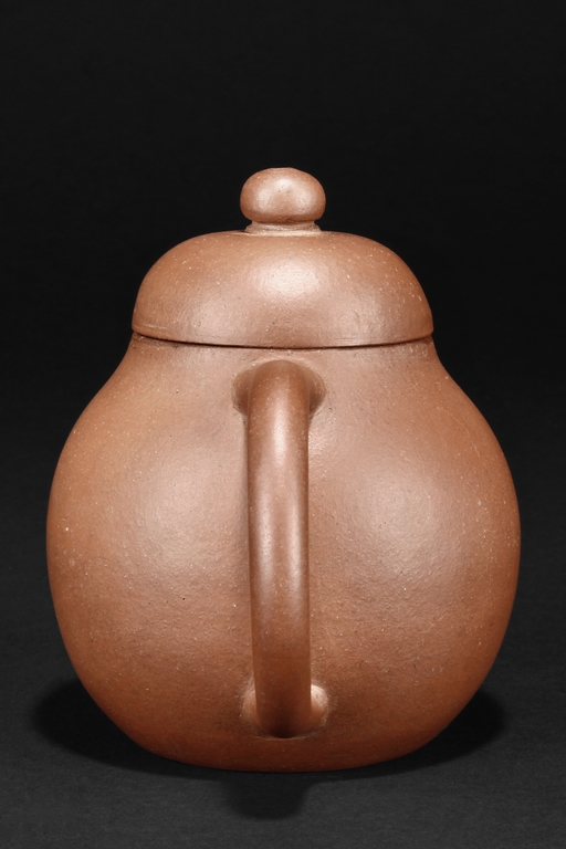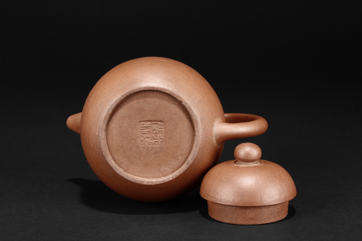 Of ovoid form, the teapot is similar in design to “Long Dan” teapots, with a short and tapering spout, large ear shaped handle, round ring foot, domed lid, and bead finial, the color of reddish-brown. The bottom bears four character mark “TIAN YUAN TANG ZHI”.