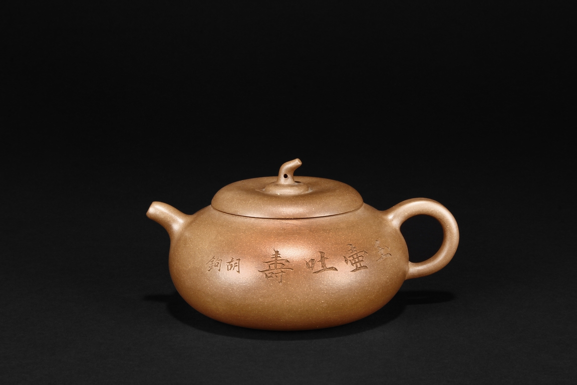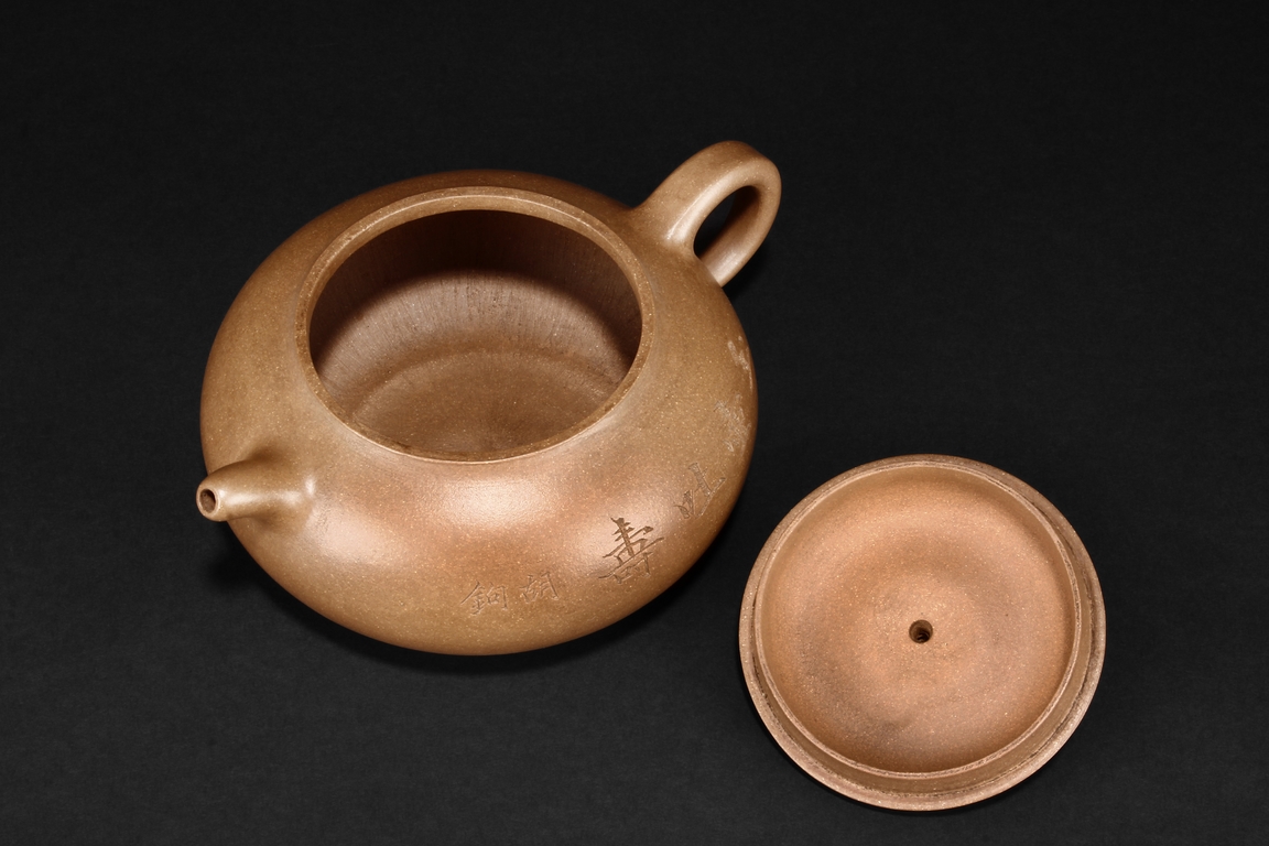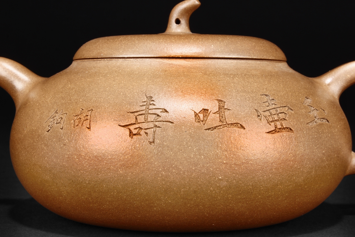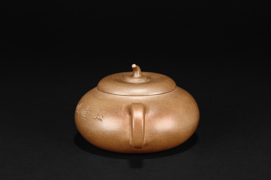 Of flattened ovoid form, the teapot features a short spout, C shaped handle, and a melon pedicel finial on top of an insertion style lid, the side incised with four character colophon and calligrapher signature “HU JU”, and two character “XINZHOU” mark beneath the handle.