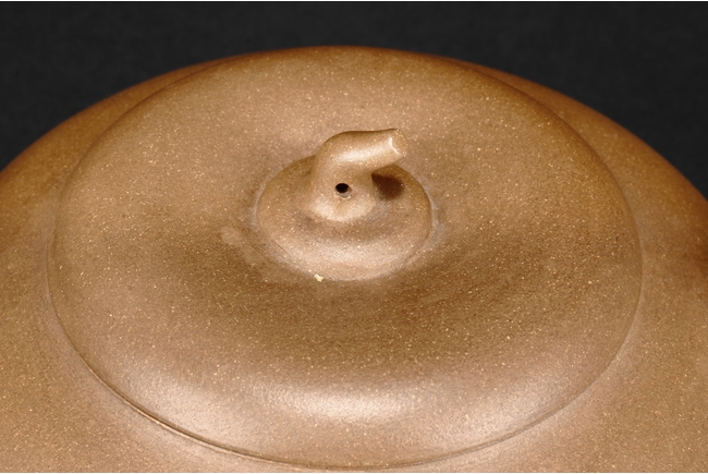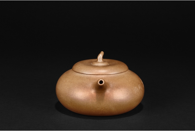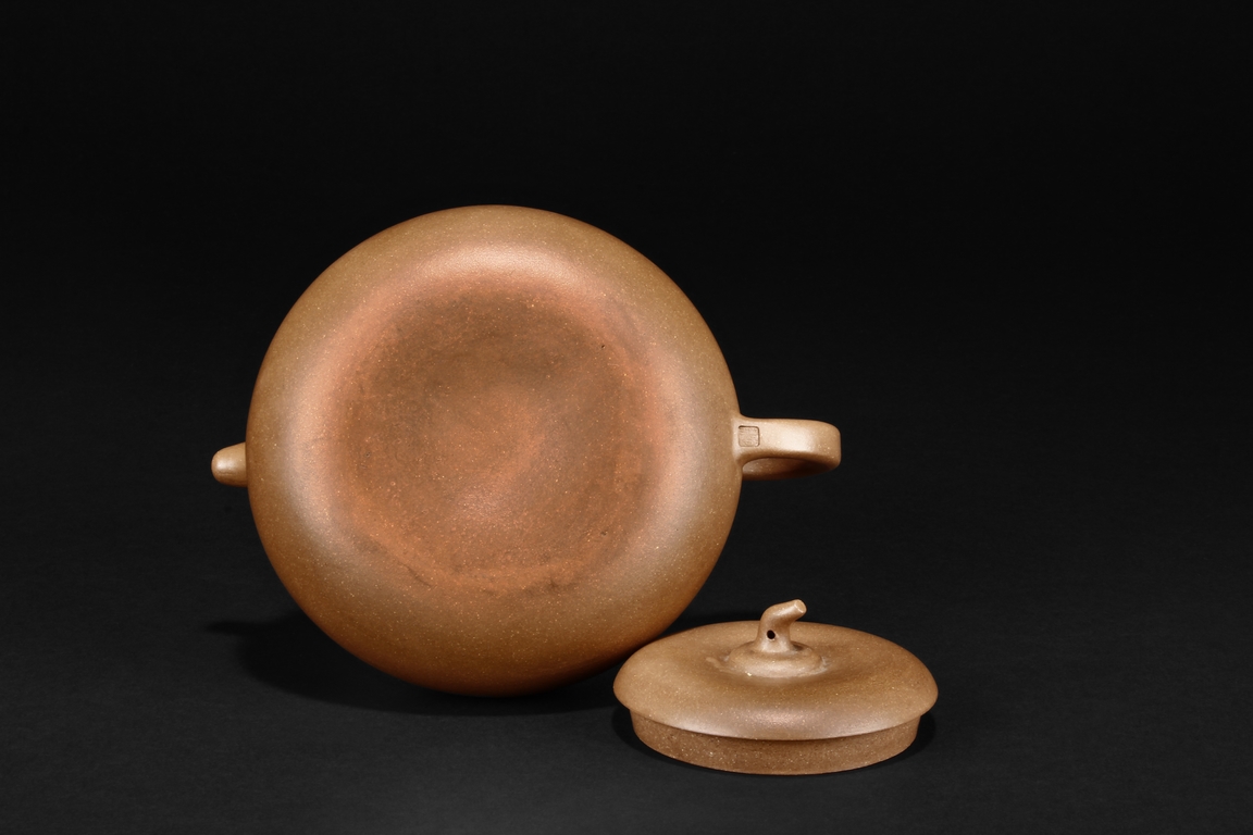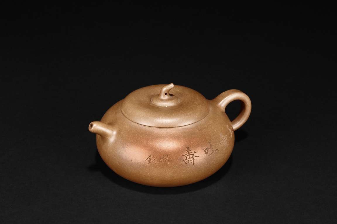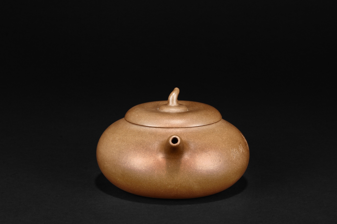Of flattened ovoid form, the teapot features a short spout, C shaped handle, and a melon pedicel finial on top of an insertion style lid, the side incised with four character colophon and calligrapher signature “HU JU”, and two character “XINZHOU” mark beneath the handle.