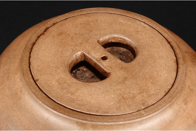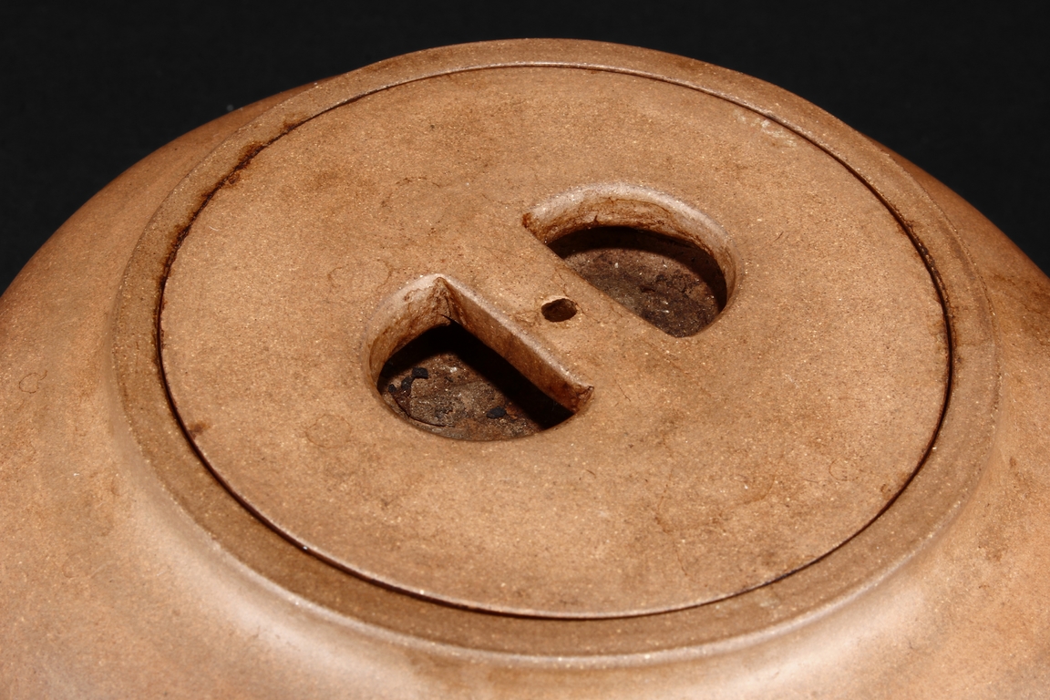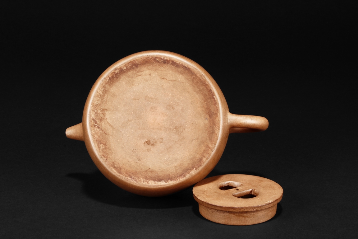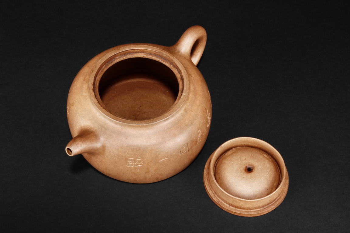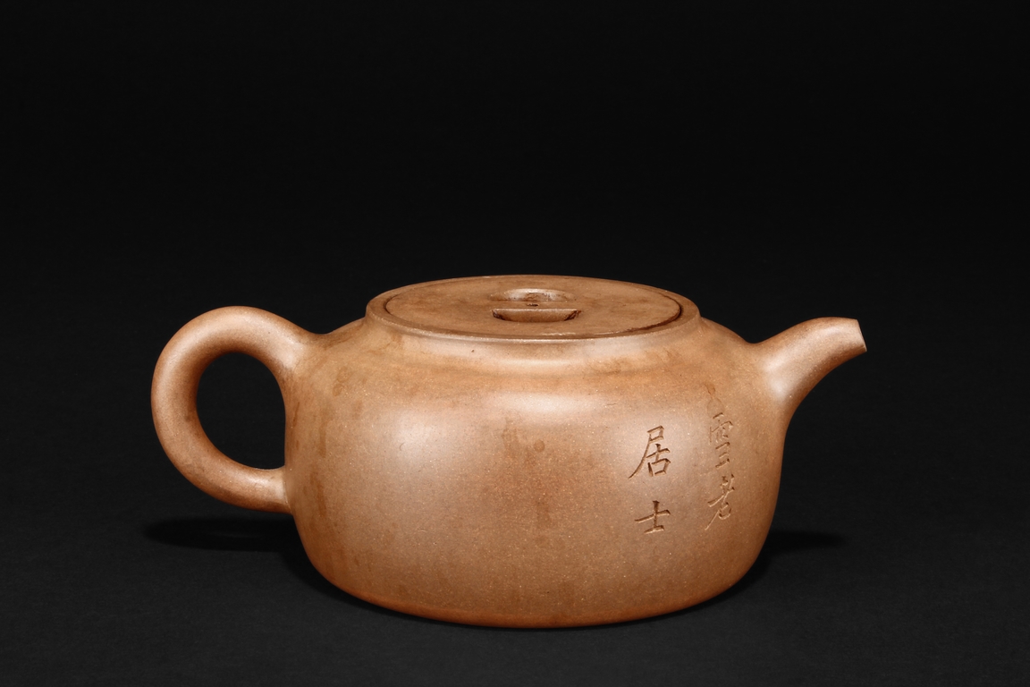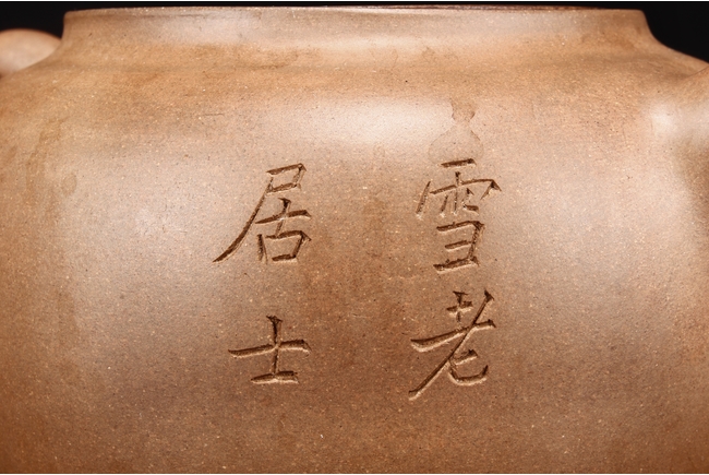 The teapot of rounded columnar form, with wide and smooth shoulders, the body incised with Chinese colophon by calligrapher “XUELAO JUSHI”, the lid with flat design and buffalo nose style finial. The teapot’s style, craftsmanship, material, and design all point to master teapot maker Wang Dongshi as the maker.